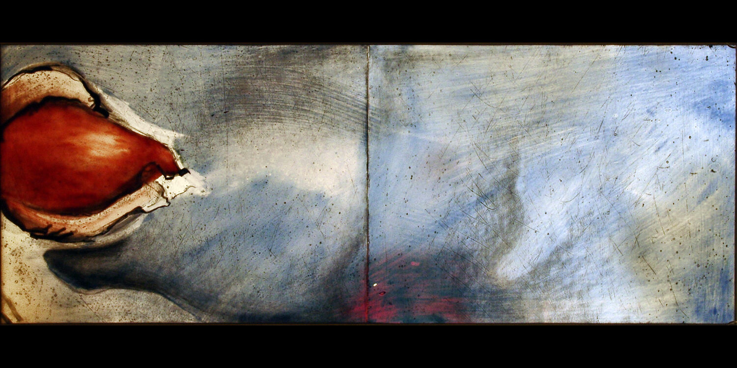 Successive airbrushing with opalescent vitreous enamels on glass.successive firing of paint washes to melt them to the glass.