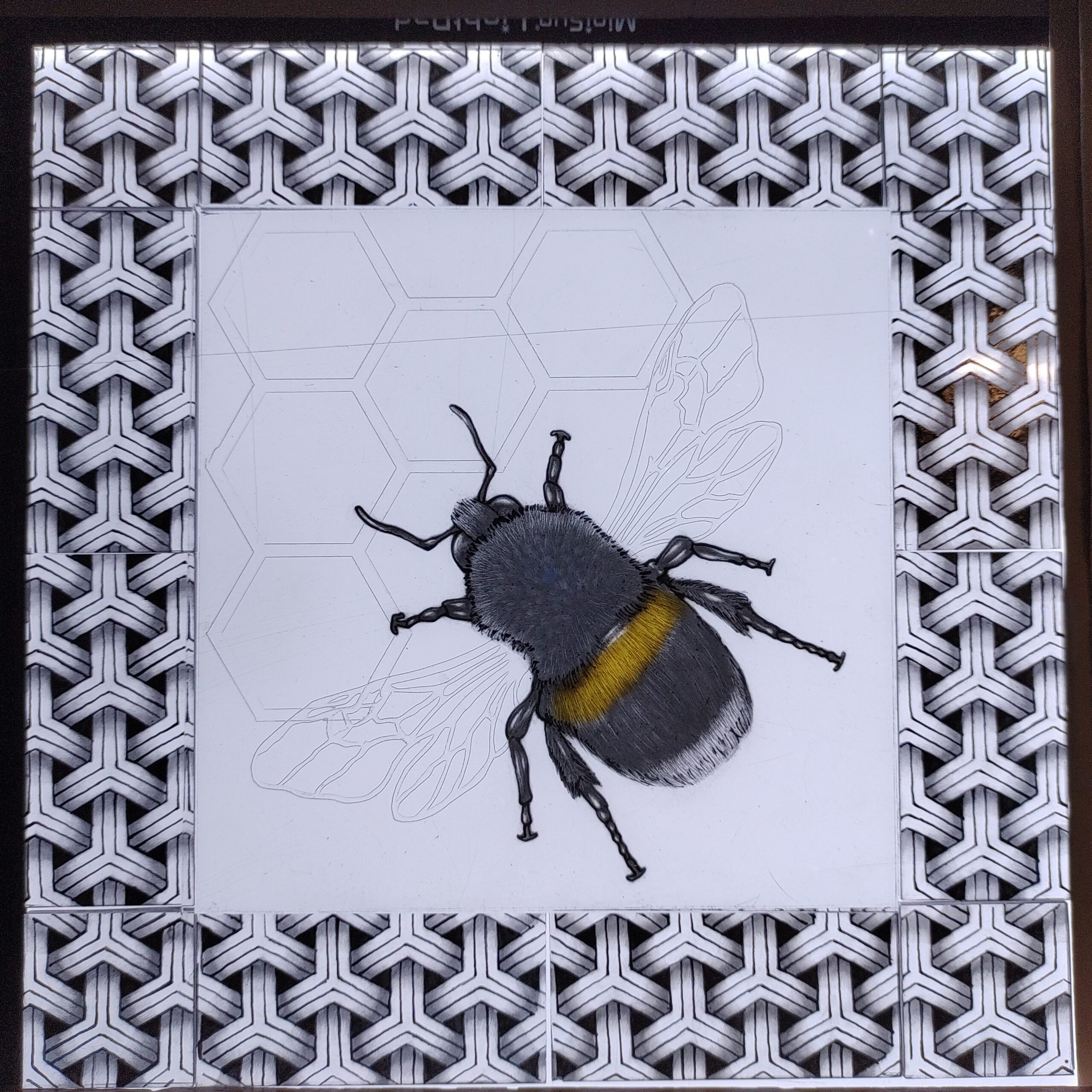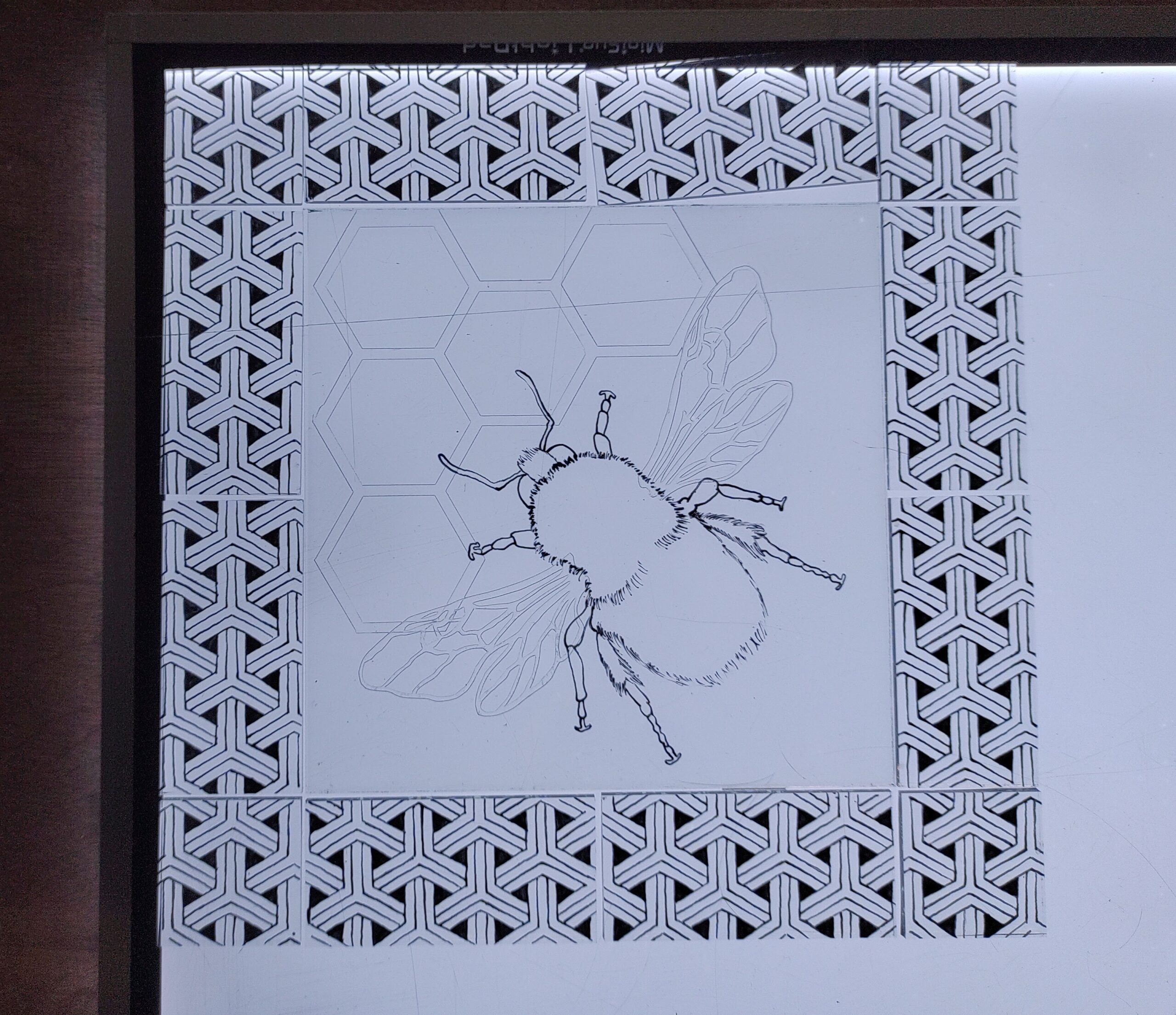 | The etched relief of the hive cells framework and the bees wings, demonstrated in entry #4, form the physical depth of the design, whereas further depth is created by using traditional high fire painting and silver staining methods. These will be embellished in entry #6. This entry demonstrates the process of painting and staining. I mostly use Reusche glass paints, but have a collection of other makes, all of which give me a varied palette to achieve various design outcomes. This design also uses silver stain, which was Oster’s Ancient Walpol. I used Reusche Tracing Black paint to paint the lines of the central bee and border designs. For the bee, I used a sable 00 brush, which allows good control of the brush tip and holds enough paint to allow good steady lines. For the hive border I used a pen nib. The border paint was mixed using oils, which results in a deeper black once fired, and is good for fine straight lines when The stain is applied to the none paint side so that the stain has good adhesion to the glass, and without any paint forming a barrier. The stain dries looking like a brown powder, and unlike glass paints or enamels, it retains this appearance after firing. Once the glass is cooled, the stained area is washed to remove the powder residue and reveals the golden yellow beneath. The bee was painted on the reverse side of the hive cell piece of etched glass. This created a 4mm depth |