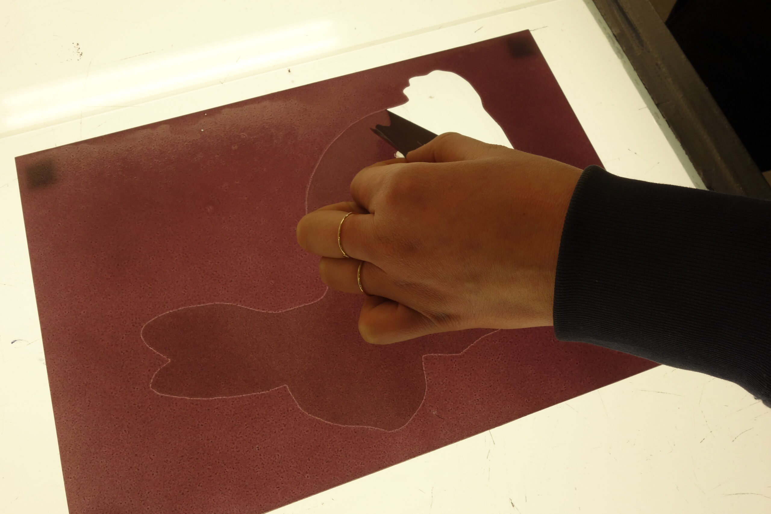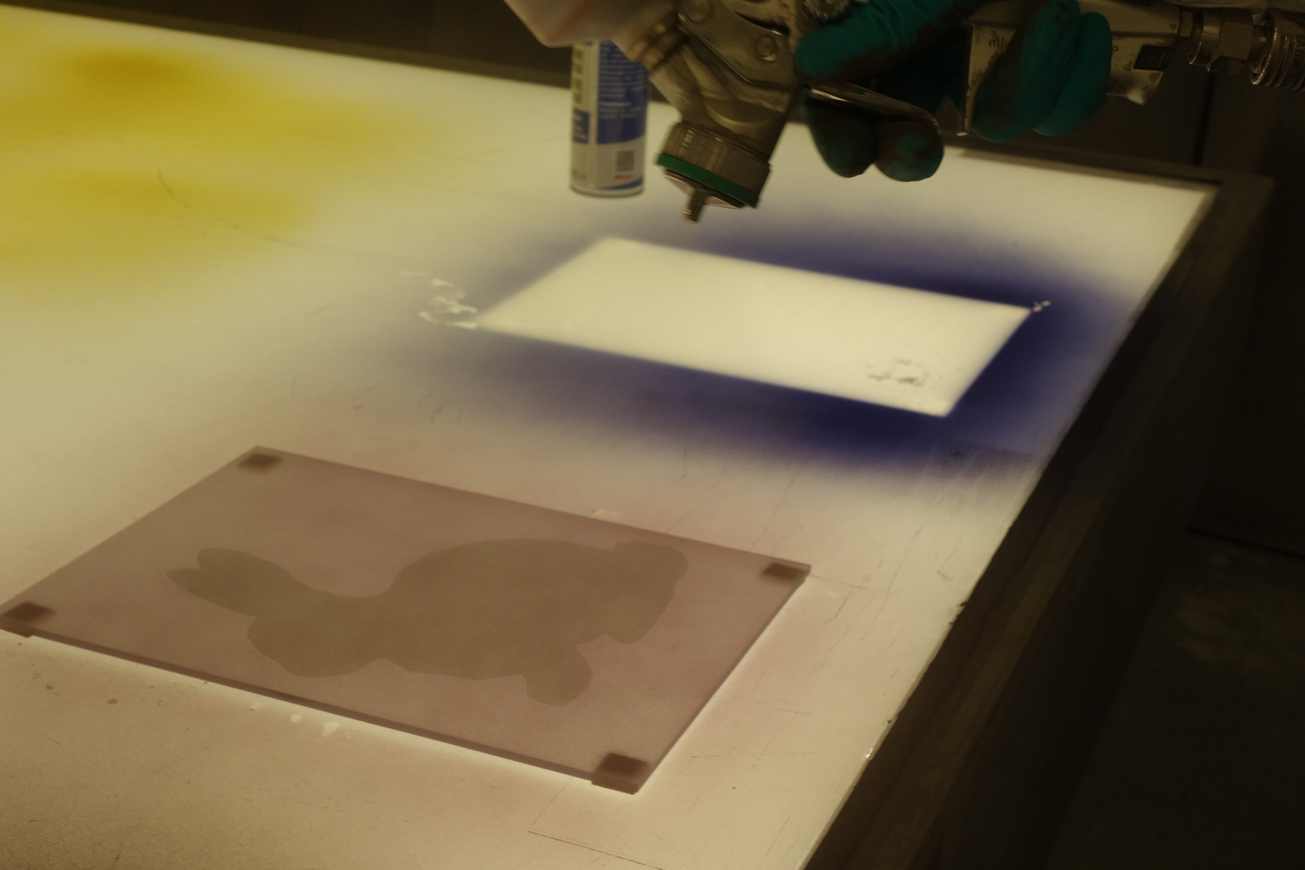 Spry in a regular way over the glass to get an egal layer. Take away the foil and place the glass in the kiln to fire the paint for 600°C.