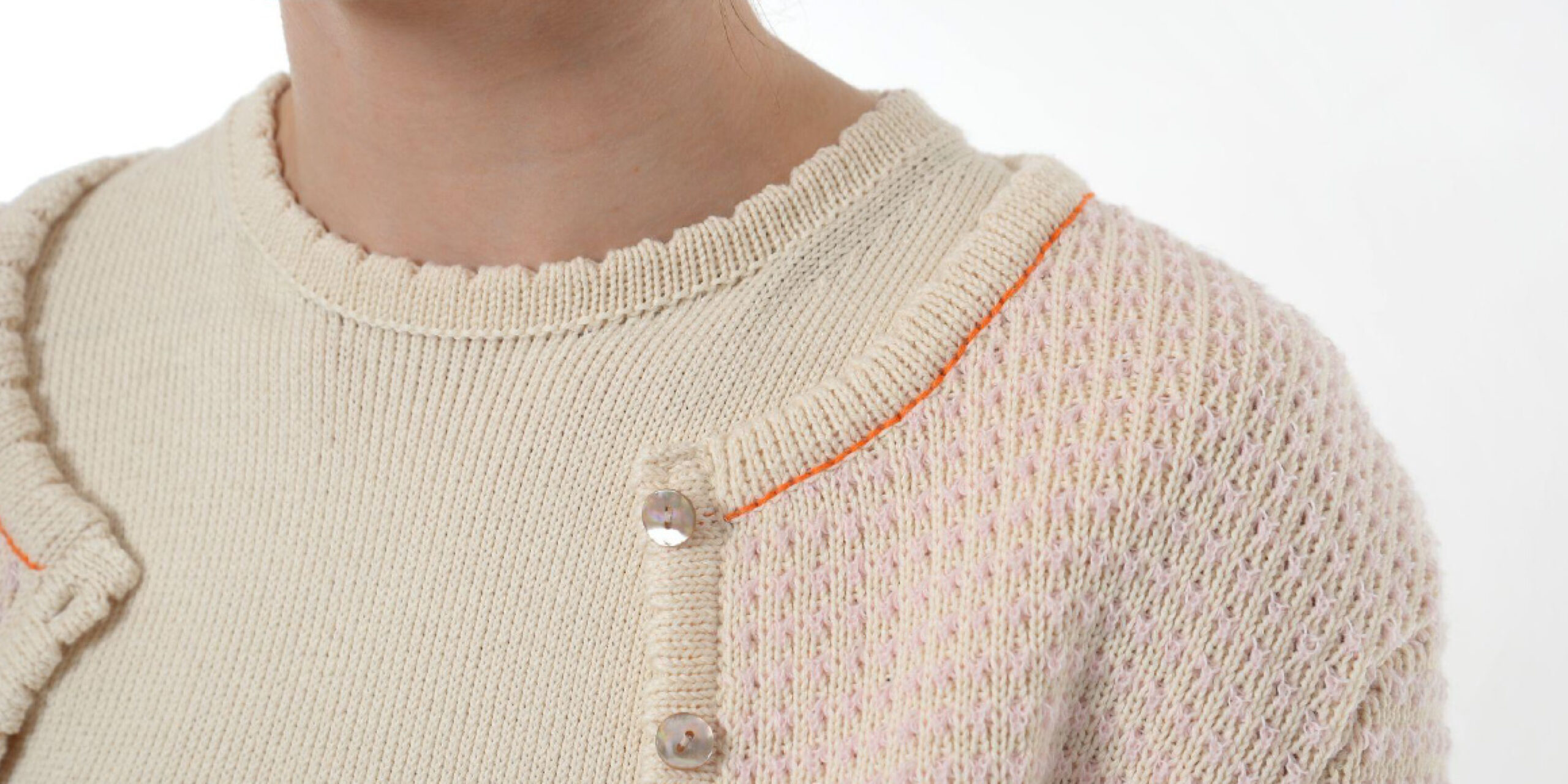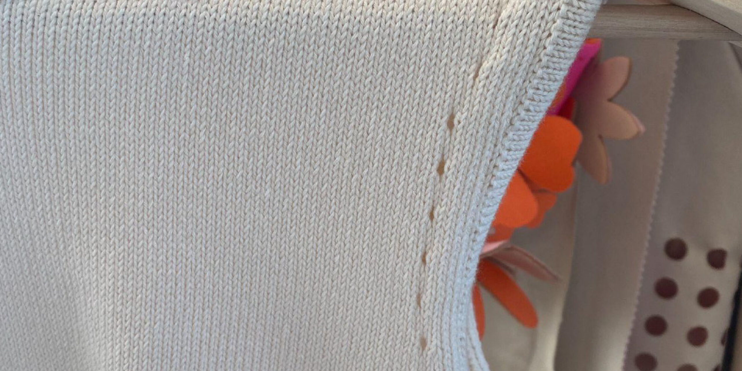 Fully fashioned knit top – lace hole details outline the armhole. Picot edge surround the neckline. 100% Italian cotton yarn