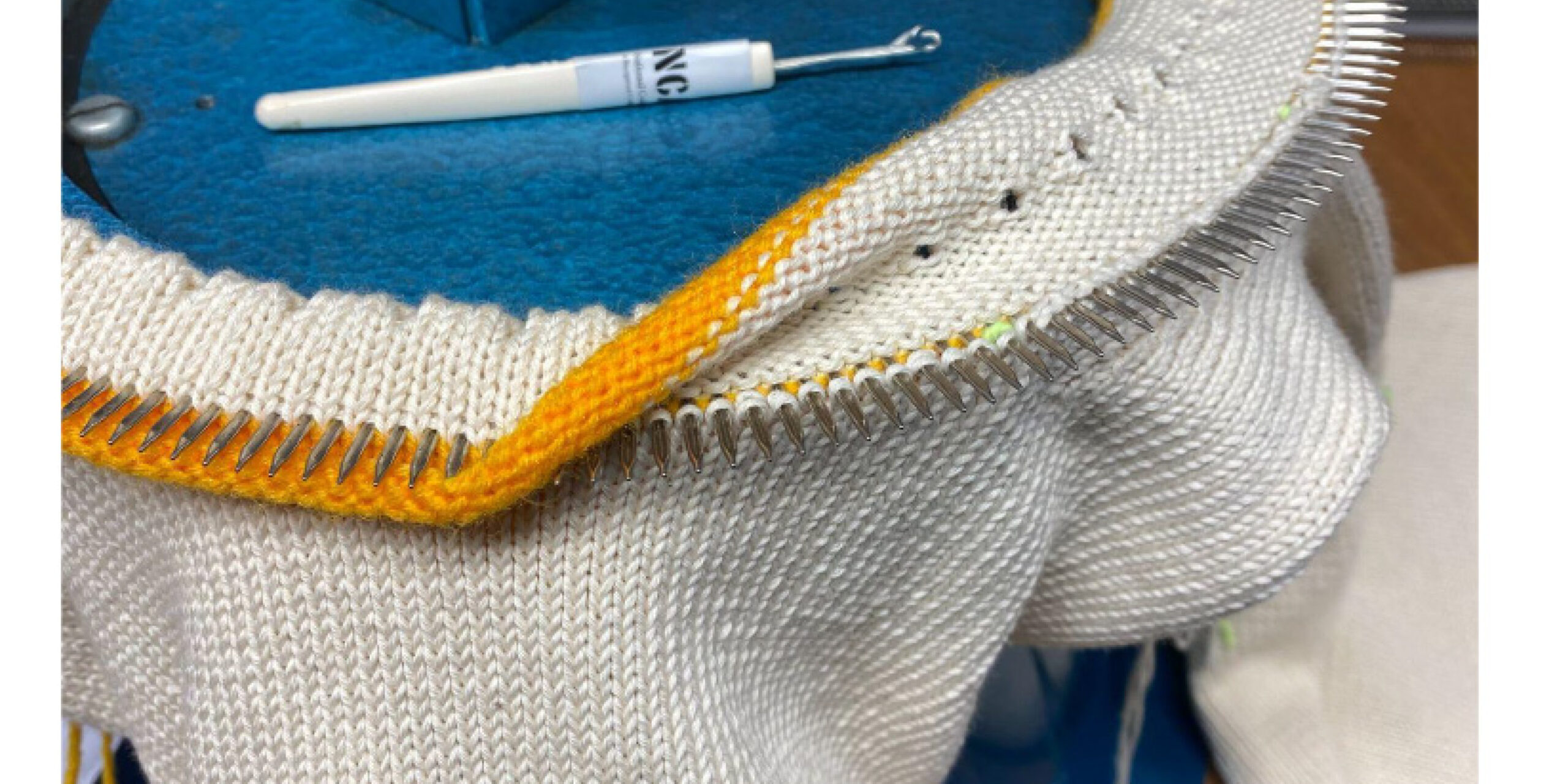 Fully Fashioned Knit top with lace holes details surrounding the arm holes. Picot edge around neckline.
