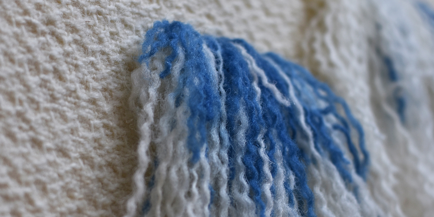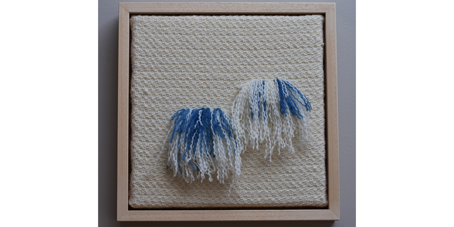 The process of this material was firstly sourcing the natural dye materials and then hand-dying the Irish wool yarn using Indigo and Log-wood. I then set up the loom using 8 shafts and a straight draft on an ARM Touch 60 loom. The width of the warp is 14” and it has 28epi. I used a 1ply yarn from Galway wool for the warp and the weft used a 2ply yarn from Galway wool. The textured sheep bums were created by tying and knotting strands of the 2ply yarn to the warp threads when certain shafts were lifted and were secured by a weft yarn in between each row. Once the weaving was complete the samples were cut off the loom and stitched to secure the edges before being mounted to the canvas. Once framed the 2ply wool strands of the sheep bum element were unravelled to create the fluffy, crinkled texture just like the bodies of the sheep.