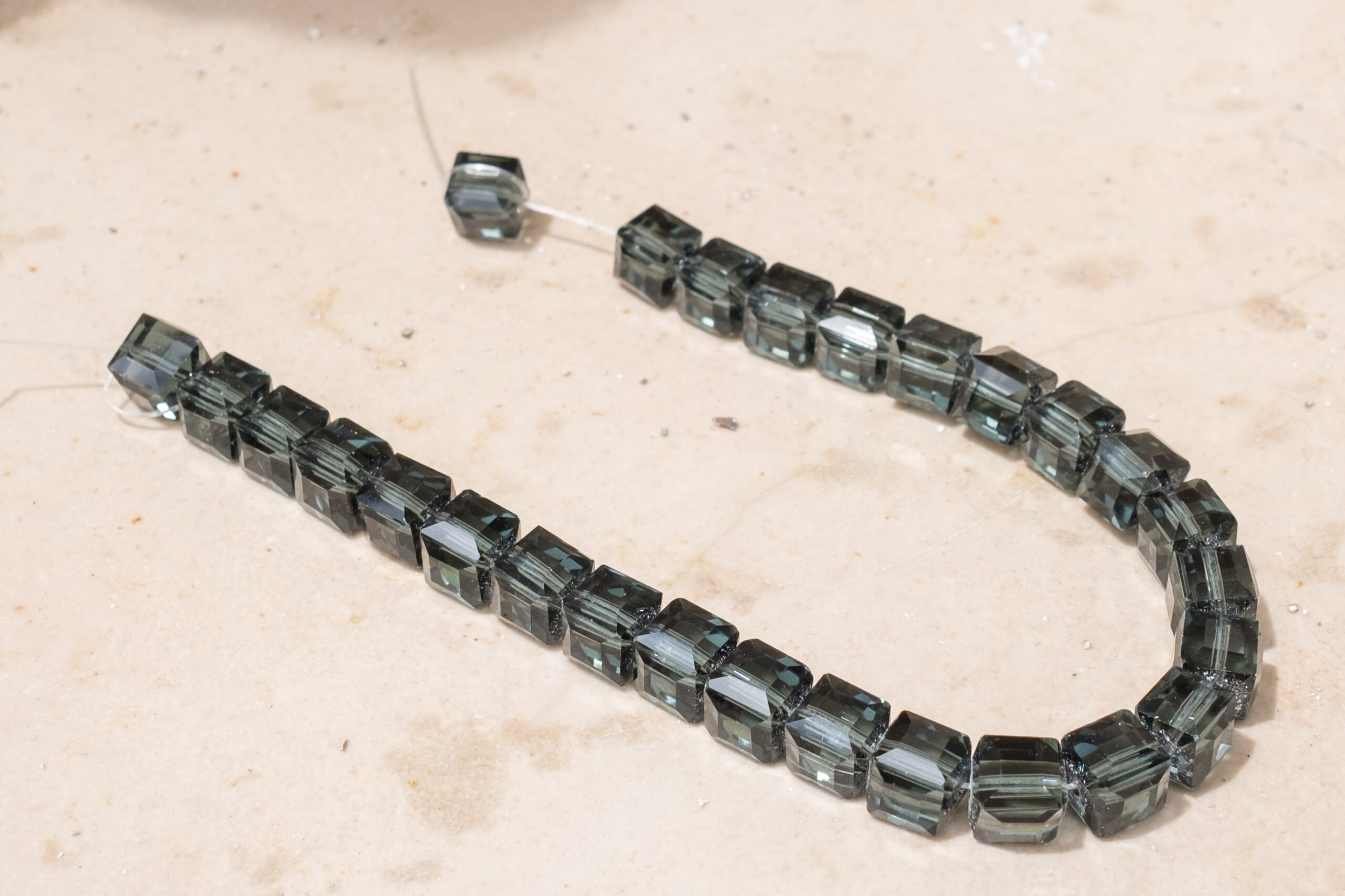 1 aluminum choice 2 molding 3 thread copper wire into glass cubes and wrap around base 4 chain choice 5 completion with hook