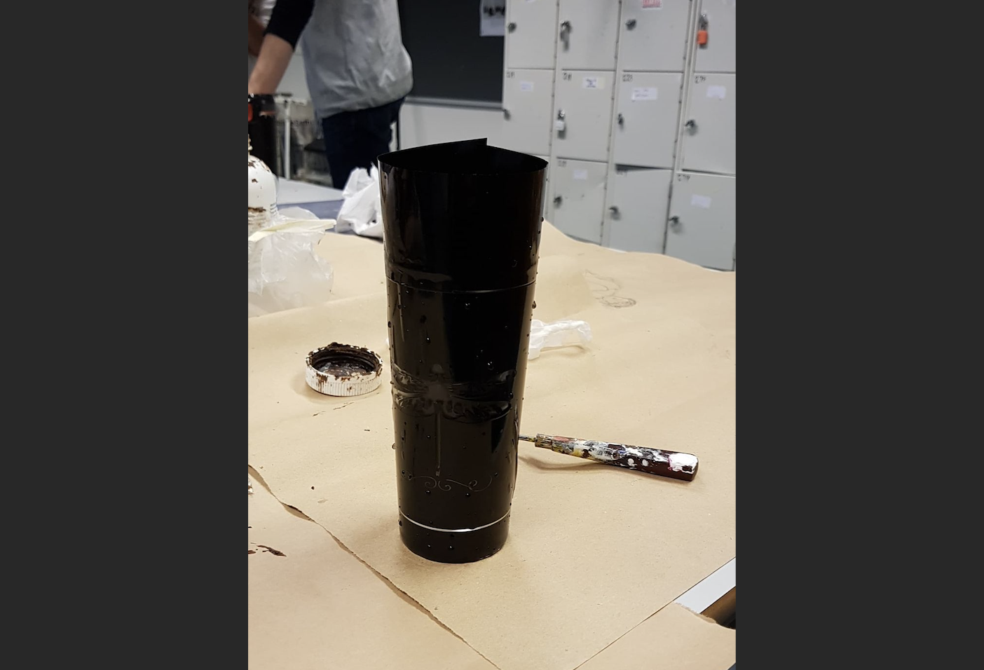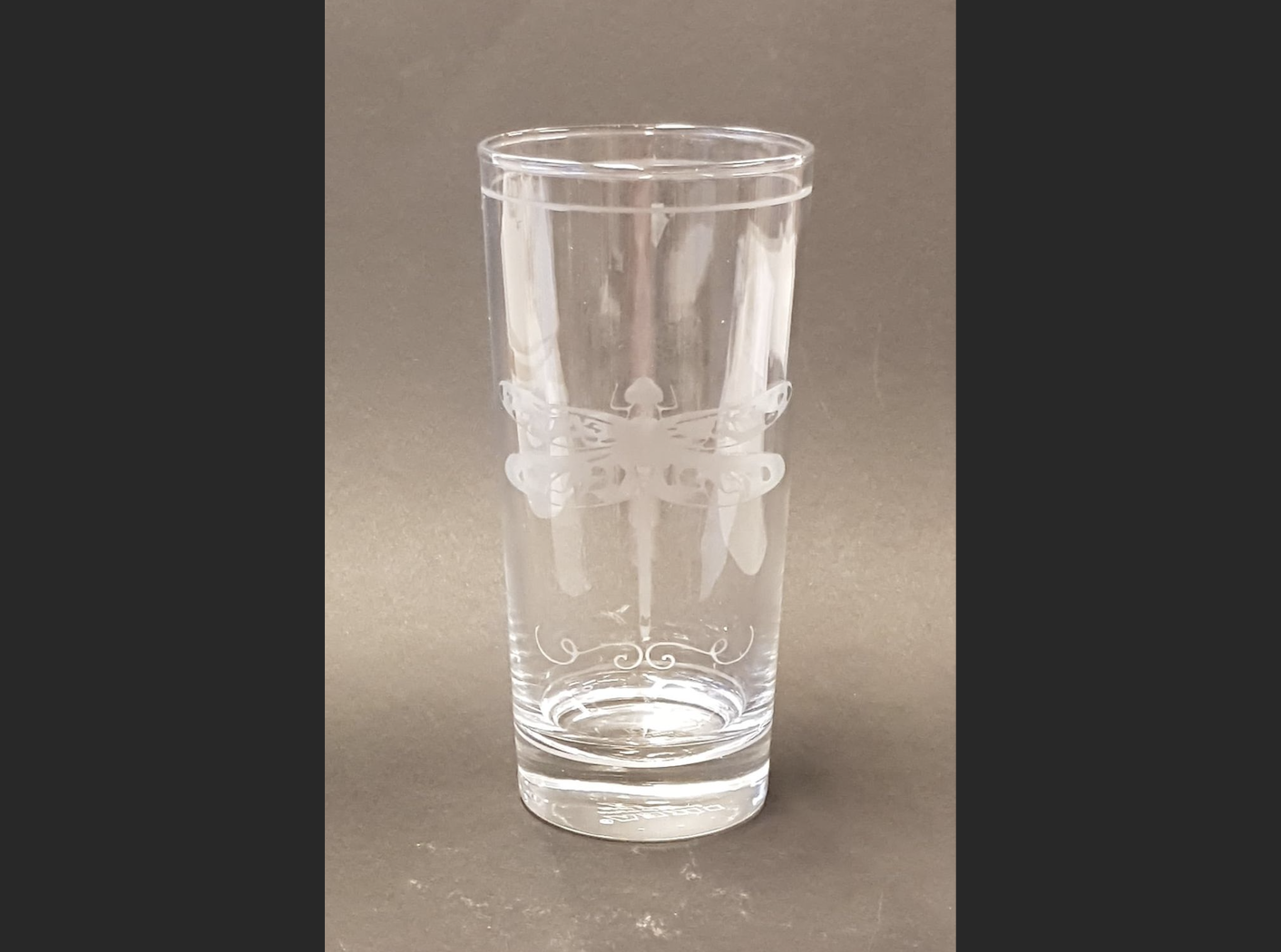 I experimented with etching intricate motives in glass surfaces. The stencil was made from a vector drawing, cut out of vinyl by a CNC cutter. An etching cream was applied over the stencil to etch the motive of a dragonfly into the glass.
