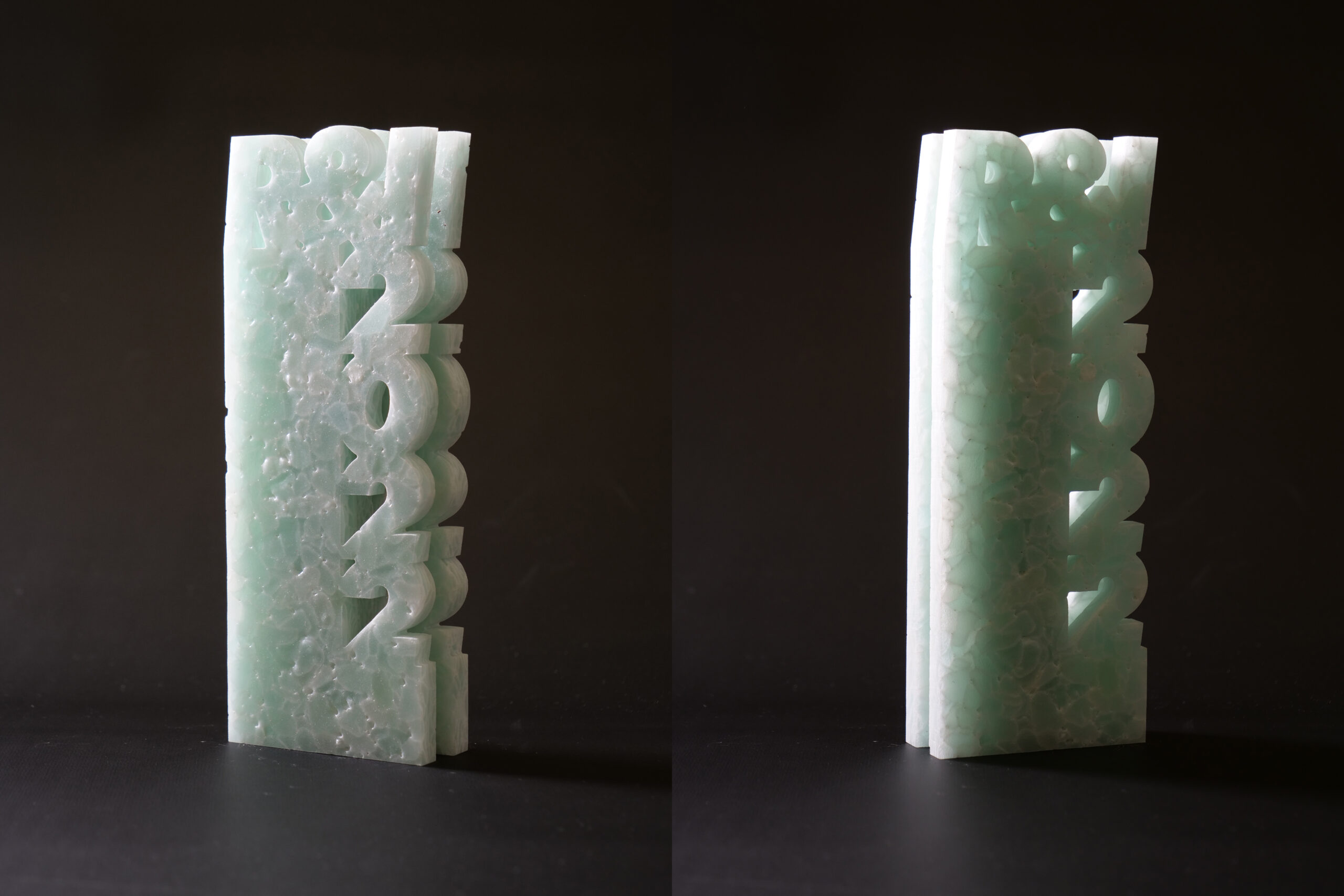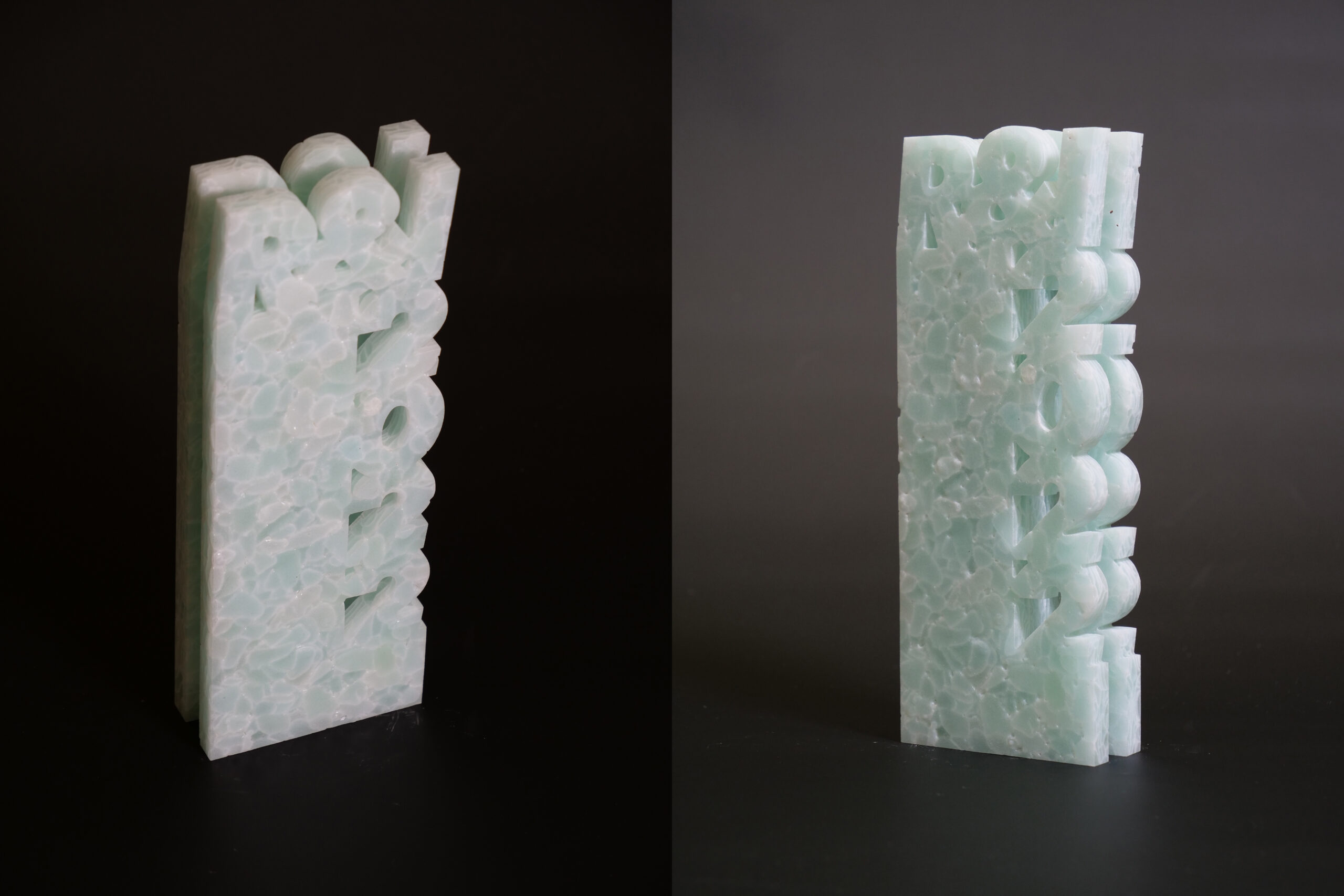 The glass undergoes a special firing schedule that transforms the glass from a glassy transparent material into a crystalline material that looks and behaves more like a stone or a ceramic material. The glass material is still hydrophobic and does not absorb any water. It is no longer transparent but has aesthetic features that can be semi-transparent.