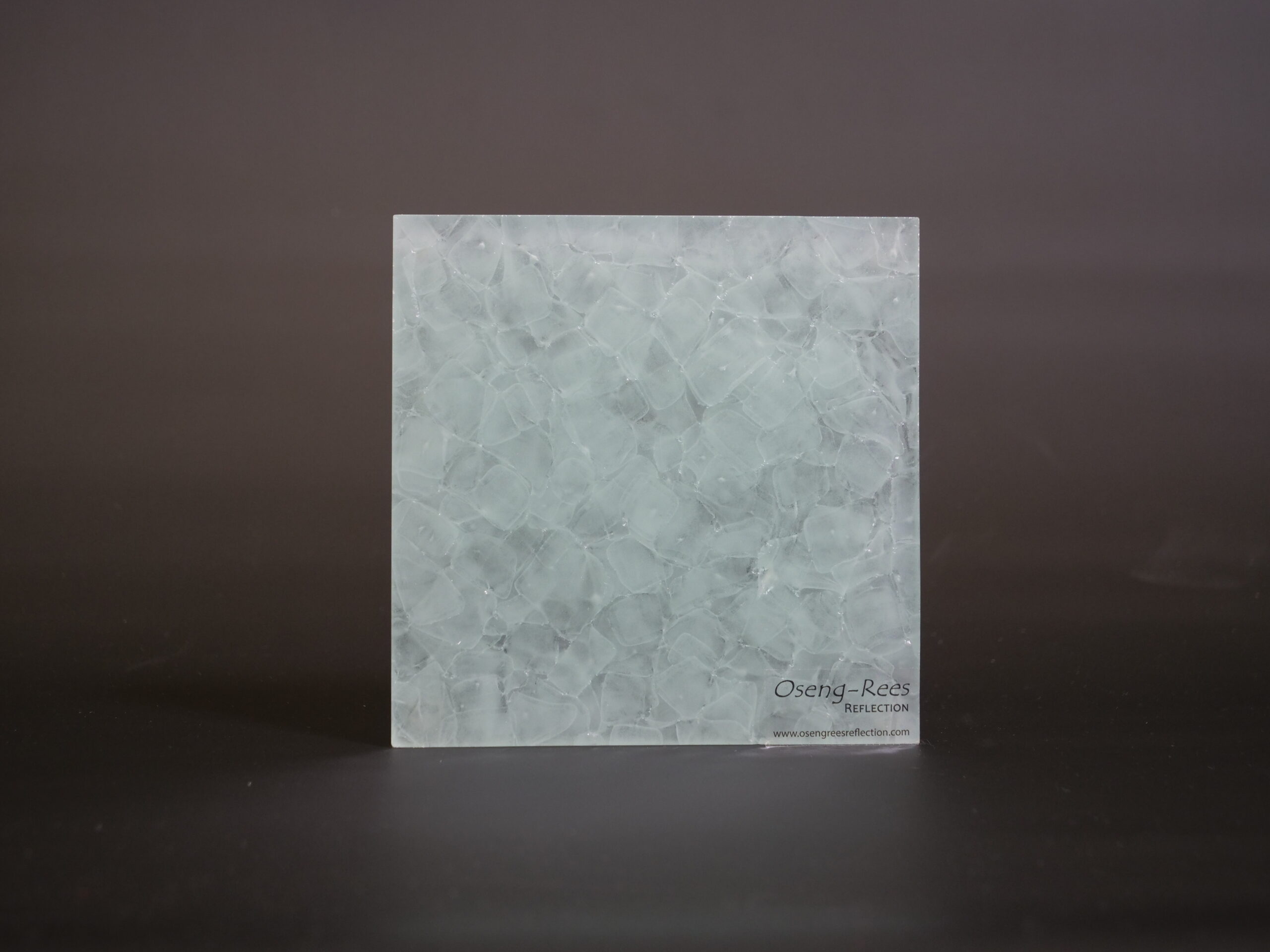 The glass undergoes a special firing schedule that transforms the glass from a glassy transparent material into a crystalline material that looks and behaves more like a stone or a ceramic material. The glass material is still hydrophobic and does not absorb any water. It is no longer transparent but has aesthetic features that can be semi-transparent.