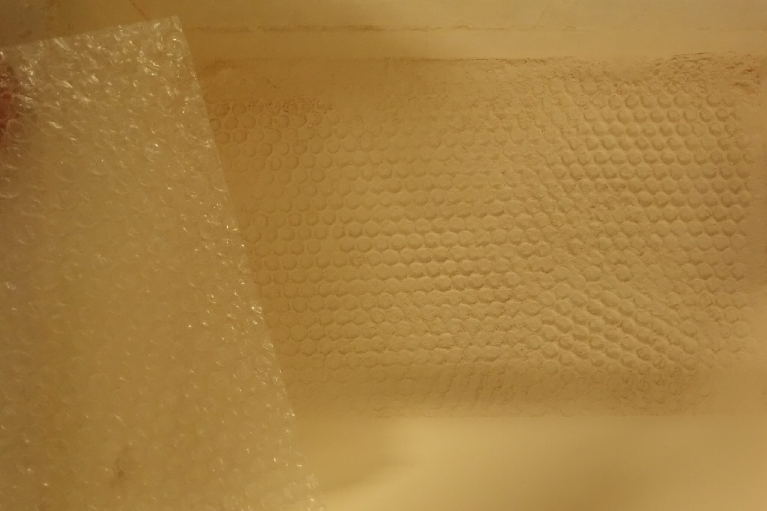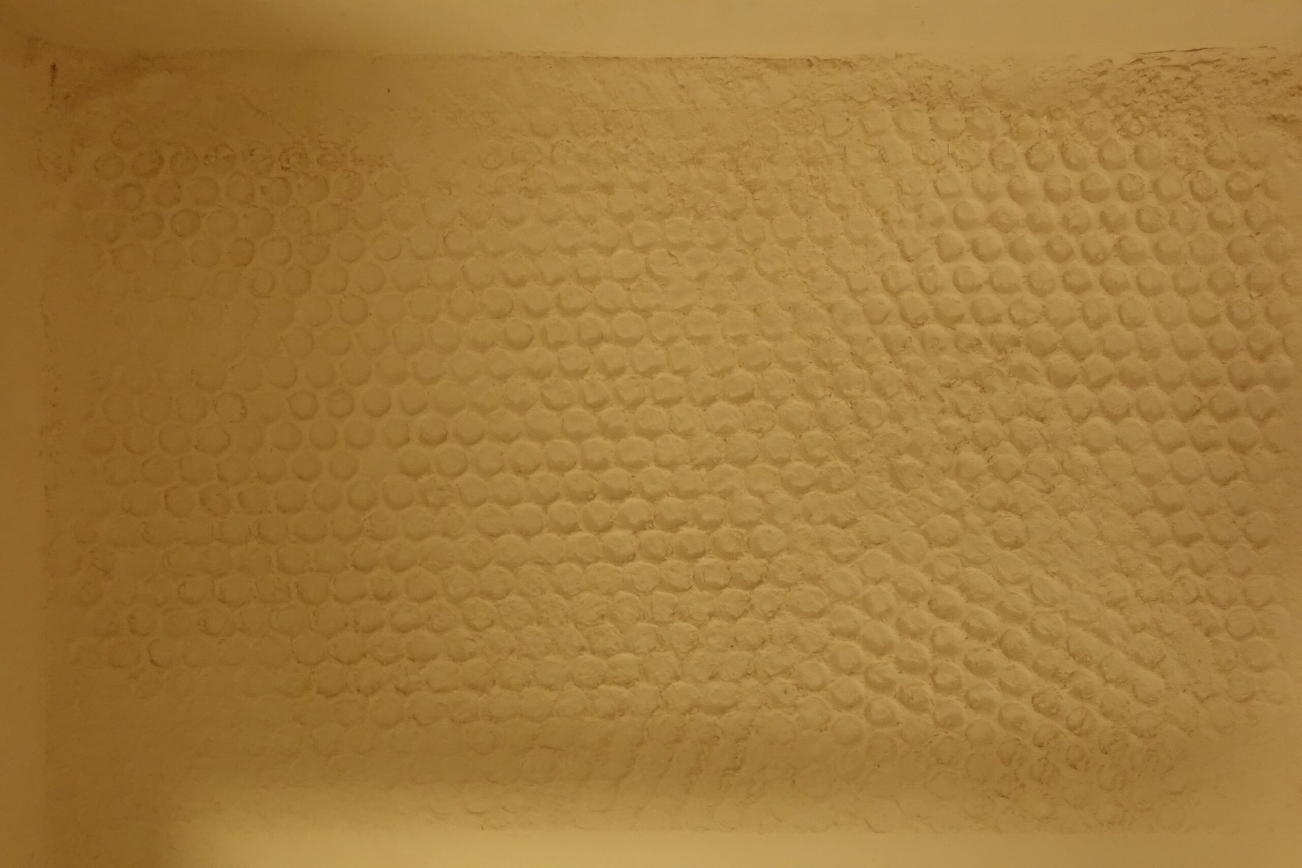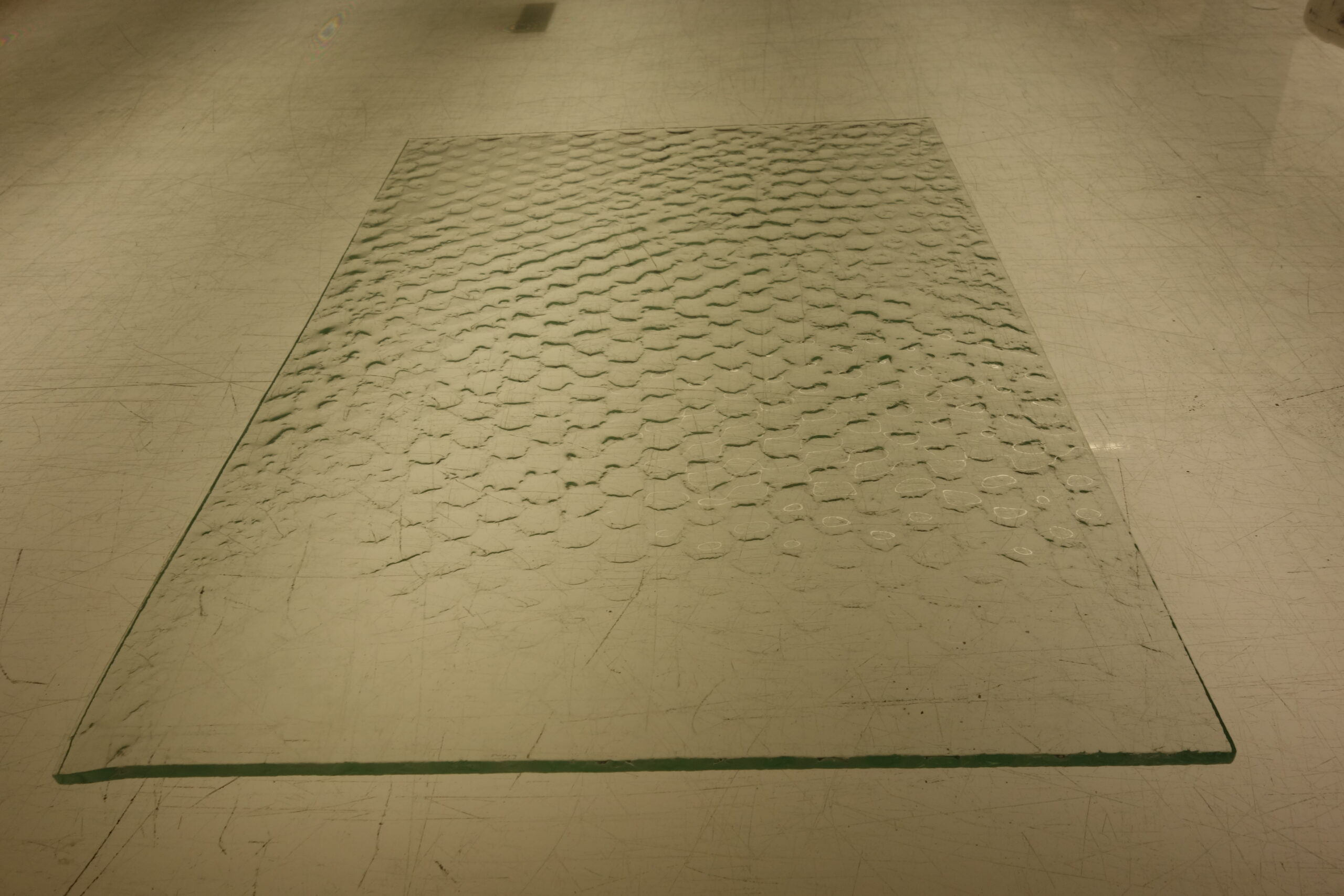 First I sprinkled plaster into the oven with a sieve and then I pulled the plaster straight. After that I took a bubble wrap and pressed it into the smooth plaster and created an orderly pattern of bubbles. Then put it in the oven at about 780°C. At the end the glass had bubble structure.