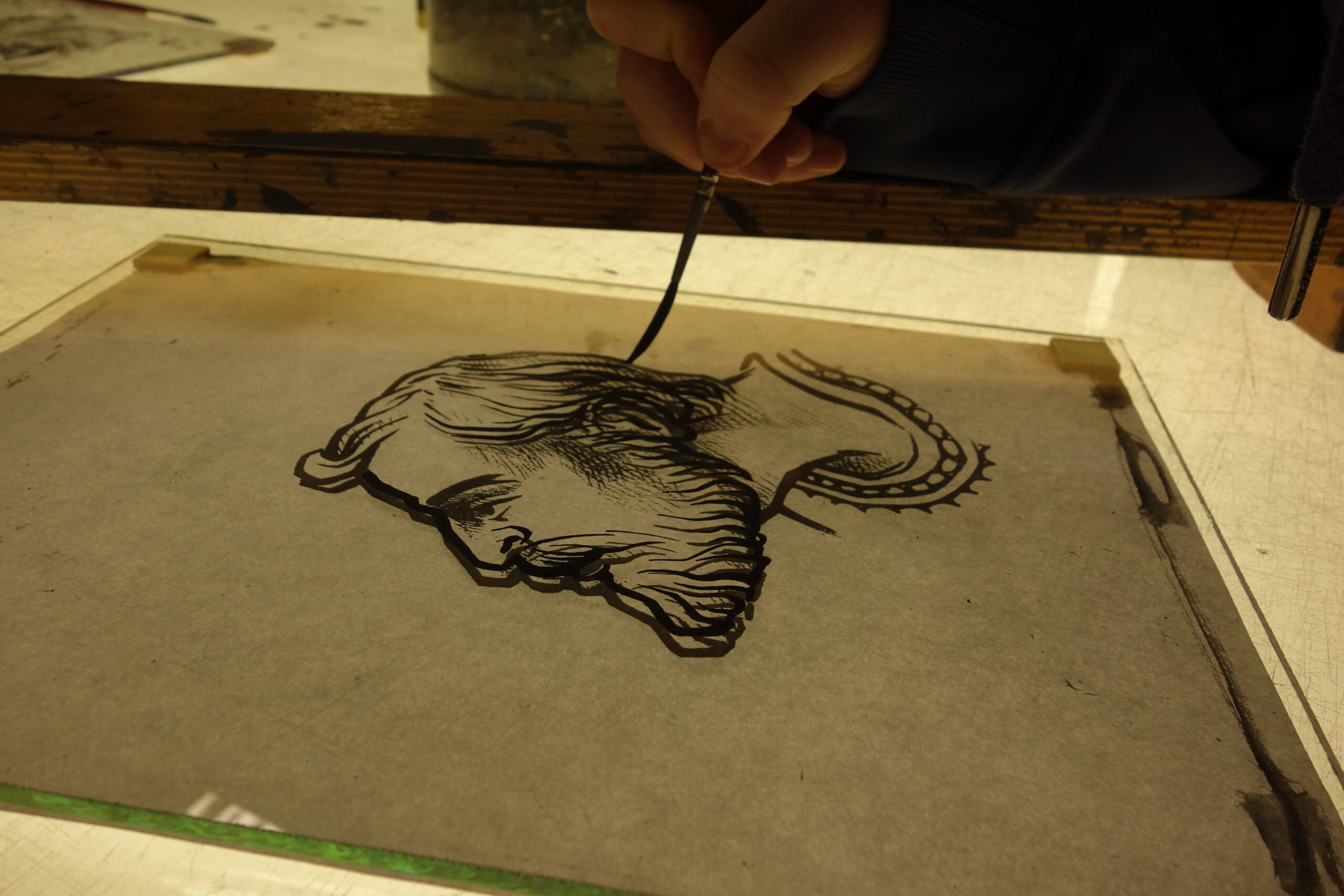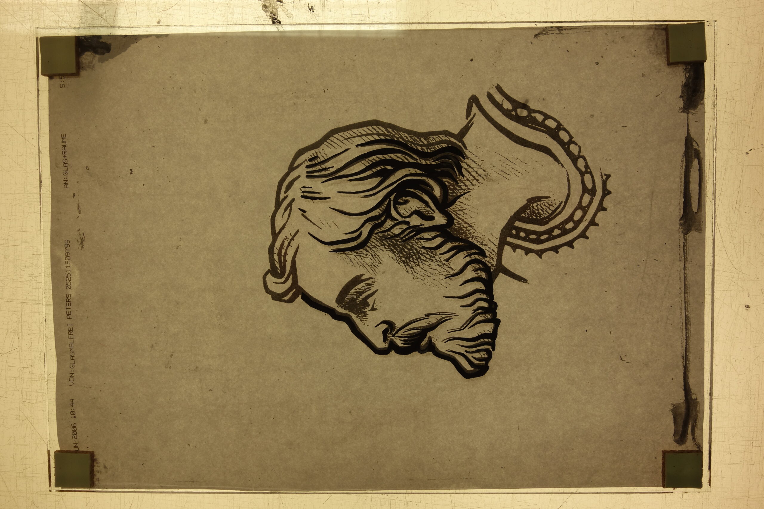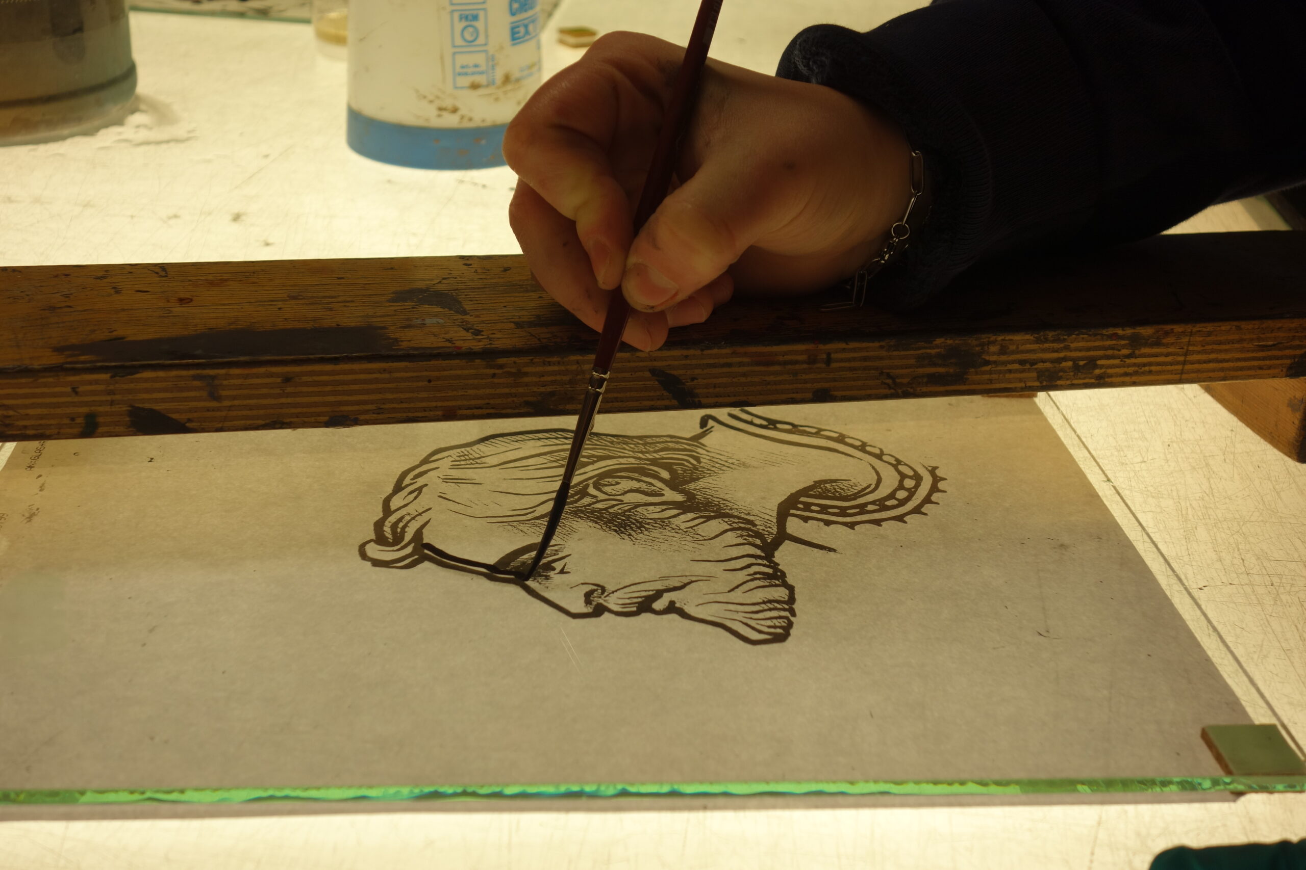 Mixing the glasspaintpowder with arabic gum and water. Application with a dragbrush for long lines.
