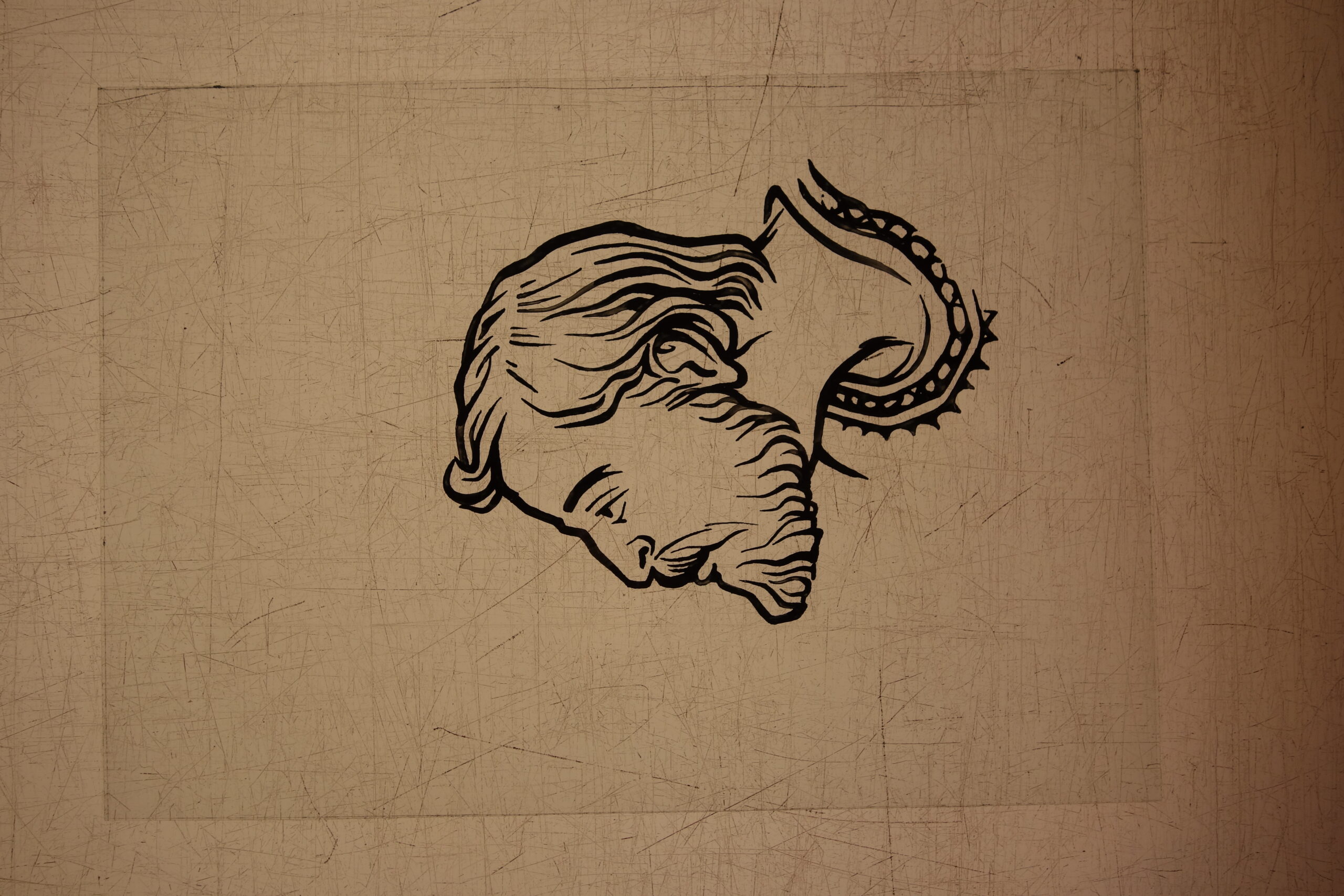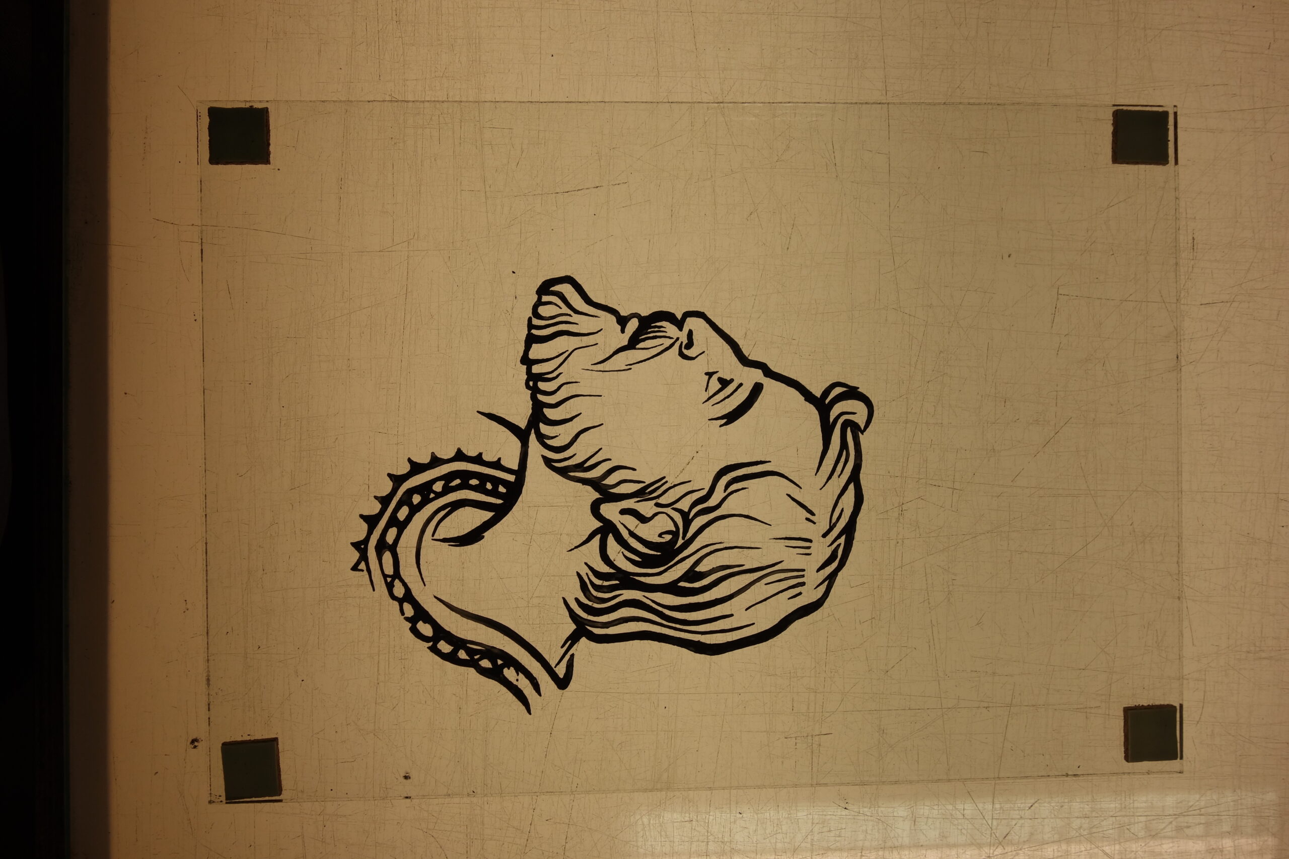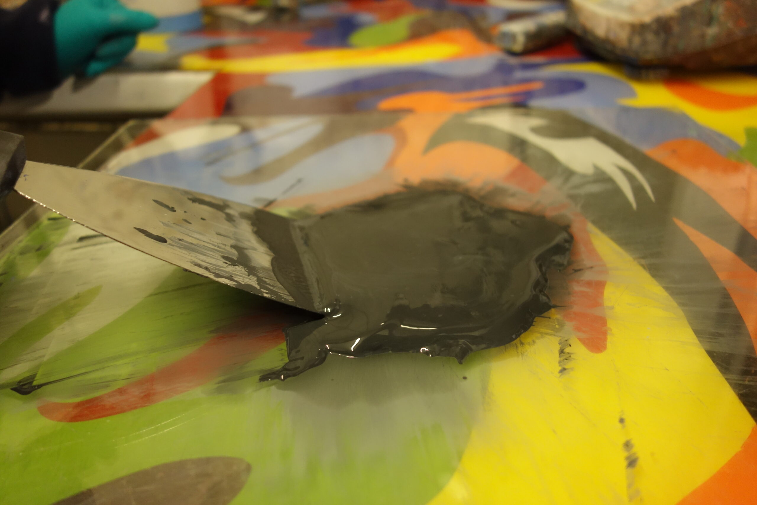 Mixing the glasspaintpowder with arabic gum and water. Application with a dragbrush for long lines.
