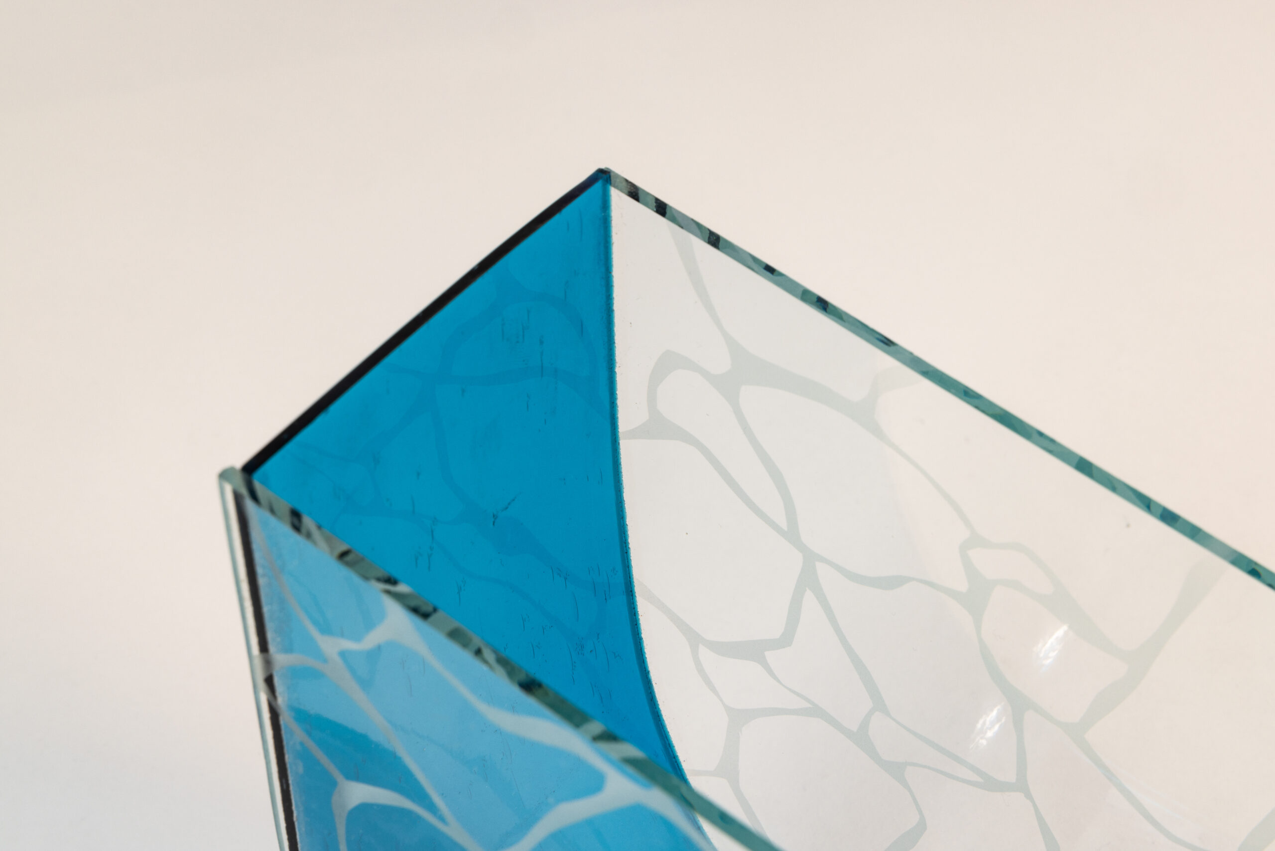 - Blue 3mm glass, curved by balancing the glass over a former in the kiln. Then subjecting it to a long, slow firing between 580ºC – 610ºC.