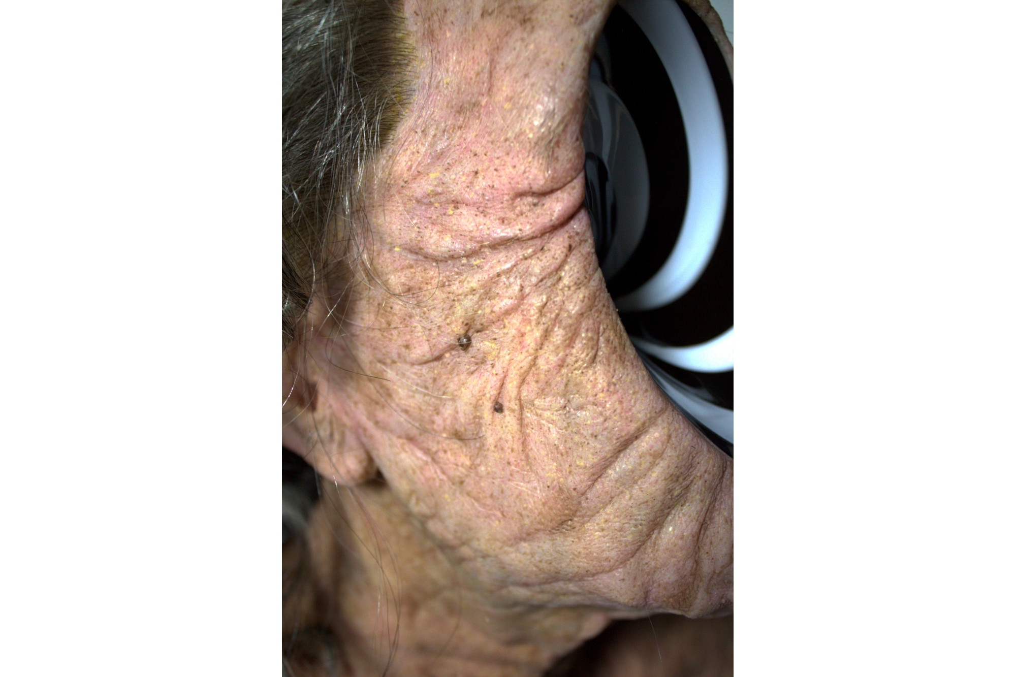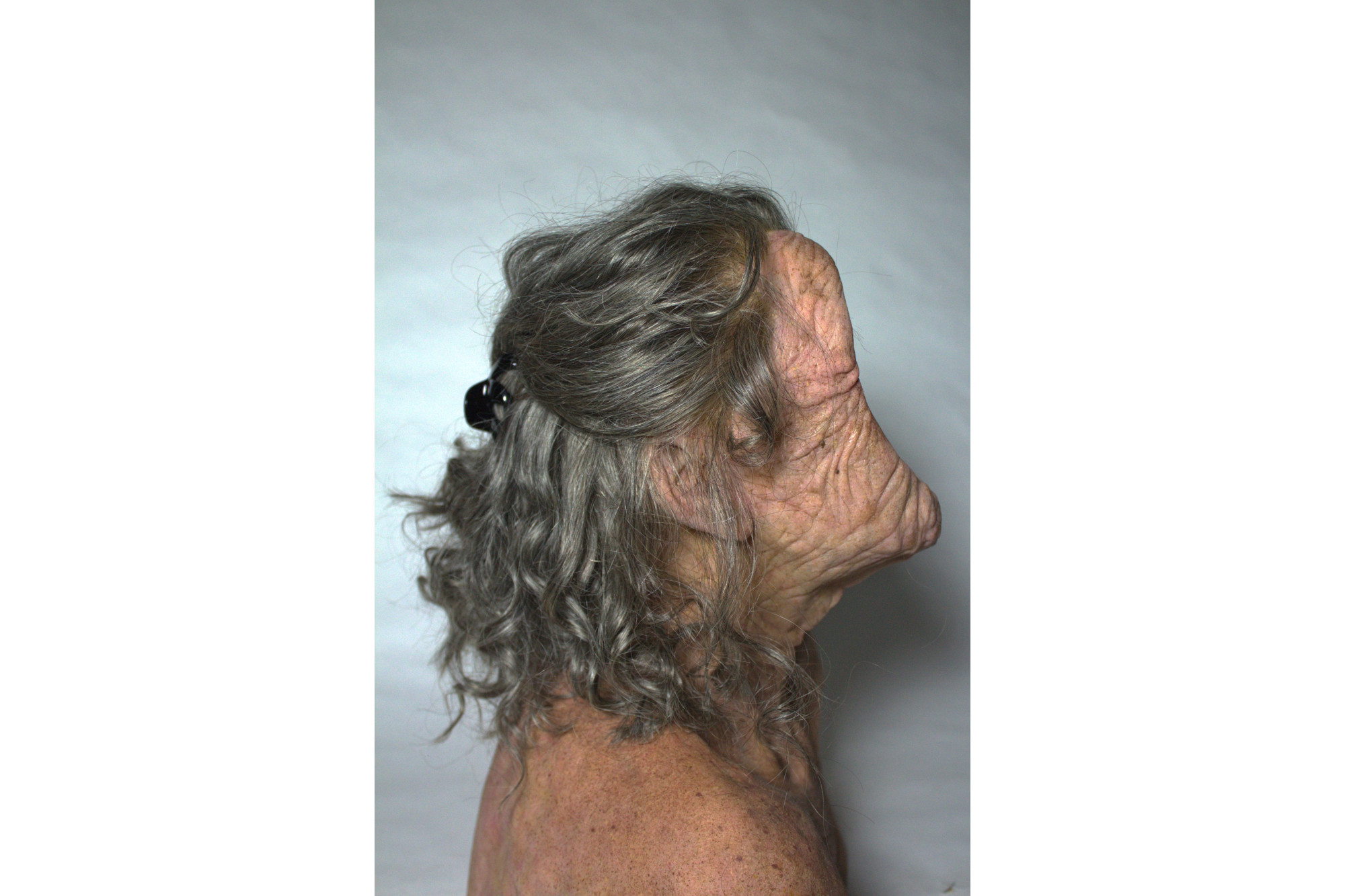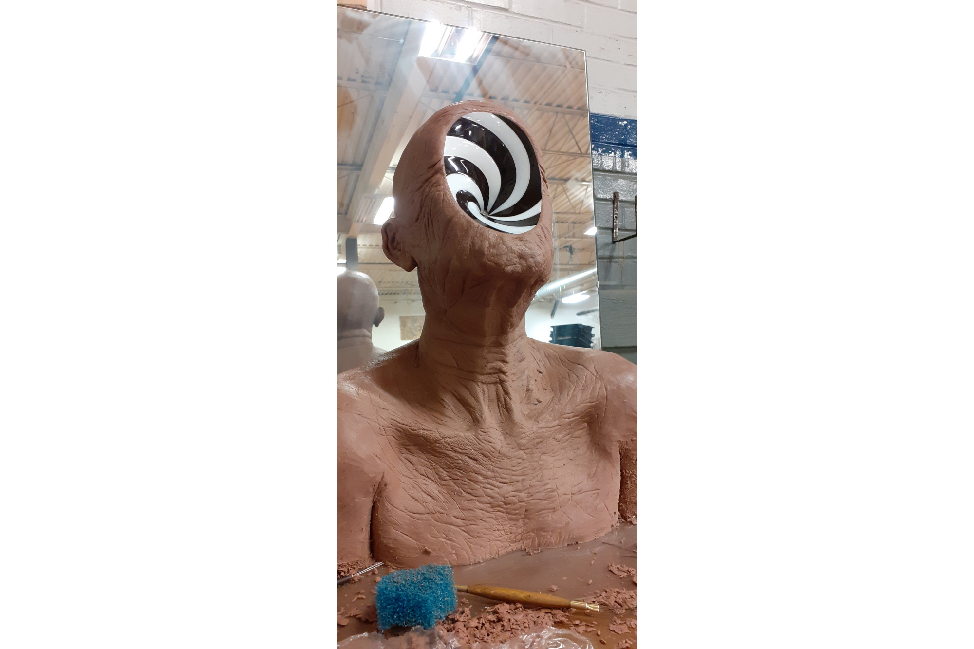 After creating my cane-worked, glass inclusion in the hot-shop, I cut and grind it when it’s cold to fit into the facial area of the hyper-real, plasticine bust I have sculpted.