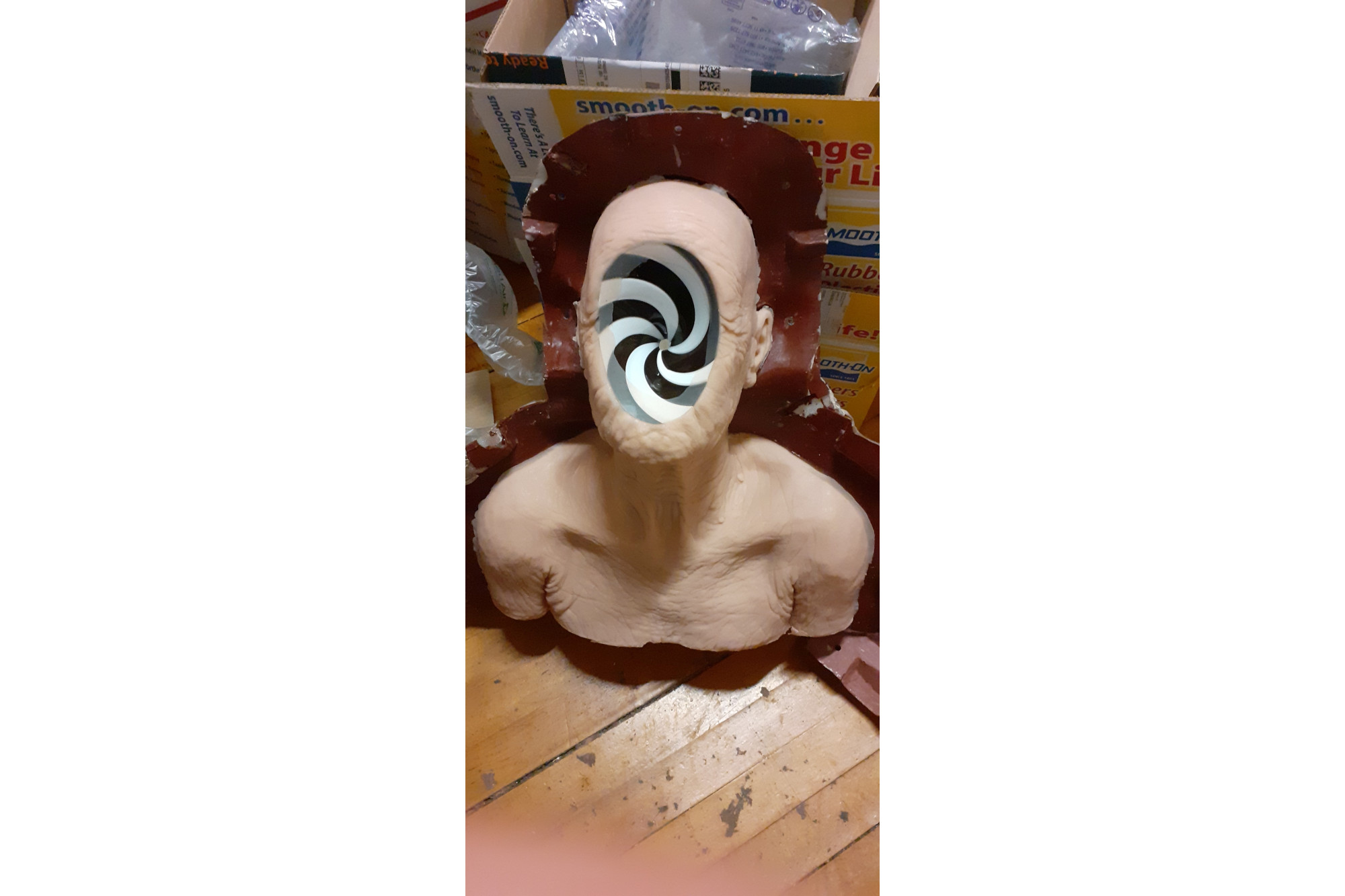 Once the inclusion has been seamlessly added to the sculpture, the entire bust, along with the glass inclusion, can be cast together. I use a two part, rigid fibre-glass mold for this process, because I am casting a flexible material (silicone) into it. It is important to fill undercuts anywhere on the glass inclusion using plasticine, as glass is also a rigid material and will likely break if caught in any undercuts.