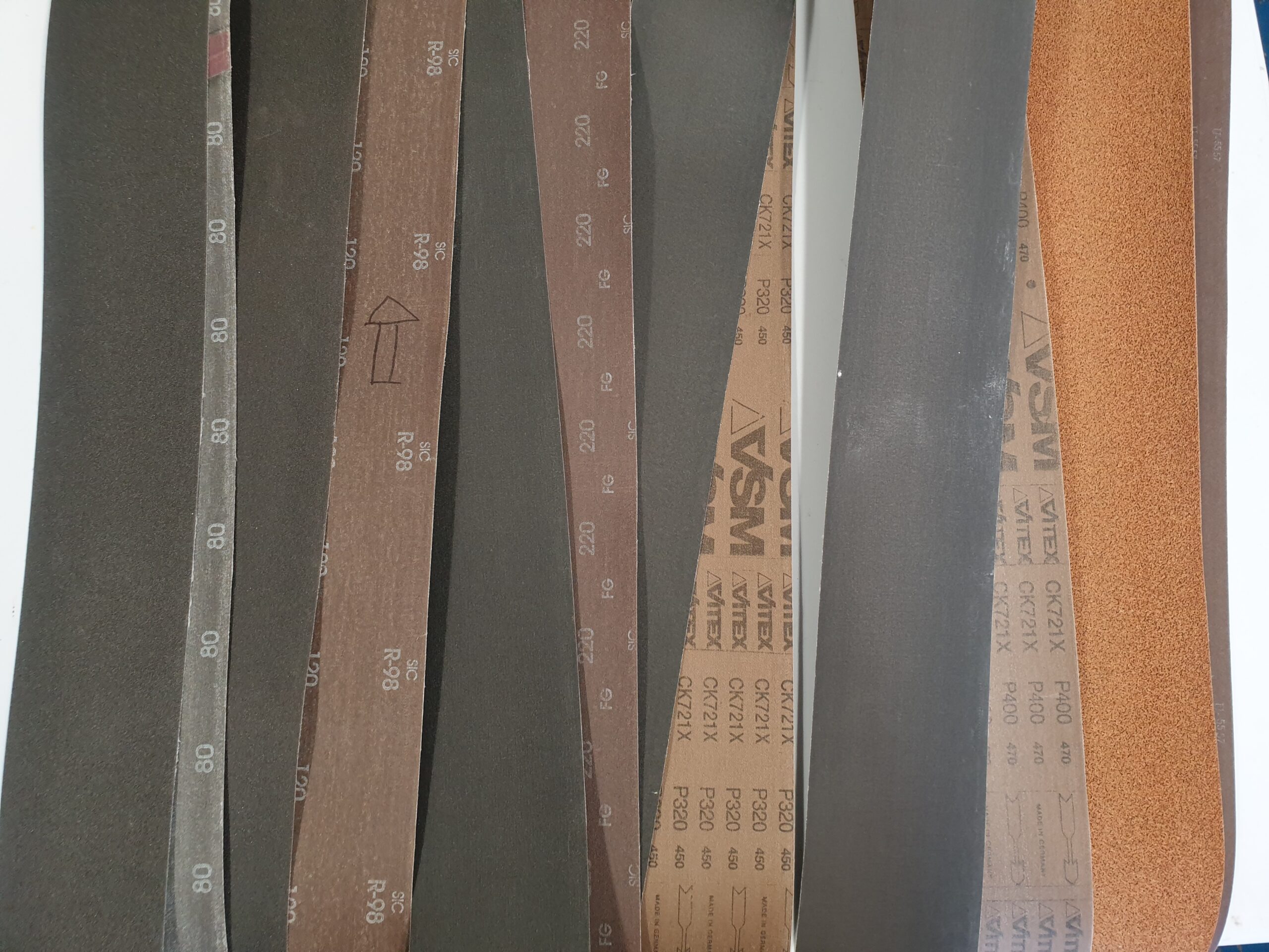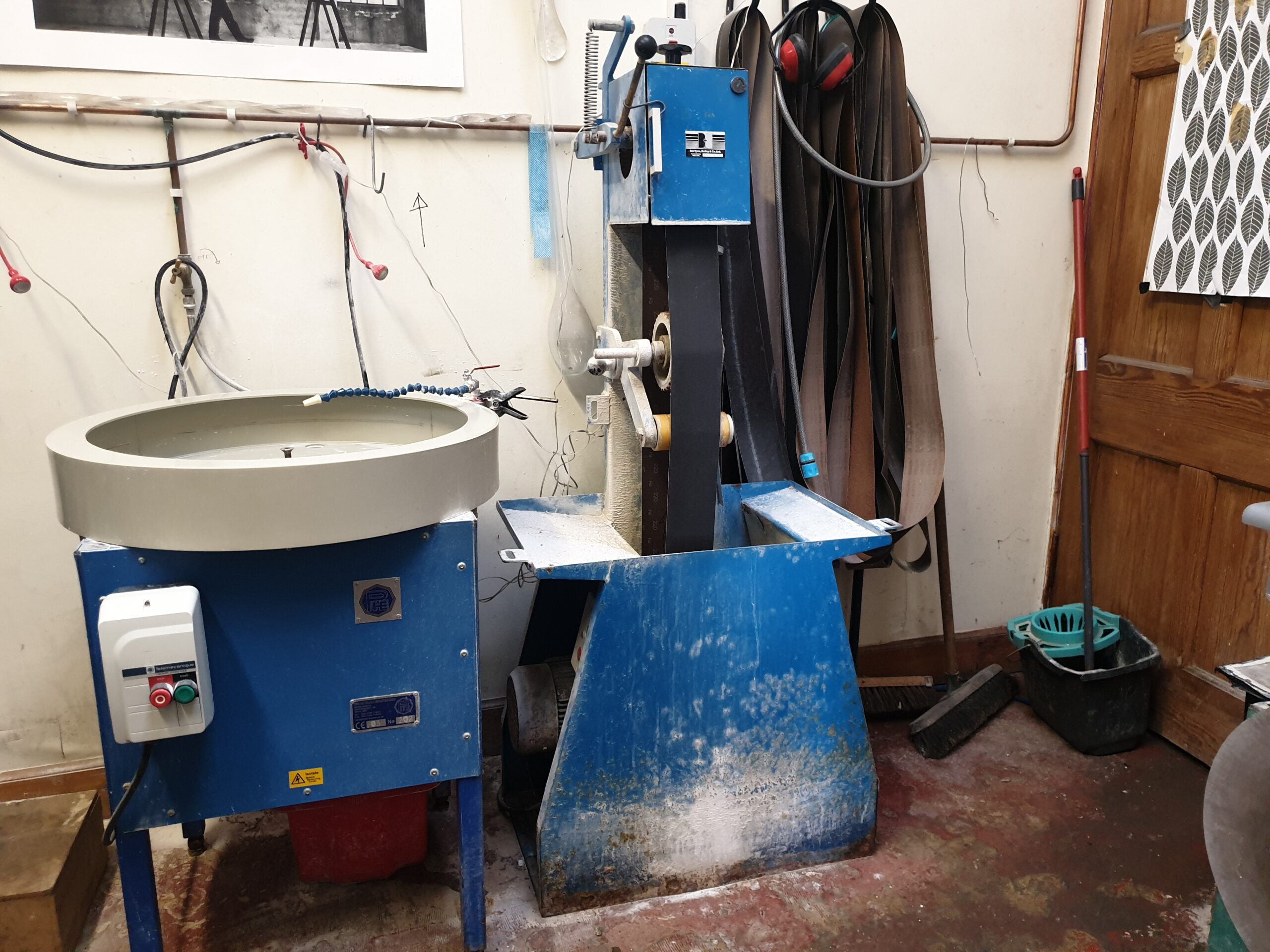 When setting up the machine, start with the appropriate belt for the job needed. Start with a rougher grade such as 60, 80, 100 / 120 if there is a lot of material to remove as these will take away more glass more quickly. Loop the belt onto the machine, ensuring that it is running straight, and that any arrows on the back of the belt are in line with the direction of travel, i.e. up at the back and down at the front of the linnisher. Tighten the tension if this is required by the particular machine. Check that the water feed is coming through onto the width of the belt, adjusting if necessary or topping up the water if it is a recirculating pump. The machine must always have a continuous water feed to keep the glass cool and prevent cracking from thermal shock. When introducing your glass piece to the belt, ensure it is at a downward angle to prevent it catching and move the piece across the width of the belt so that it doesn’t wear down unevenly. Once you have achieved the desired shape or smoothness, rinse and dry the glass and change to a finer grade belt. You can mark the area of the glass that you need to work on using a permanent marker or wax (chinagraph) pencil. Continue this process through the belts, checking between each one that you have achieved an even surface texture. If you require a polished surface you can use a cork belt, after you have used a 400-600 grade belt. Cork belts are best soaked in water before use to ensure they are fully saturated. A slurry of pumice powder and water may be used along with the cork belt (however be aware that many linnishers pump their water back through, so this will remain in the water). You can also get specialist polishing belts such as felt impregnated with pumice or cerium oxide. You may need to move to a different machine such as a felt or cork wheel used with pumice or cerium for a final polish.