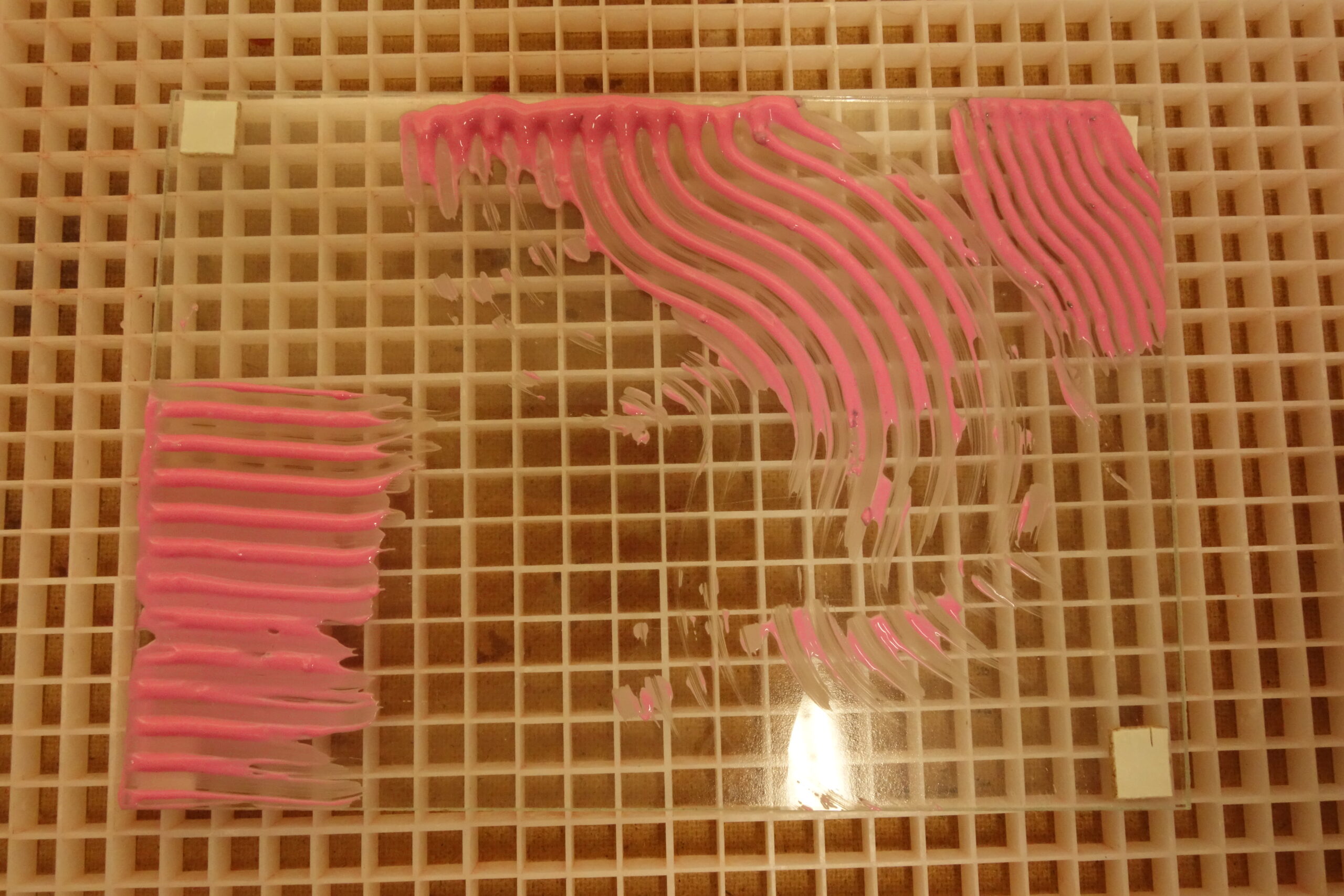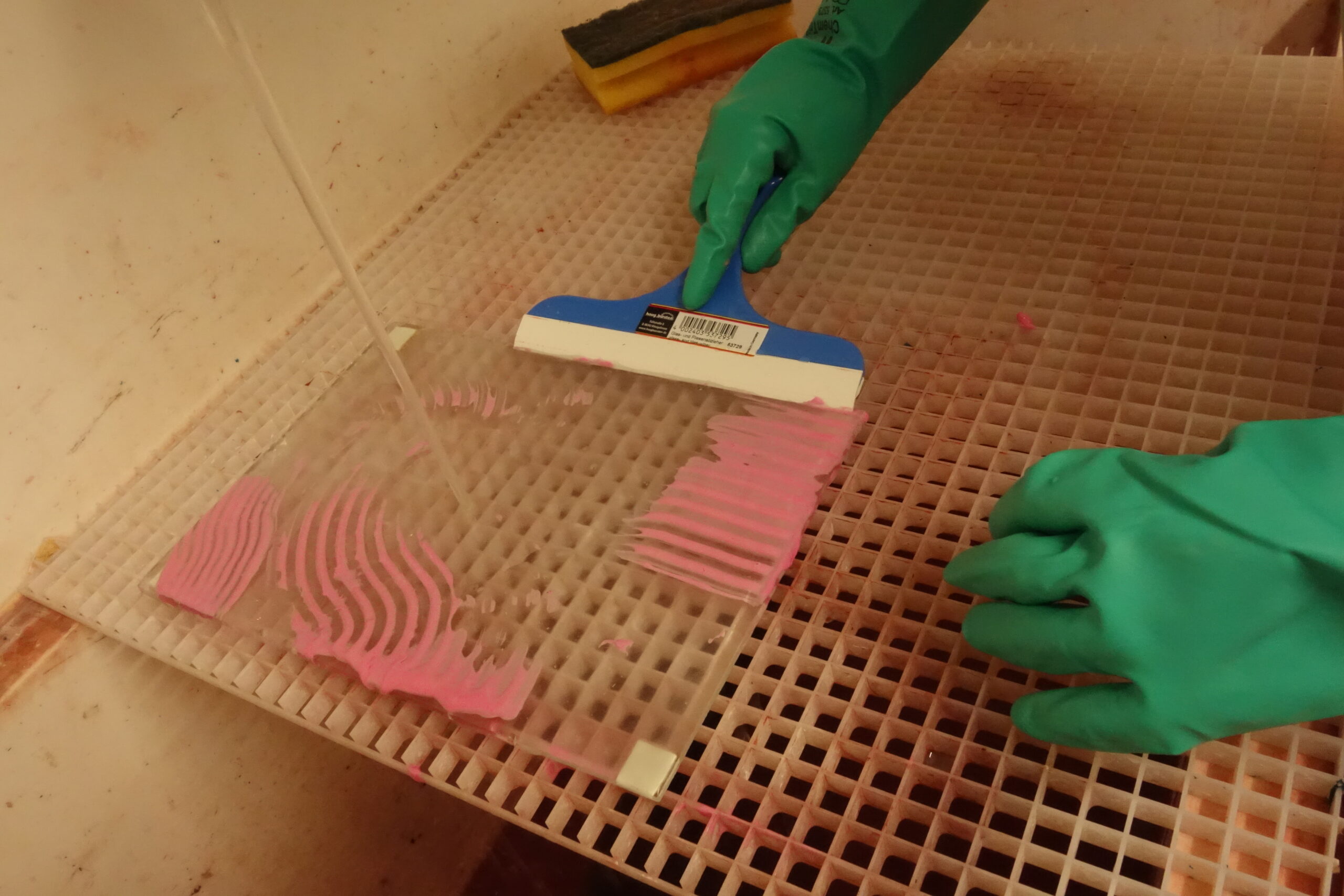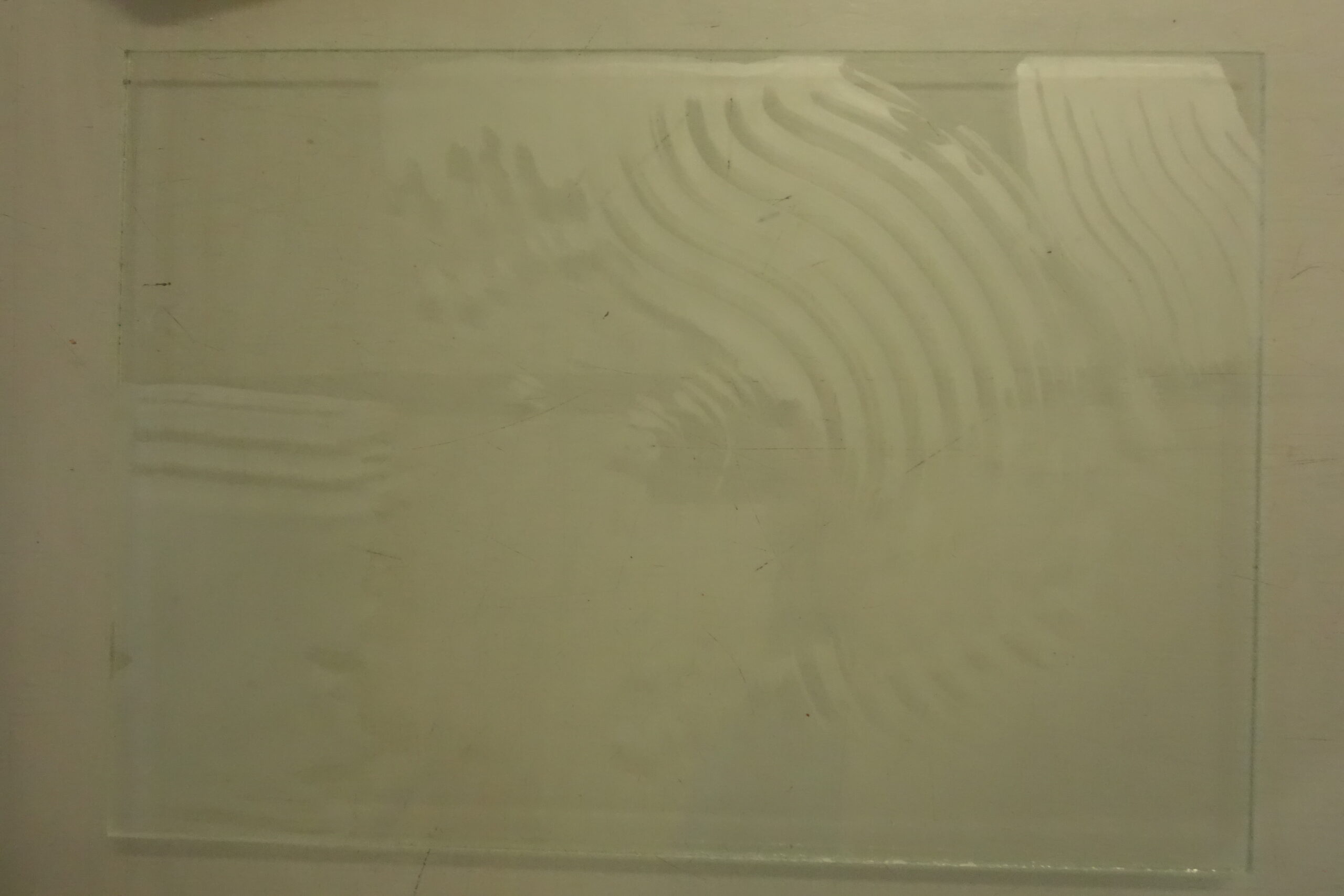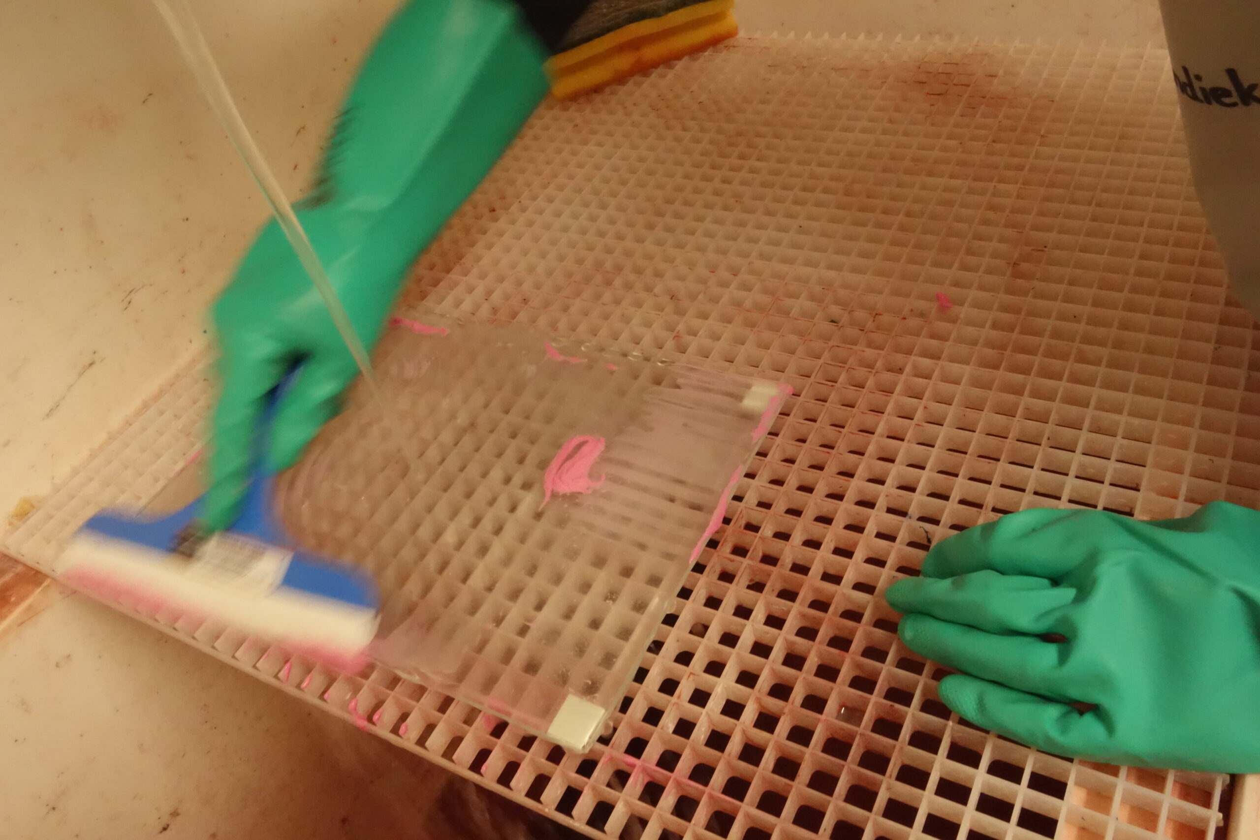 The glass is laid in hydrofluoric acid for 5 minutes, than washed very well.