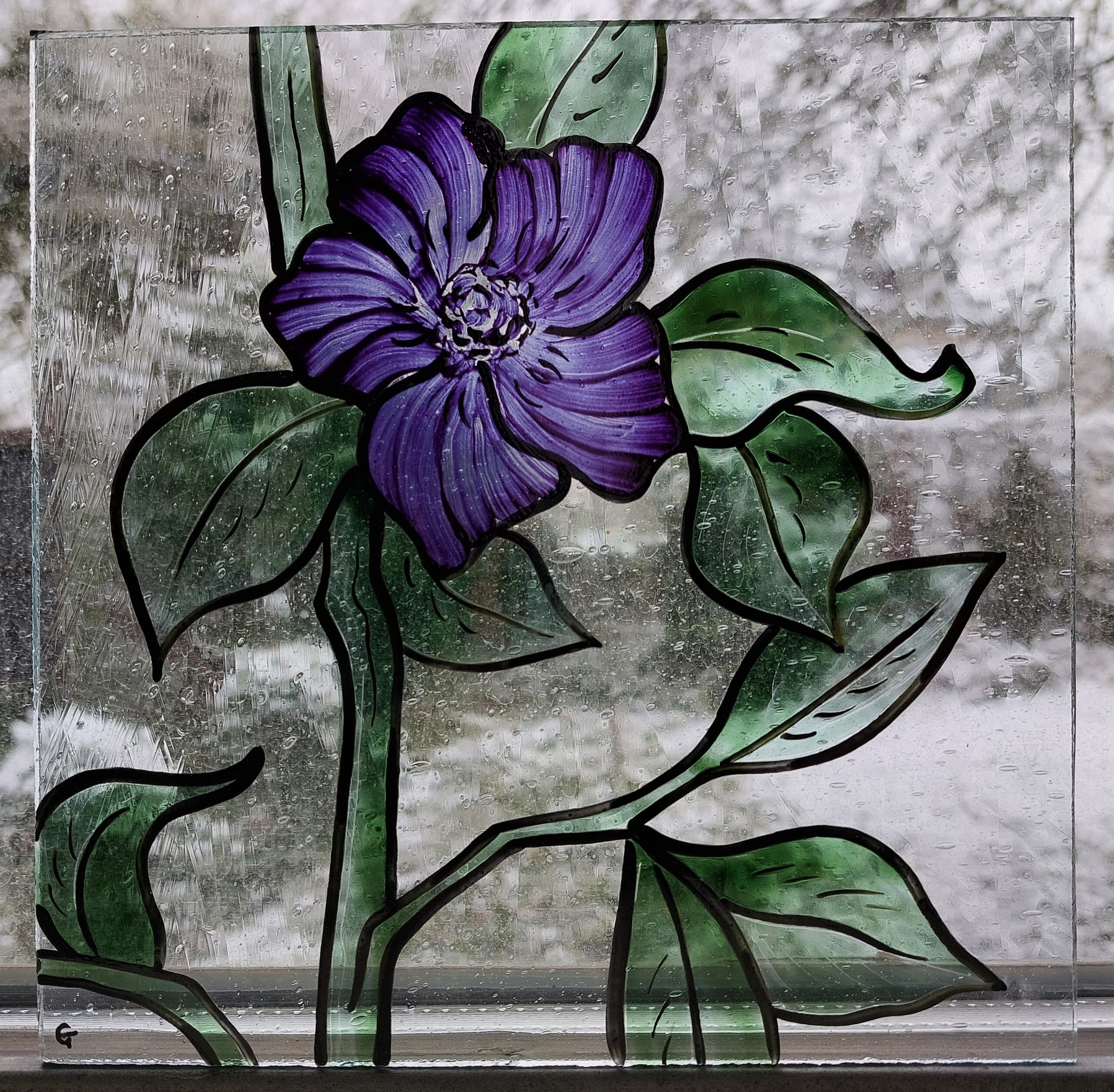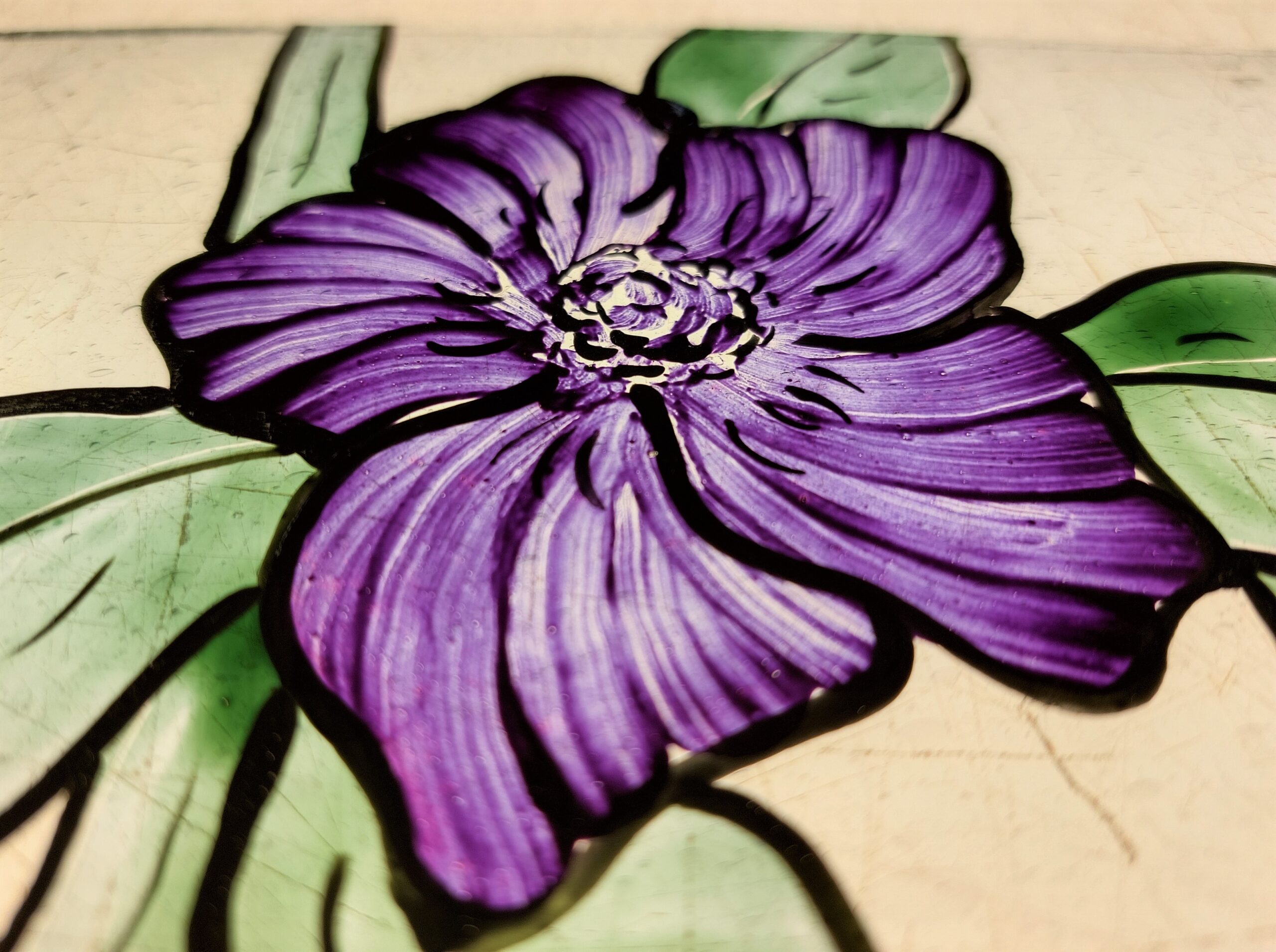 Glass painting technique. The glass paint is mixed with water with a little gum arabic added. The painted trace lines are painted with a rigger brush and then kiln fired at 600c. A violet enamel mixed with water is applied to the flower in sweeps created movement/contours with the brush stroke and a green enamel mixed with water to the leaves with a thicker rigger brush in sweeps and fired in the kiln.