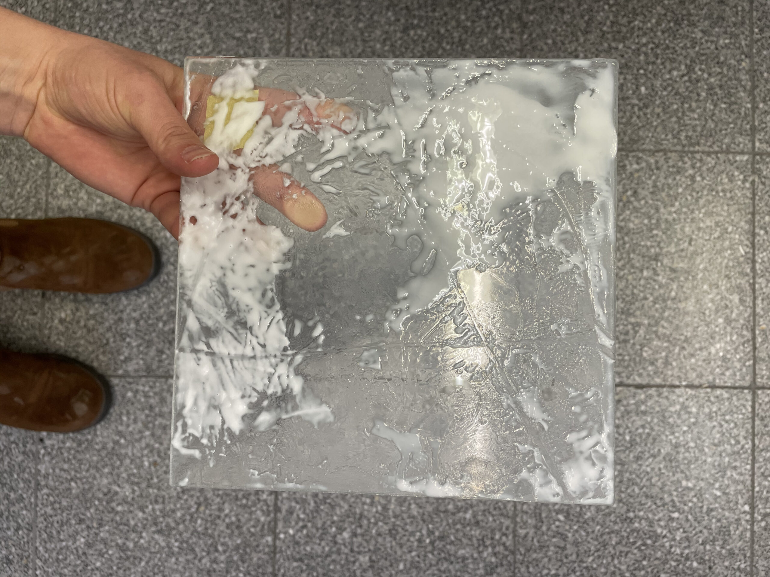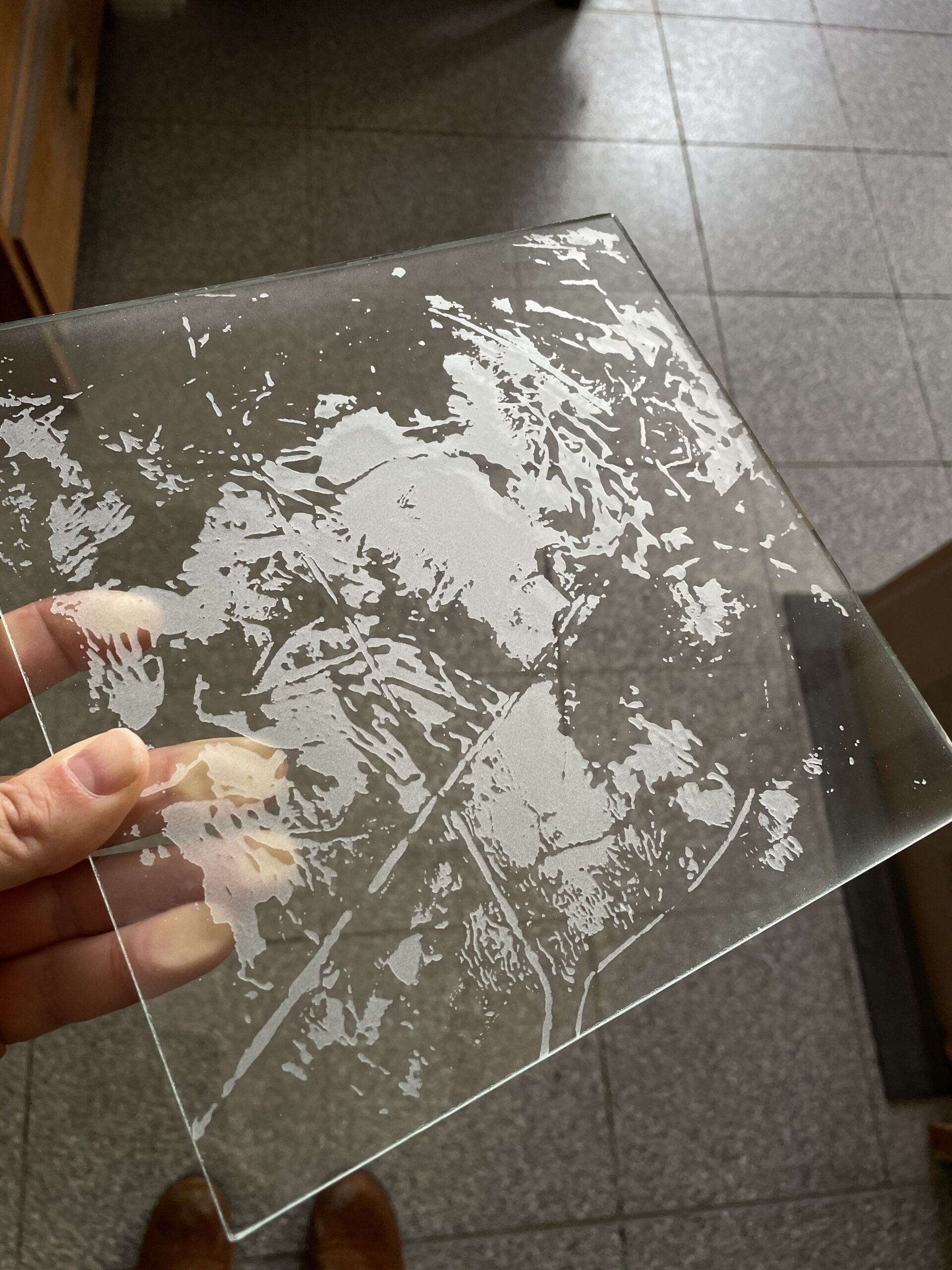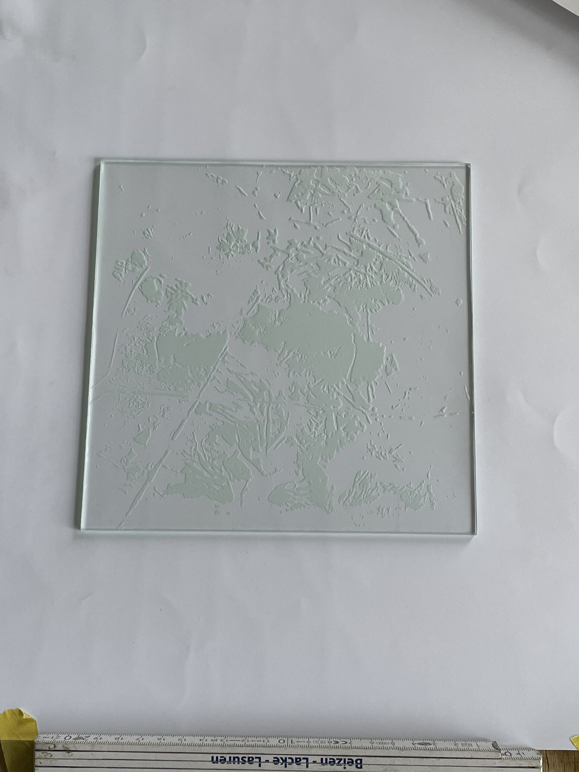 Apply express wood glue on float glass, put on a tissue paper and peel off the wood glue for texture, let it dry and sandblast it. Soak it in water to remove the dry wood glue from the float glass.