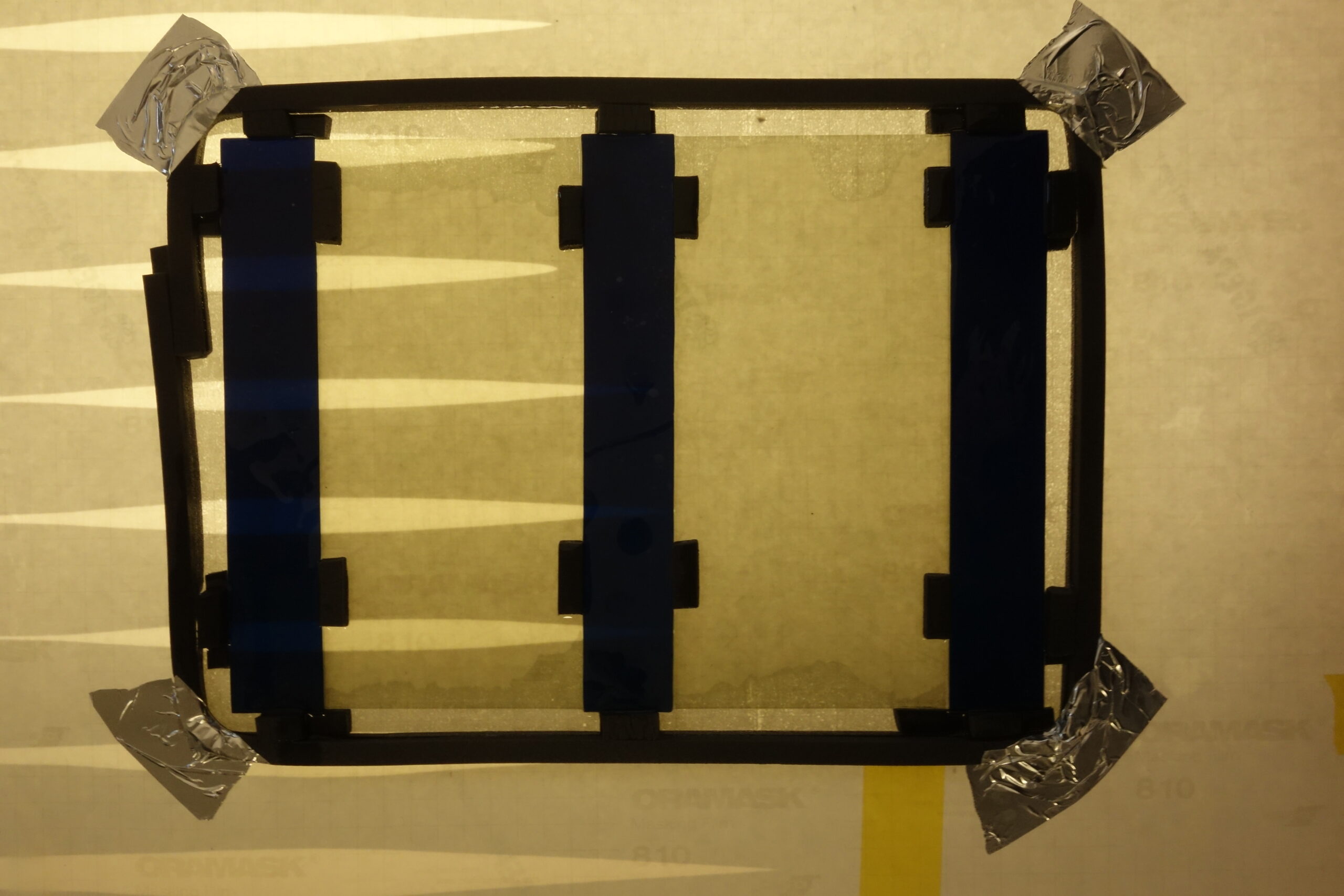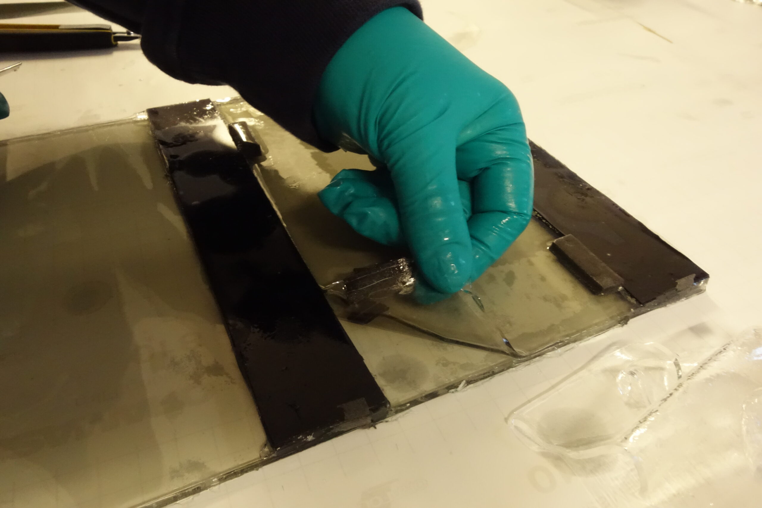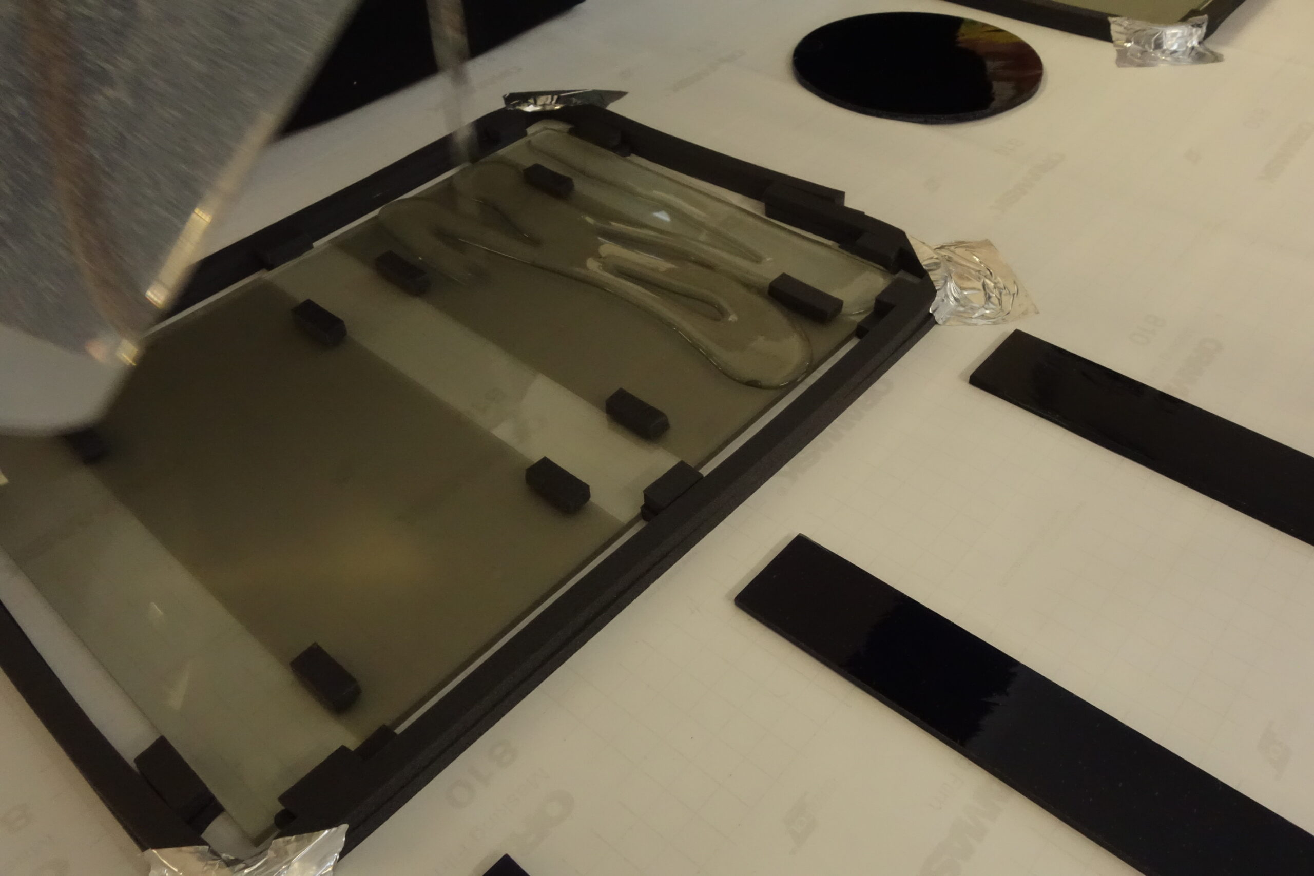 First I cut a disc of float glass and 3 small rectangles made of blue antique glass. After that, I took the foam tape and glued it in small stripes around the glass and likewise around the small rectangles, so that it can´t slip later. After that we form a tub with the tape so that the silicone also stops. When the preparation in finished, we can mix the silicone in a ratio of 3 parts of A and 2 parts of B and pour it onto the disc. The other disc is lowered on it and after drying, they can be cleaned.