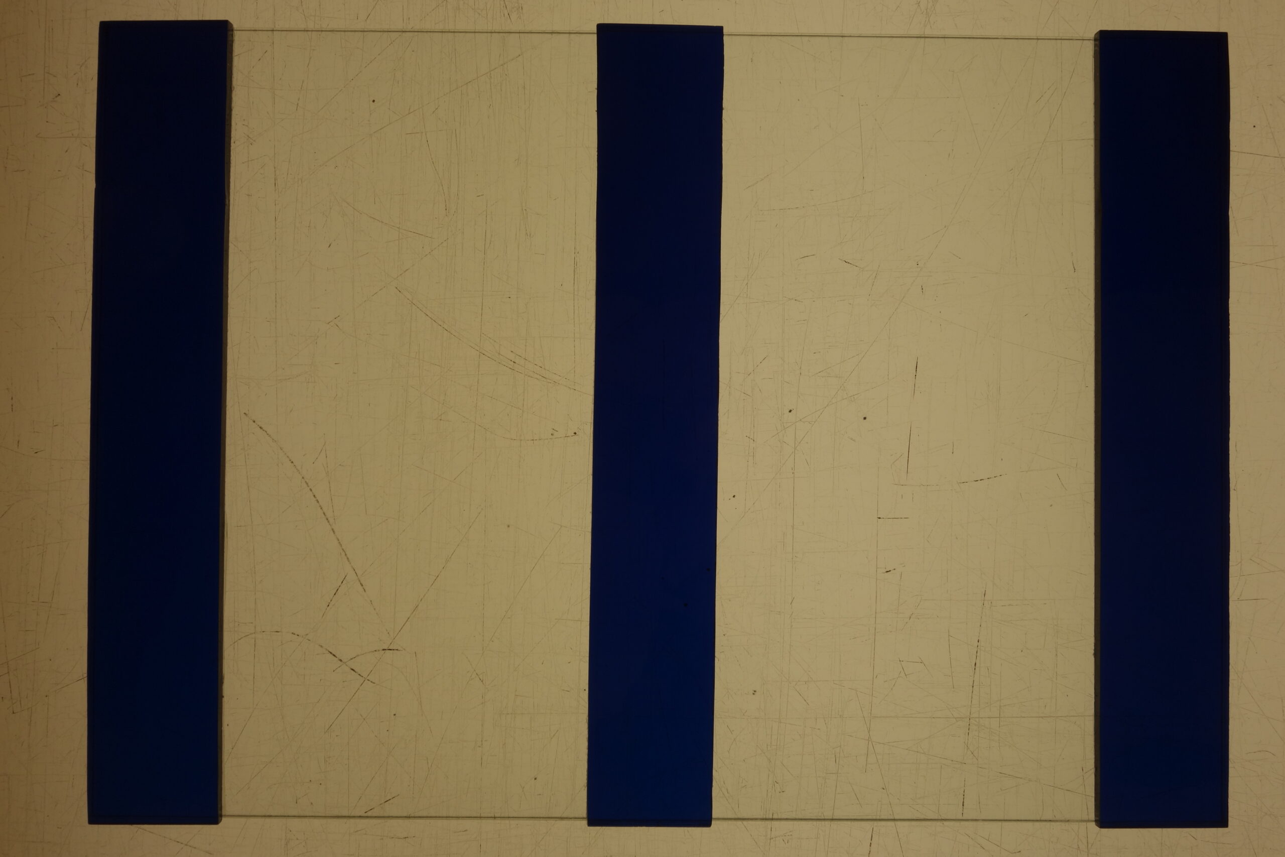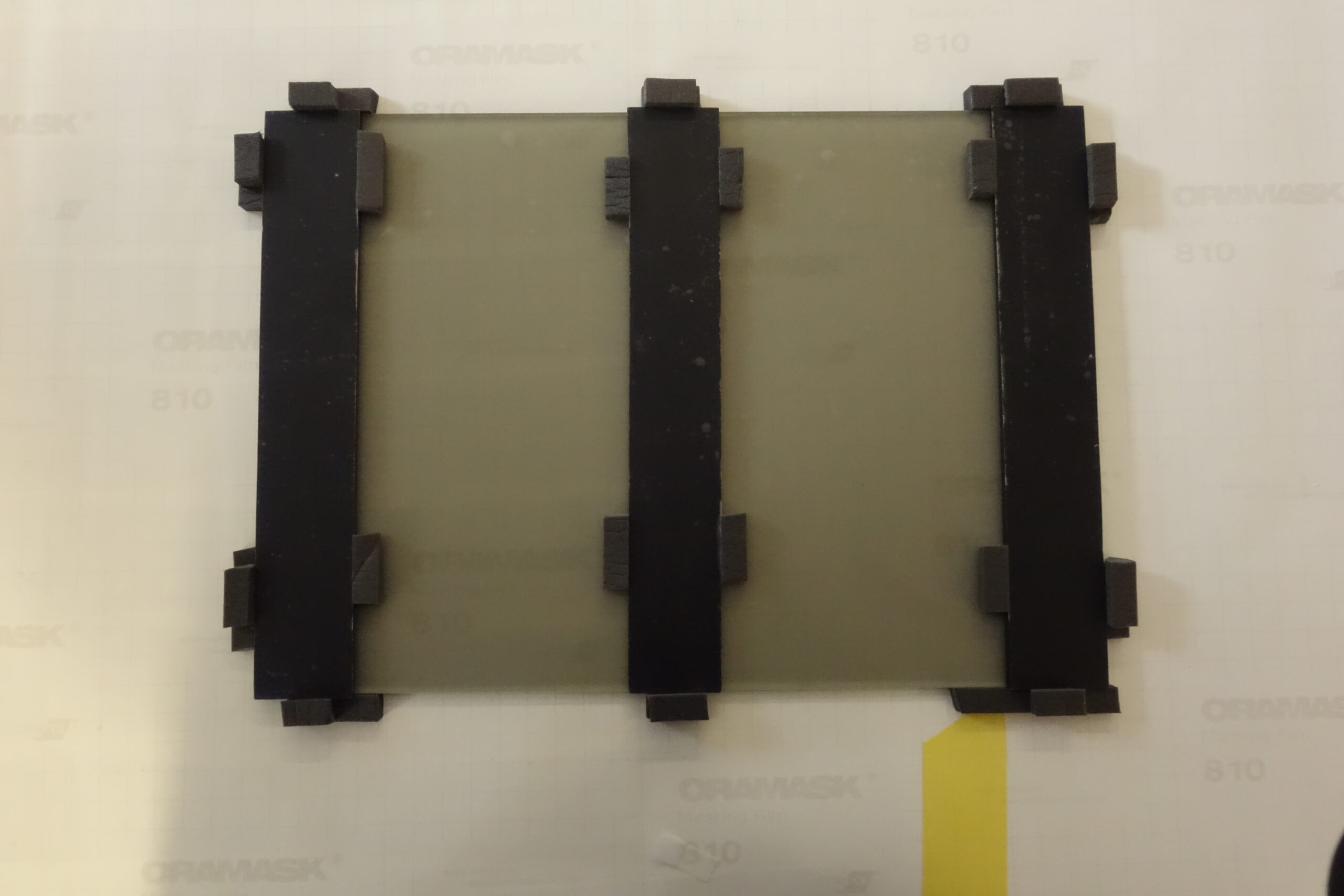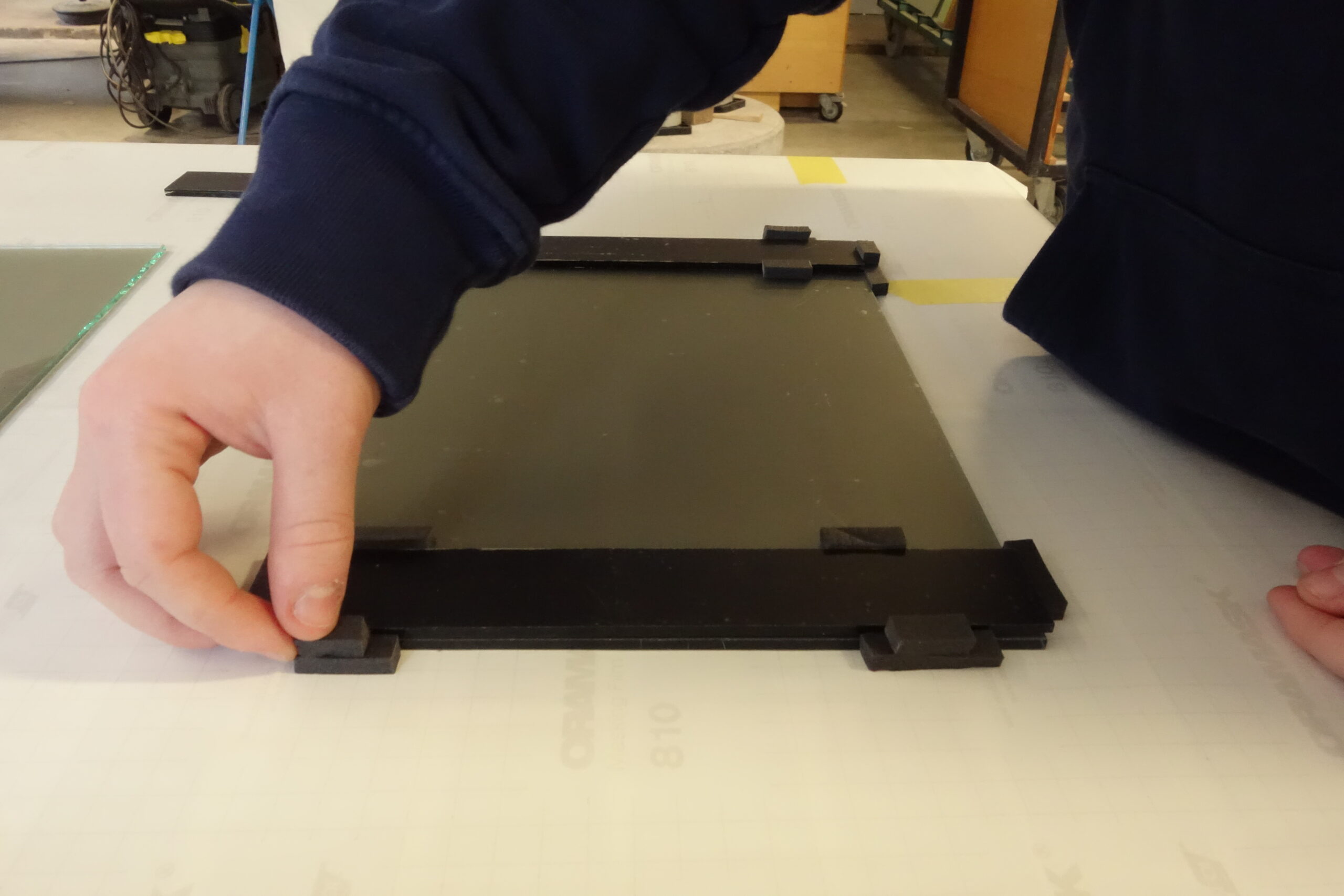 First I cut a disc of float glass and 3 small rectangles made of blue antique glass. After that, I took the foam tape and glued it in small stripes around the glass and likewise around the small rectangles, so that it can´t slip later. After that we form a tub with the tape so that the silicone also stops. When the preparation in finished, we can mix the silicone in a ratio of 3 parts of A and 2 parts of B and pour it onto the disc. The other disc is lowered on it and after drying, they can be cleaned.
