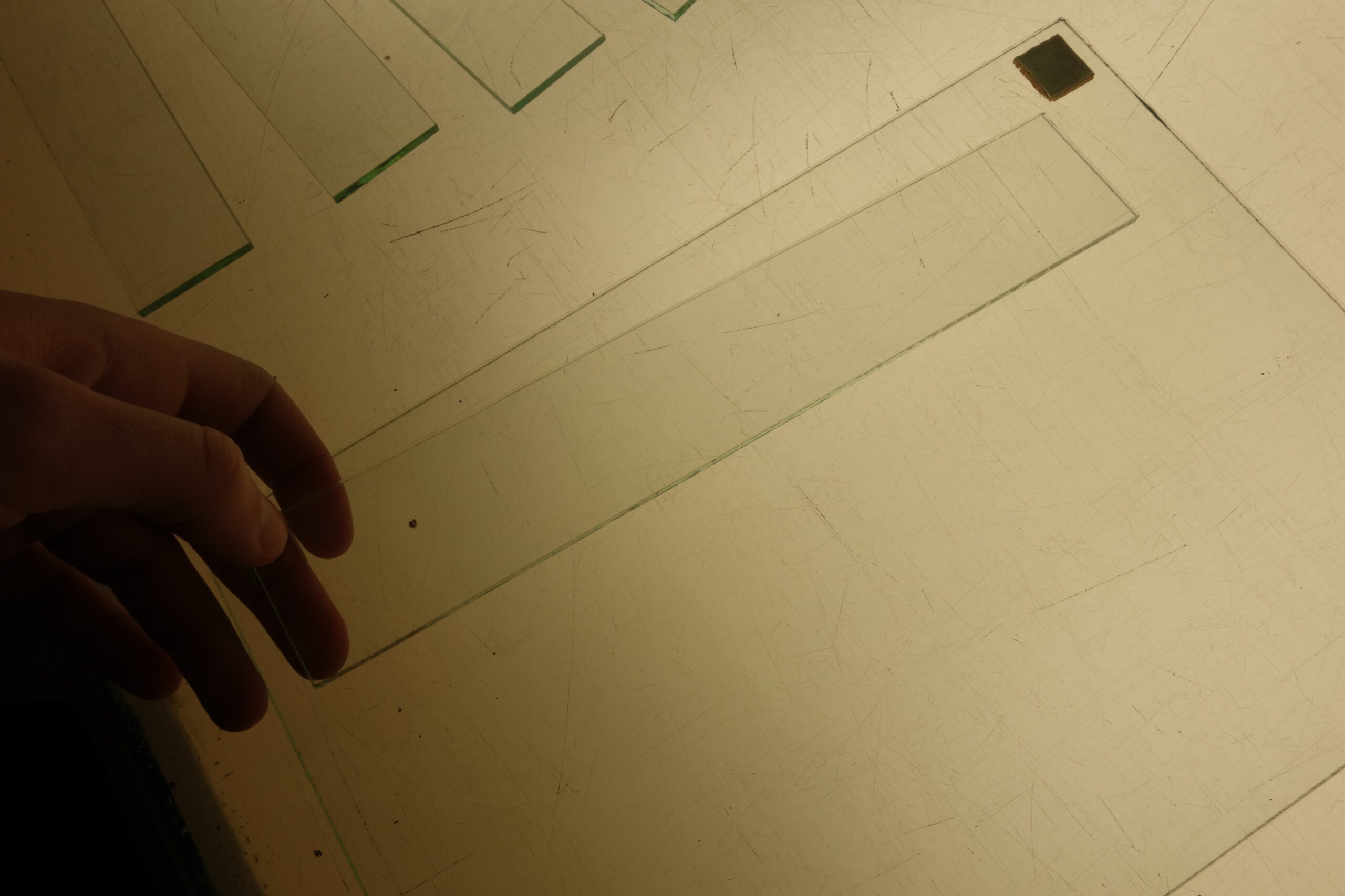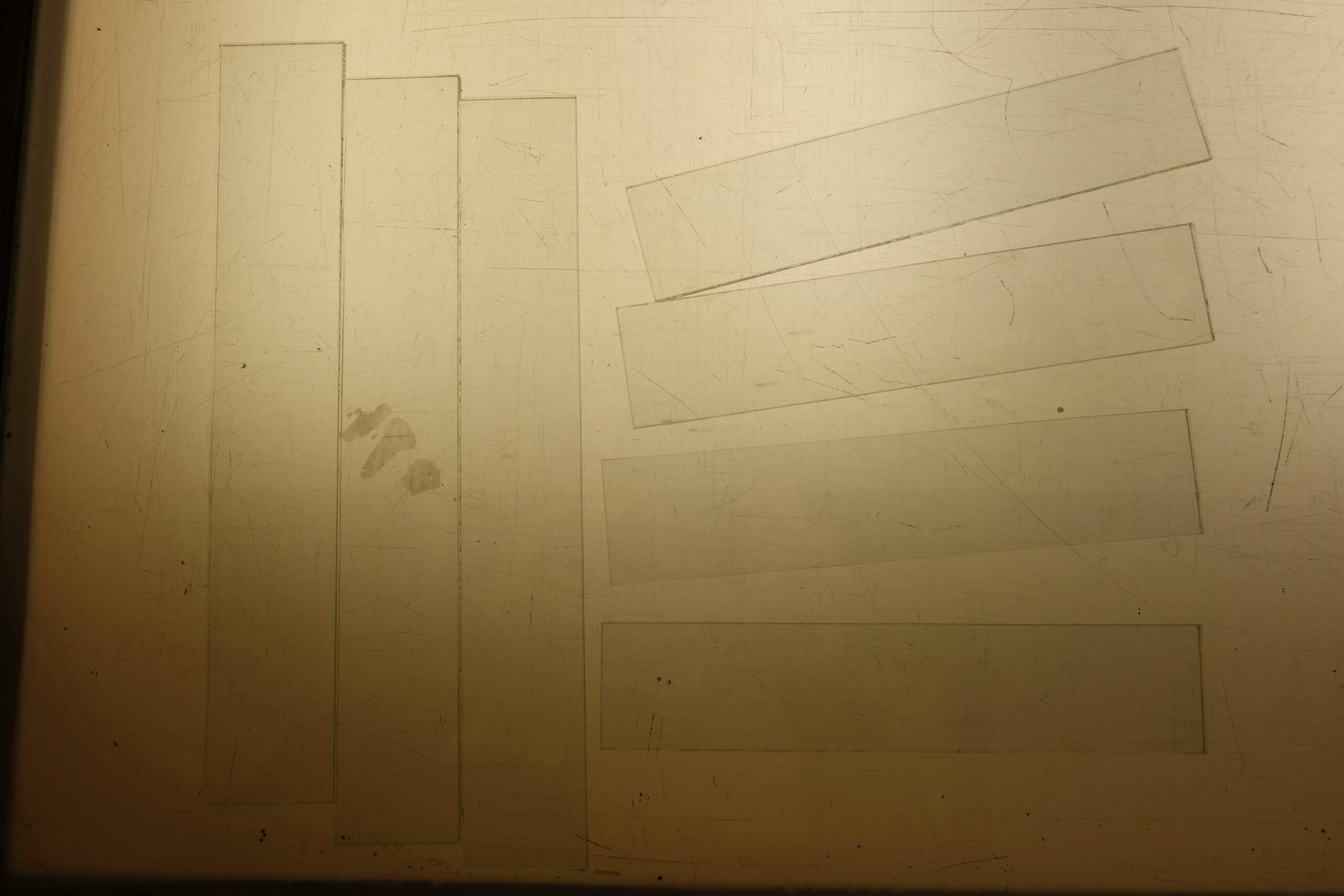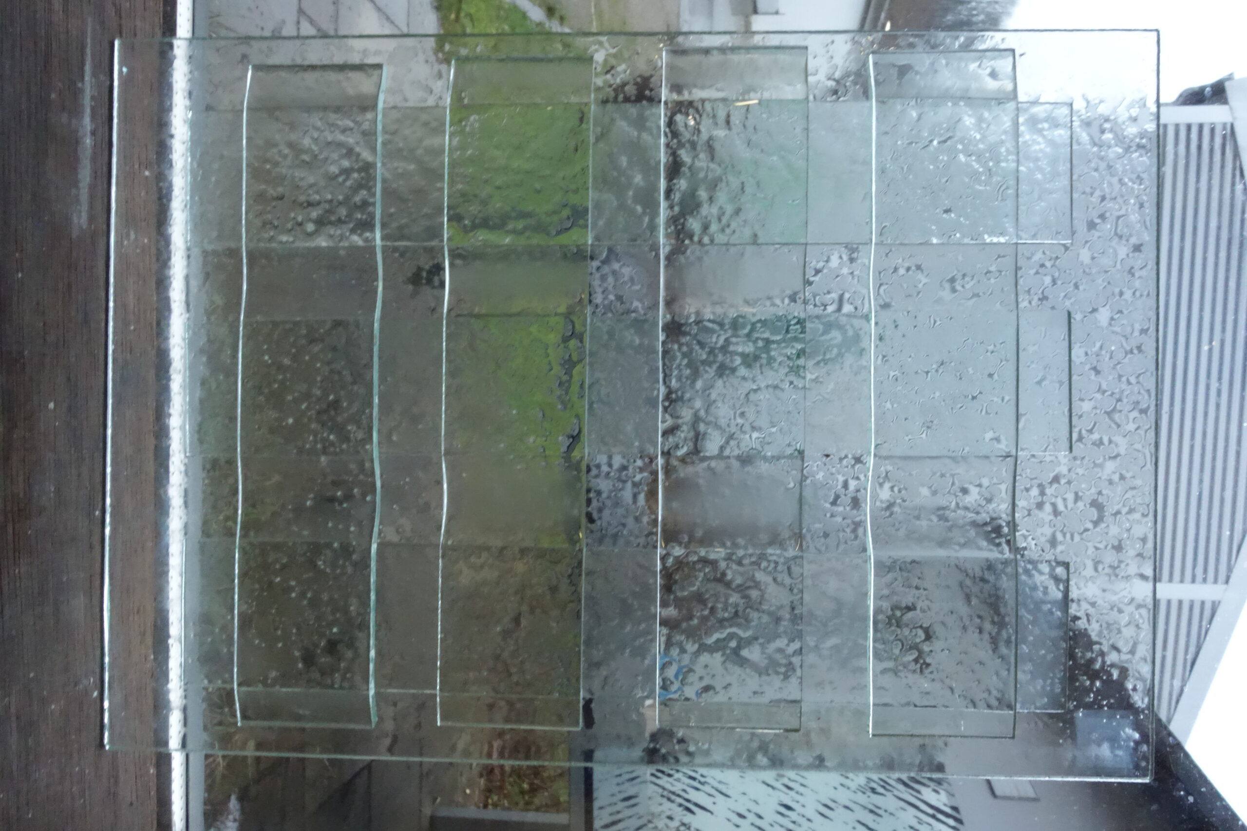 First I cut the glass in strips. The long strips are 25x4cm and the smaller strips are 19x4cm. Then I placed the four long strips vertically with a bit distance to each other. After that I placed the four smaller strips horizontal on the other strips, from top to bottom even with distance to each other. Then put it in the oven and fired it at 730°C.