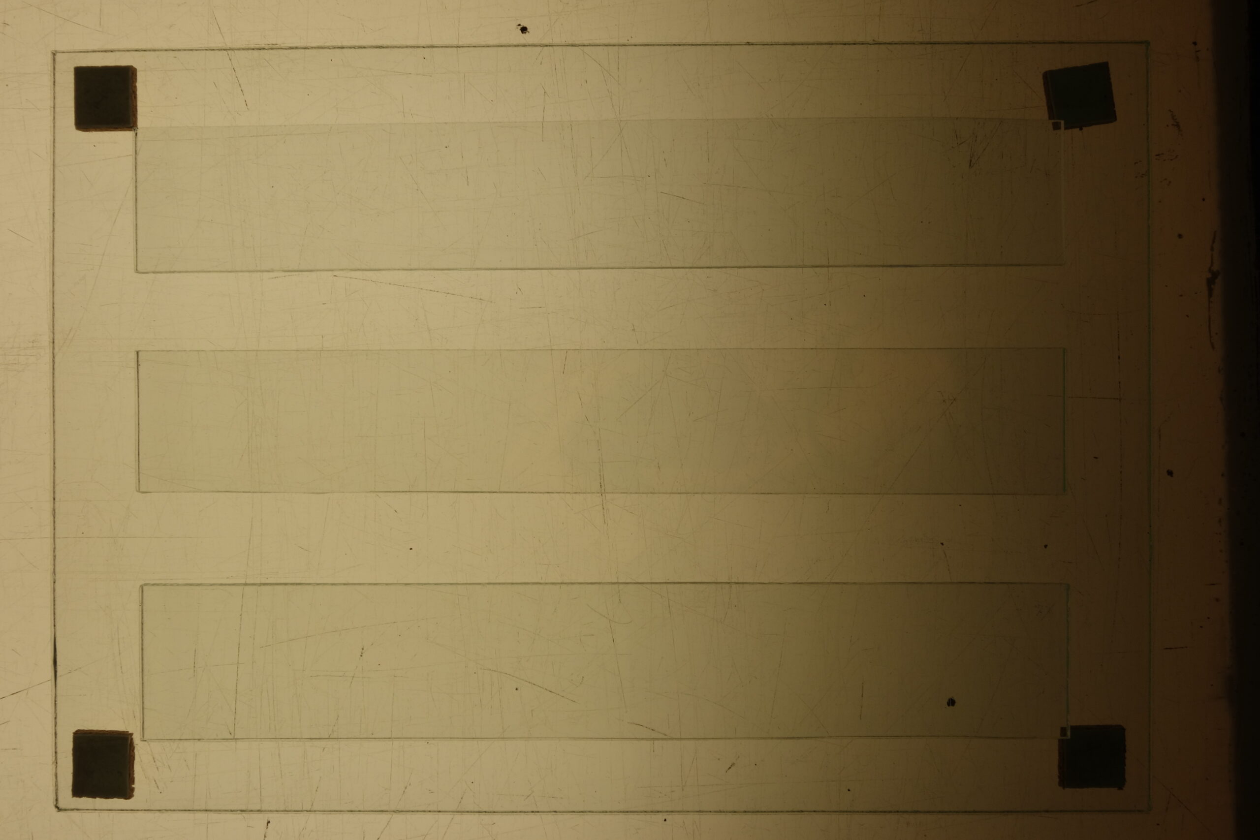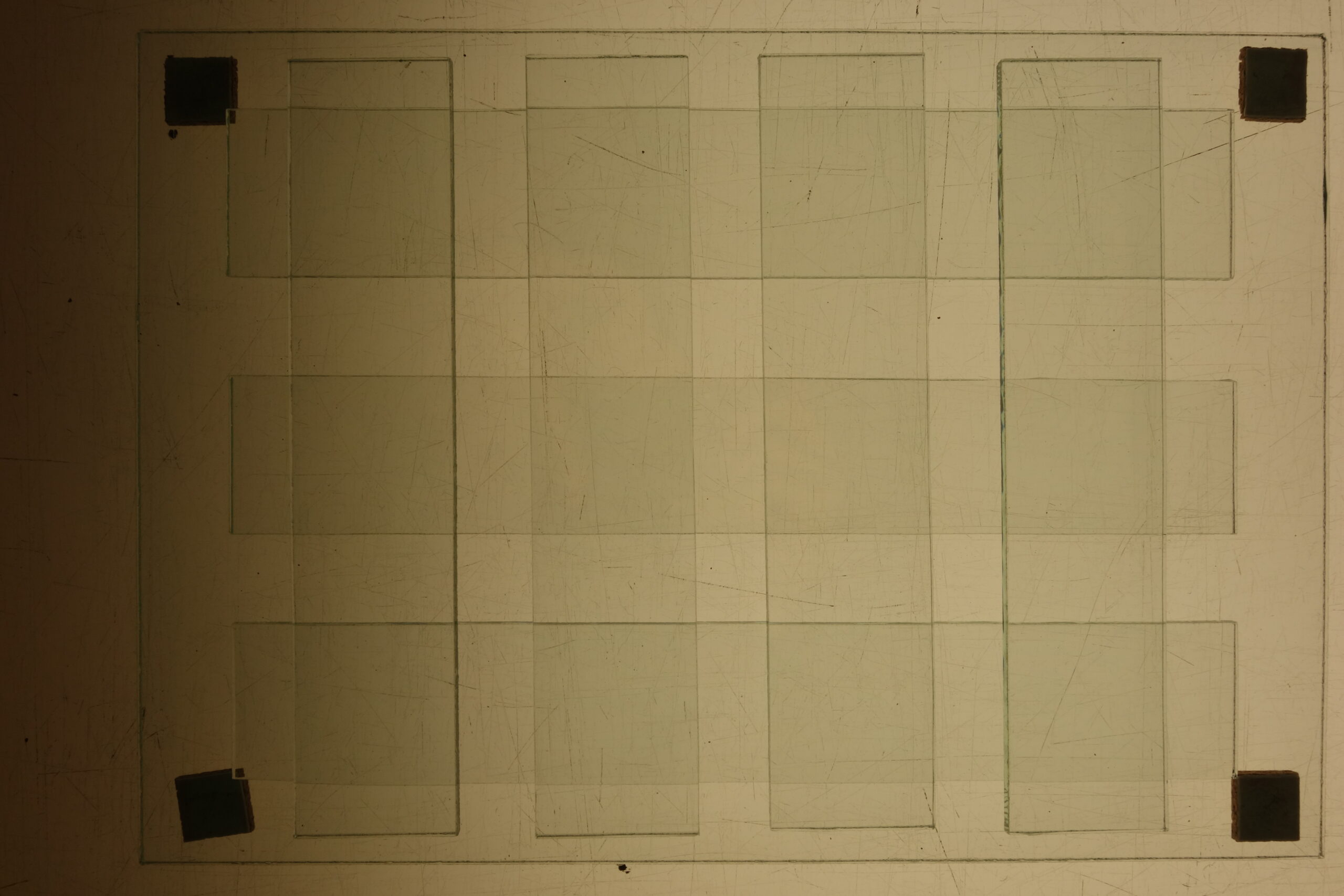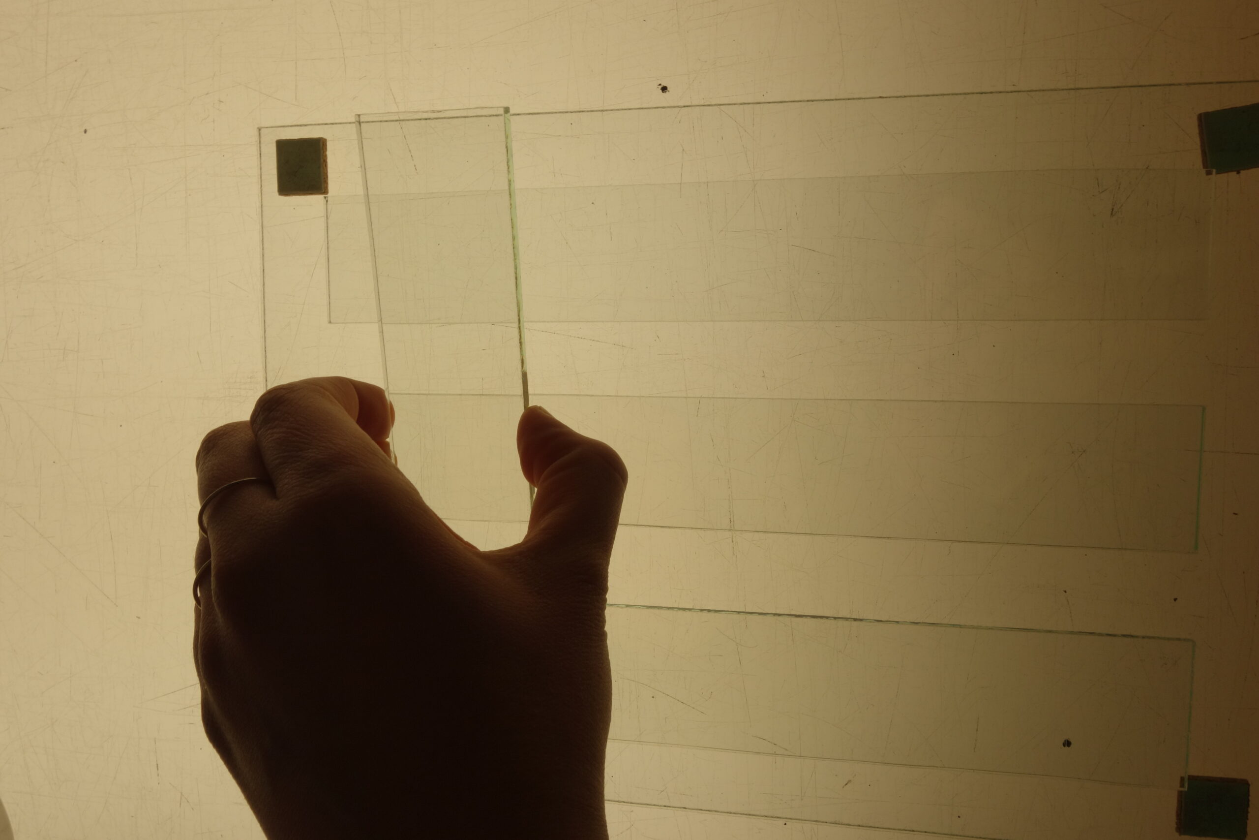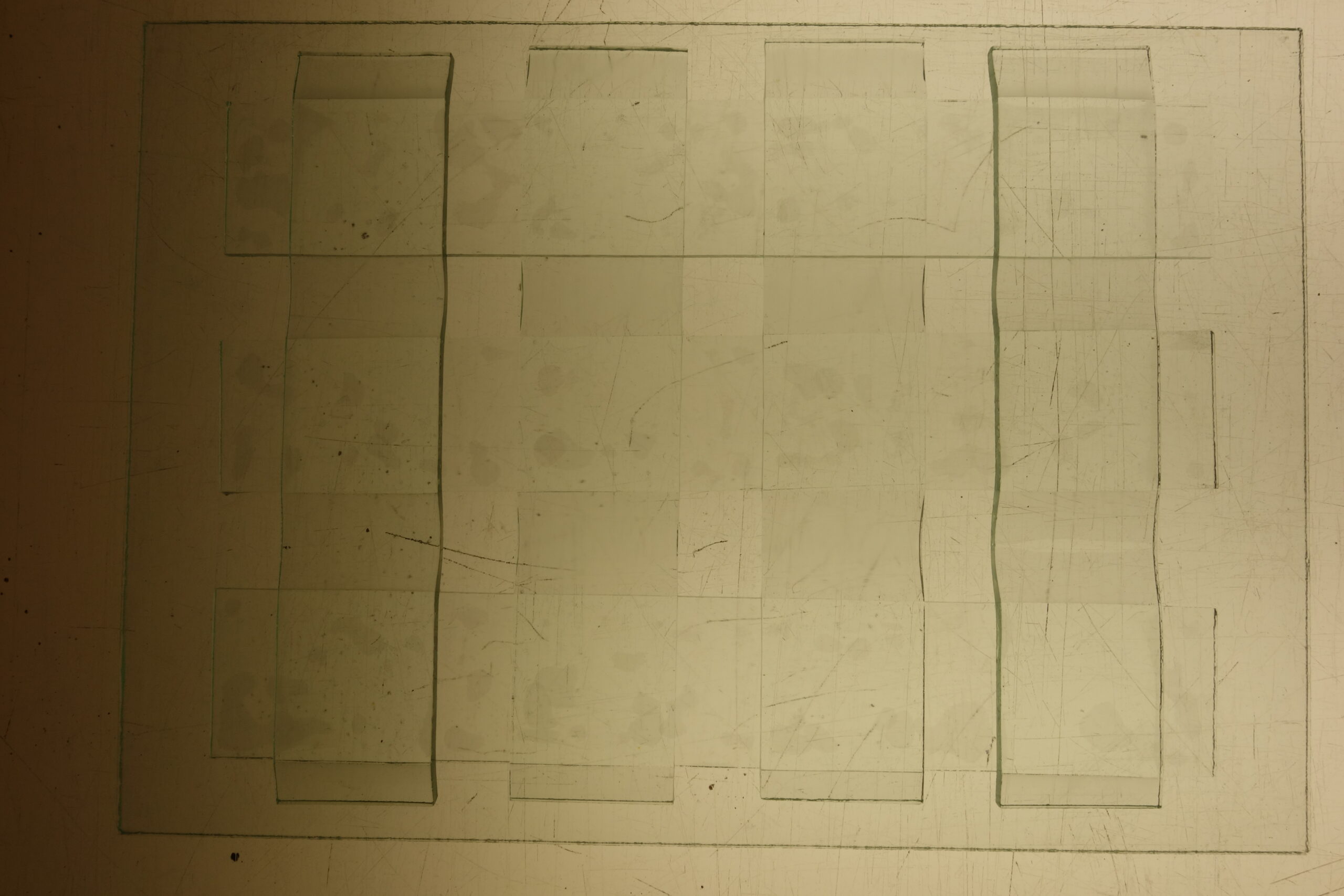 First I cut the glass in strips. The long strips are 25x4cm and the smaller strips are 19x4cm. Then I placed the four long strips vertically with a bit distance to each other. After that I placed the four smaller strips horizontal on the other strips, from top to bottom even with distance to each other. Then put it in the oven and fired it at 730°C.
