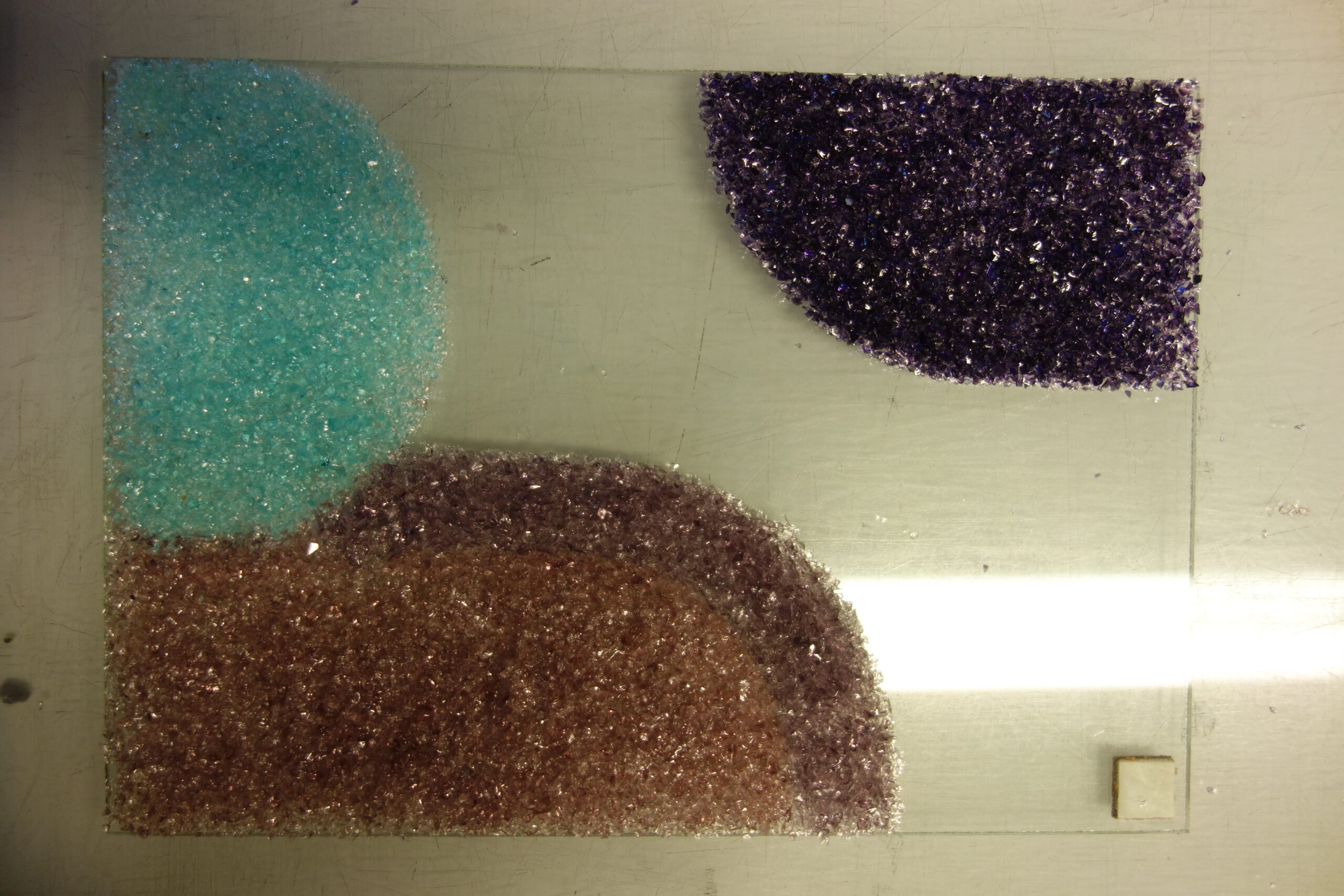 First I cut the Artista glass in DIN A4 size. Then sprinkled Artista crumbs on the glass and fired it at 720°C.