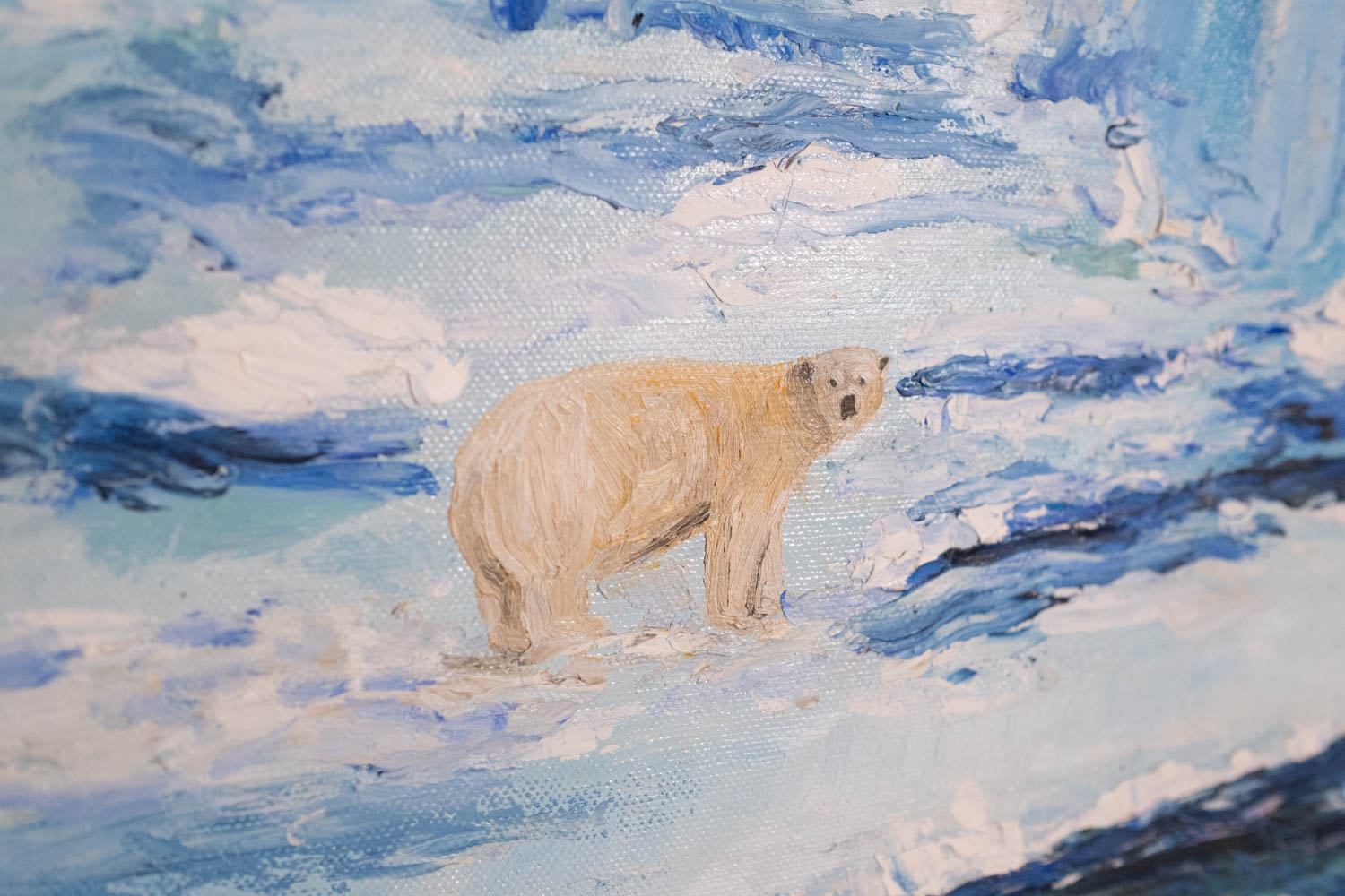 Painting depicting the calving of an iceberg observed by a puzzled bear. Part of the “Gaia” series, created to raise awareness of the consequences of global warming.