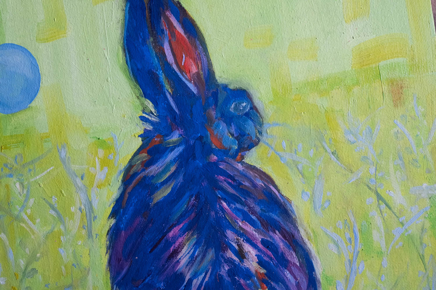 A little black rabbit, at the mercy of predators, is safe in this case as it turns its back to the observer, in a field full of its dainty filaments, depicted in vivid, dynamic colors to represent the animal’s liveliness.