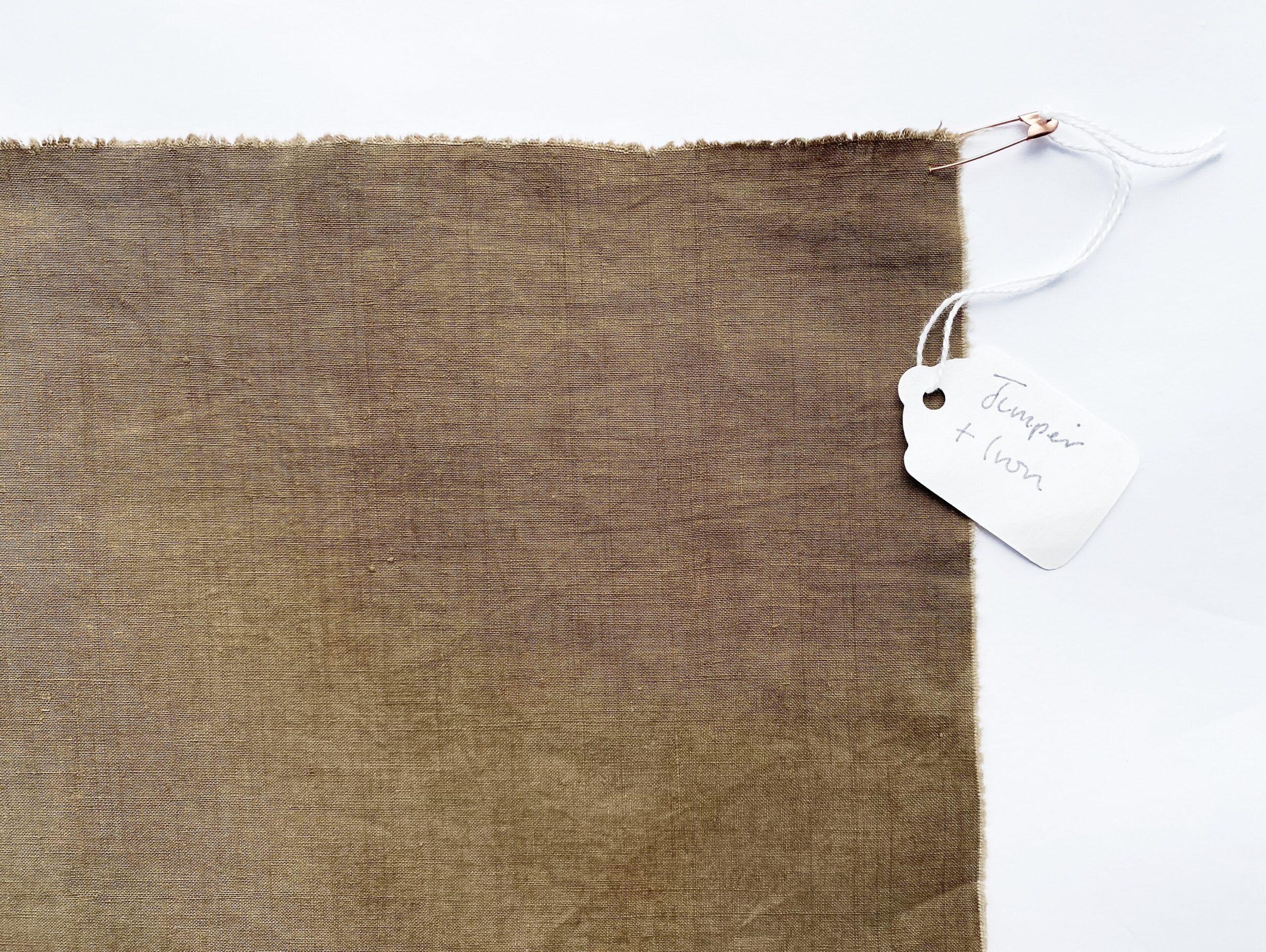 Dye bath at 1000% WOF (weight of fibre). Simmered plant material in water at 80C for one hour, with added sodium carbonate, soaked for two days. Removed plant material before adding fibre. Overnight dye bath. Post modified with iron (ferrous sulfate) @ 2% WOF.