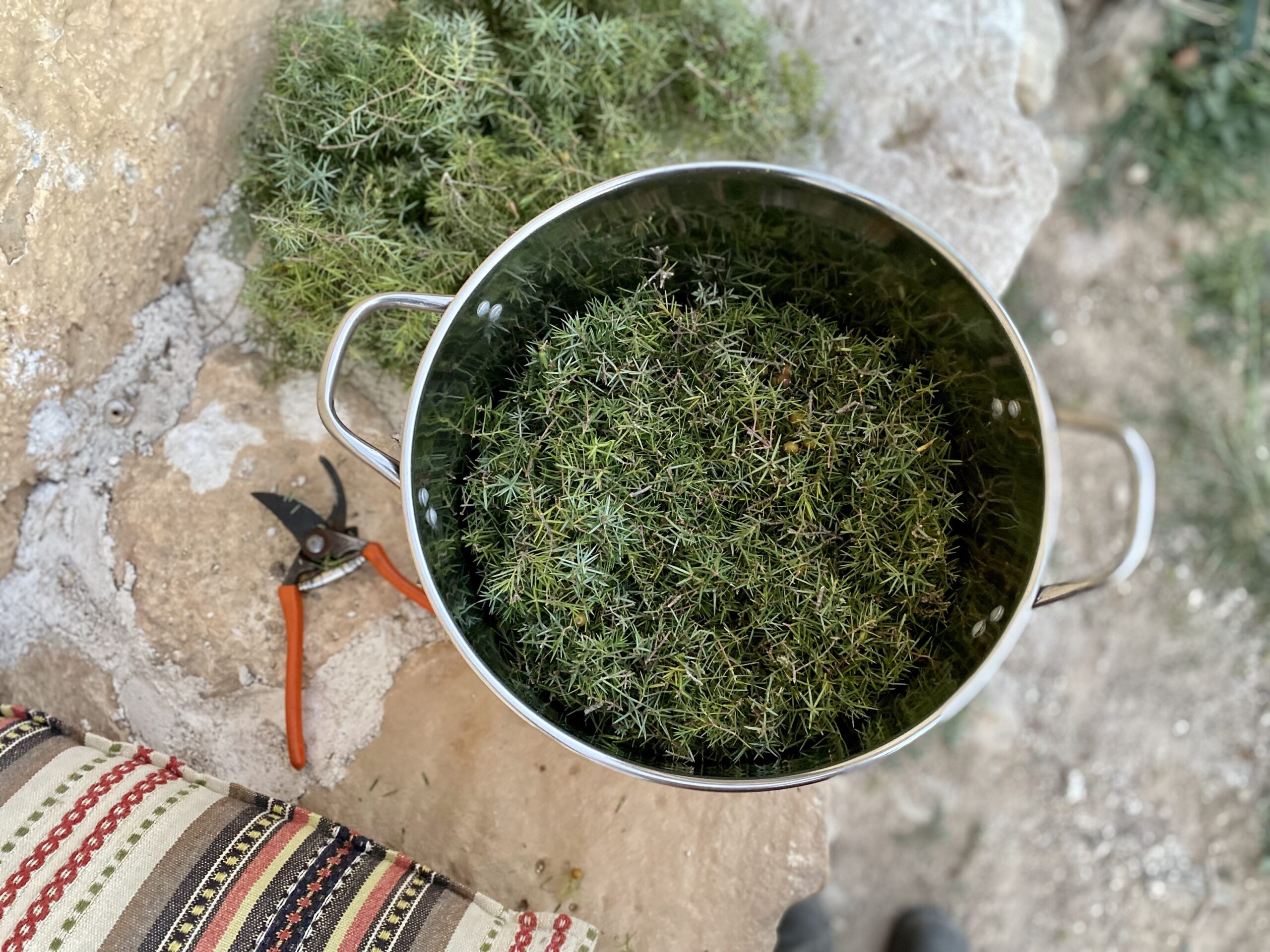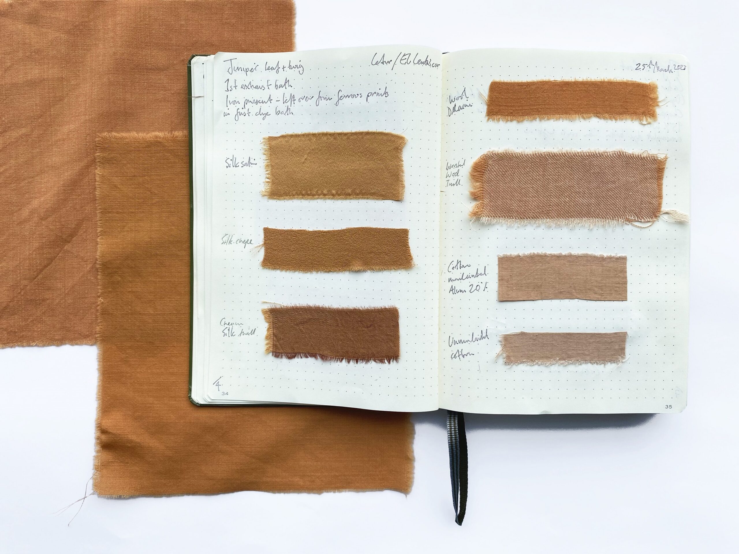 First exhaust bath. Original dye bath at 1000% WOF (weight of fibre). Simmered plant material in water at 80C for one hour, with added sodium carbonate, soaked for two days. Removed plant material before adding fibre. Overnight dye bath. Exhaust bath – 24hrs, some iron possibly present.