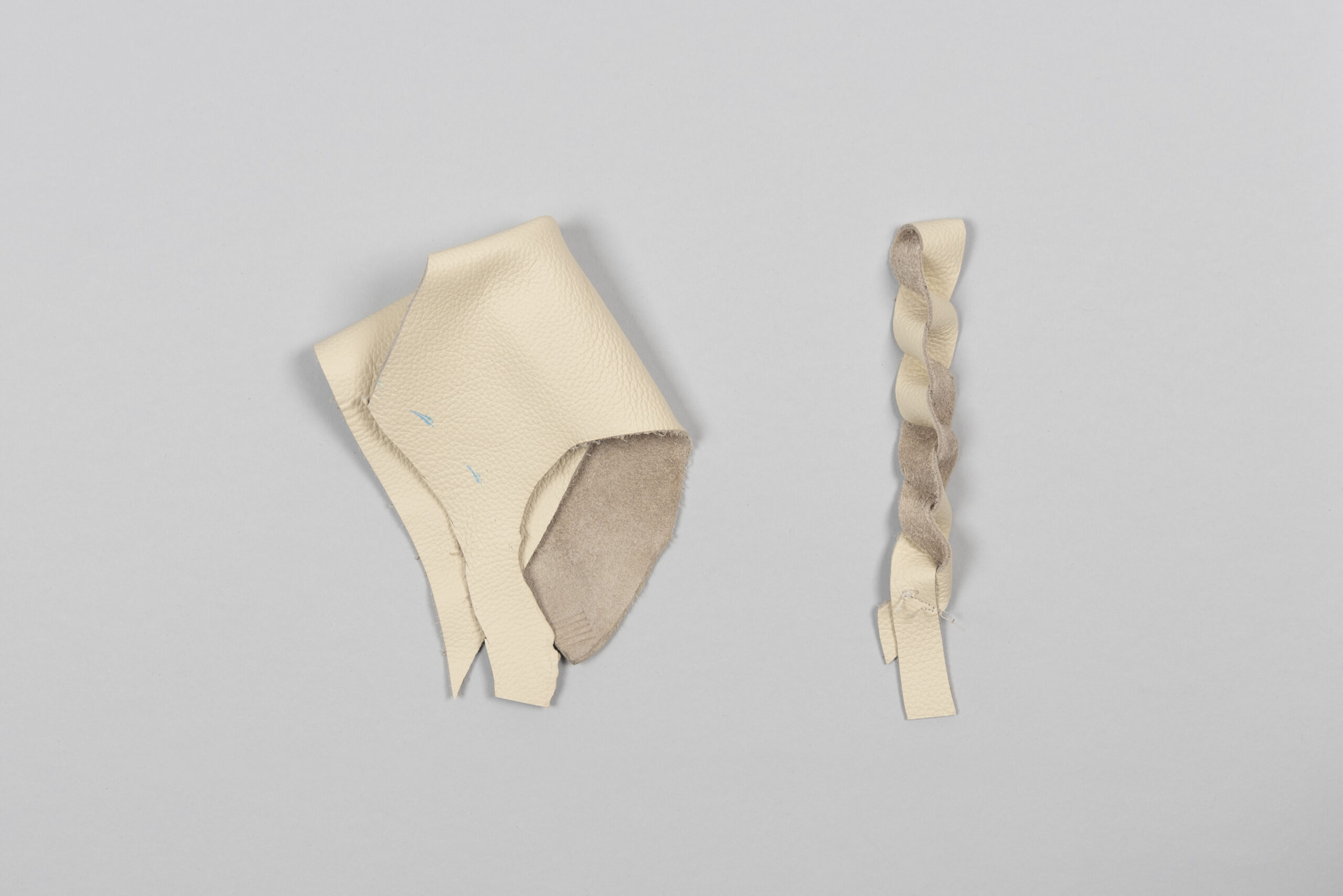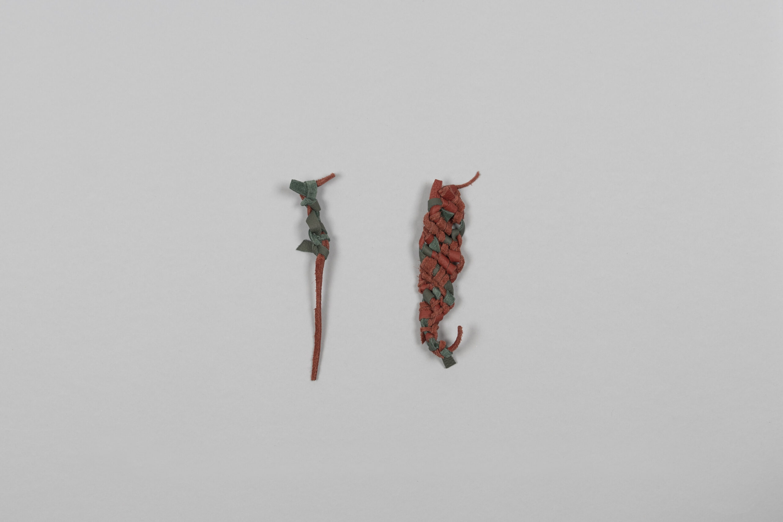 Vertical strips of suede fabric were cut by hand and then braided together with the knotting technique. In the second example, verticle lenghths of thick upholstery fabric were cut and then braided together with the knotting technique.