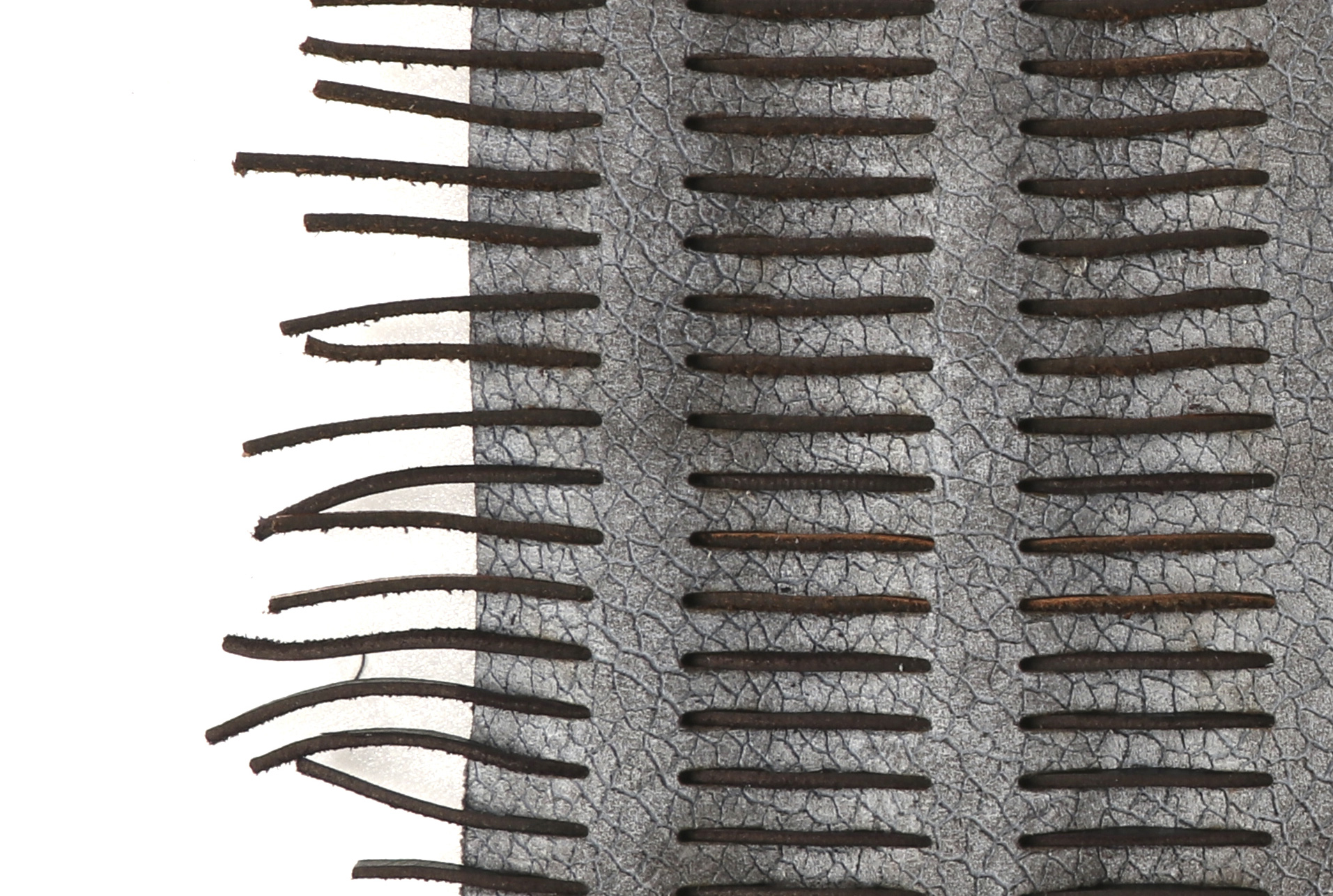This sample is one of the series of many in the exploration of how a few textile parameters may influence variations of material aesthetics: leather being the consistent material, four colours, cutting and weaving as techniques as well as variations of the stripe as a visual idiom throughout the series of samples.