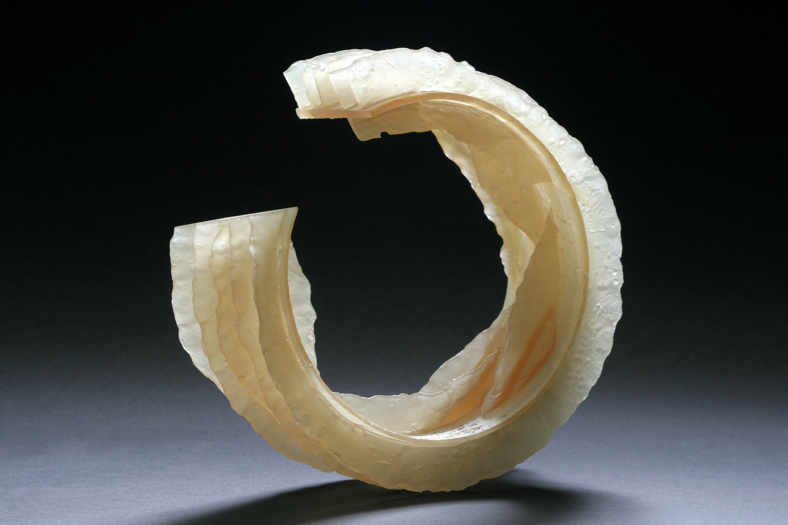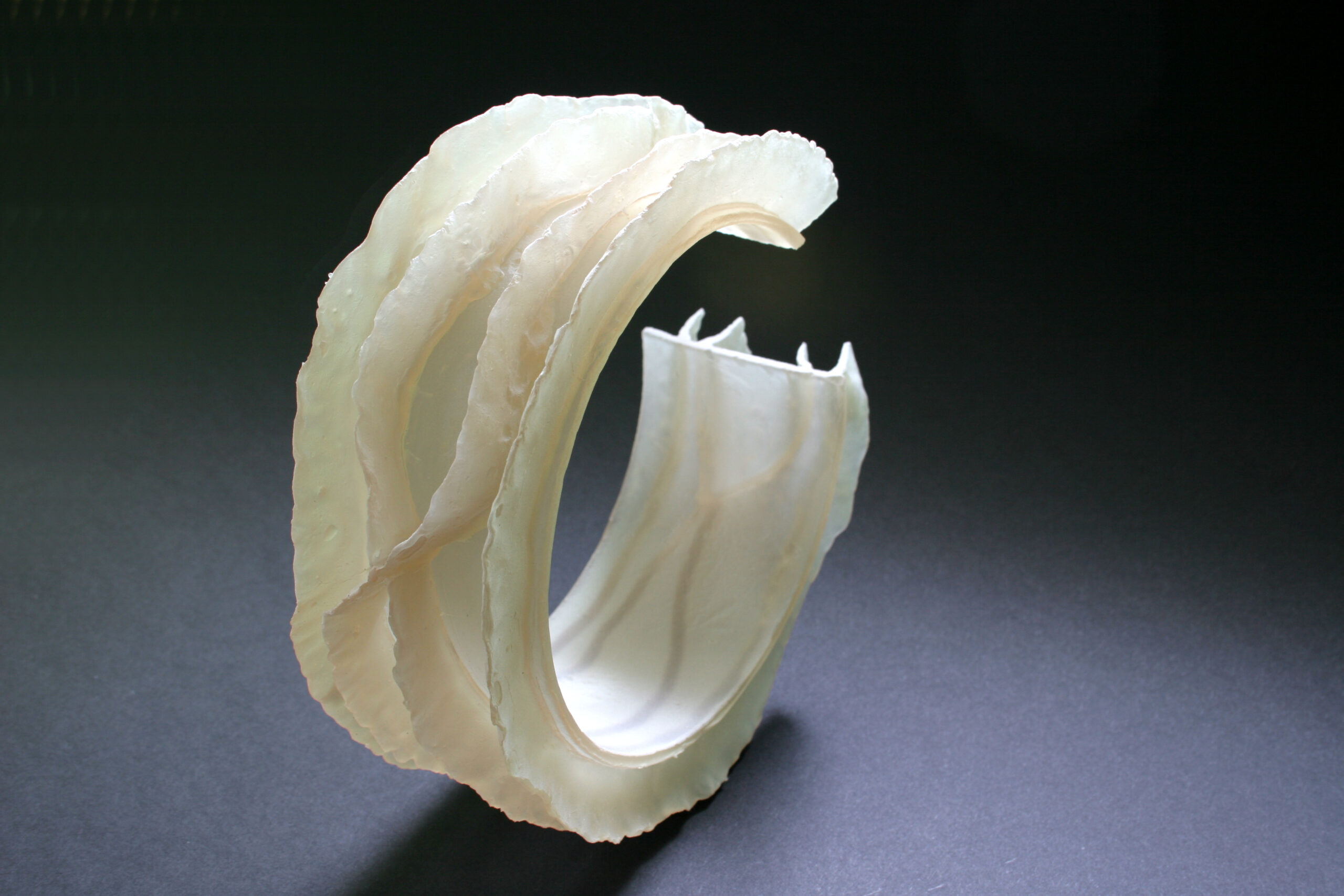 The shape was modelled in wax which was then invested in refractory plaster. The mould was then steamed to melt out the wax, leaving a void in the mould where the wax once was. The mould was then placed cold into a kiln, with cold glass placed in a reservoir in the mould. It was then heated in a mould, melting the glass so it could flow into the void within the mould, taking up the shape of the model. After firing, the glass was carefully removed from the mould, cut and sand-blasted to create a frosted finish.