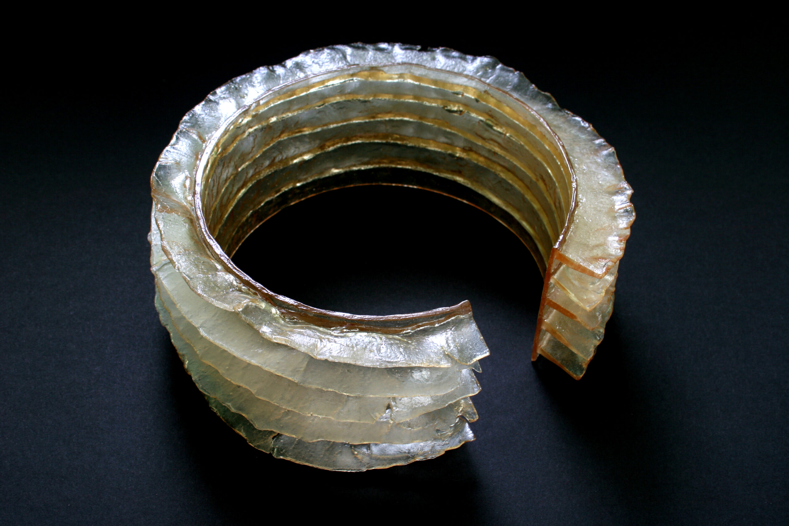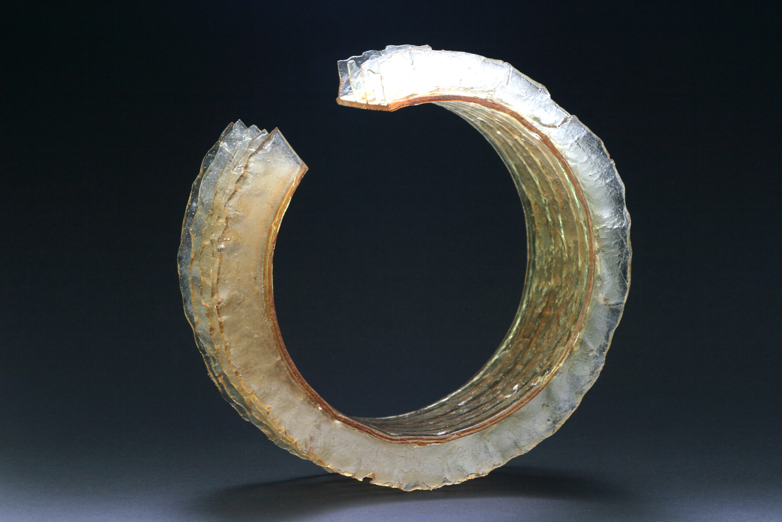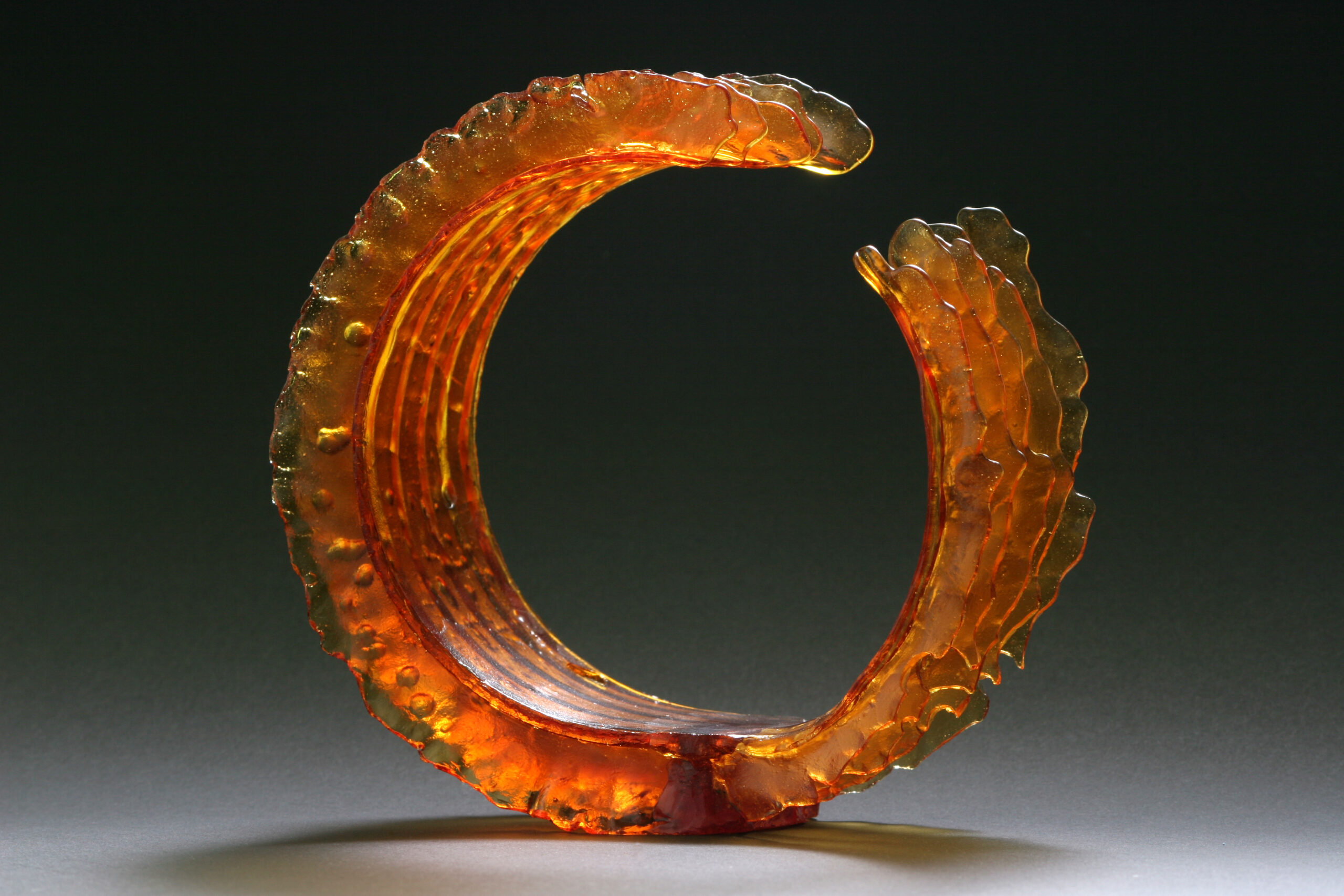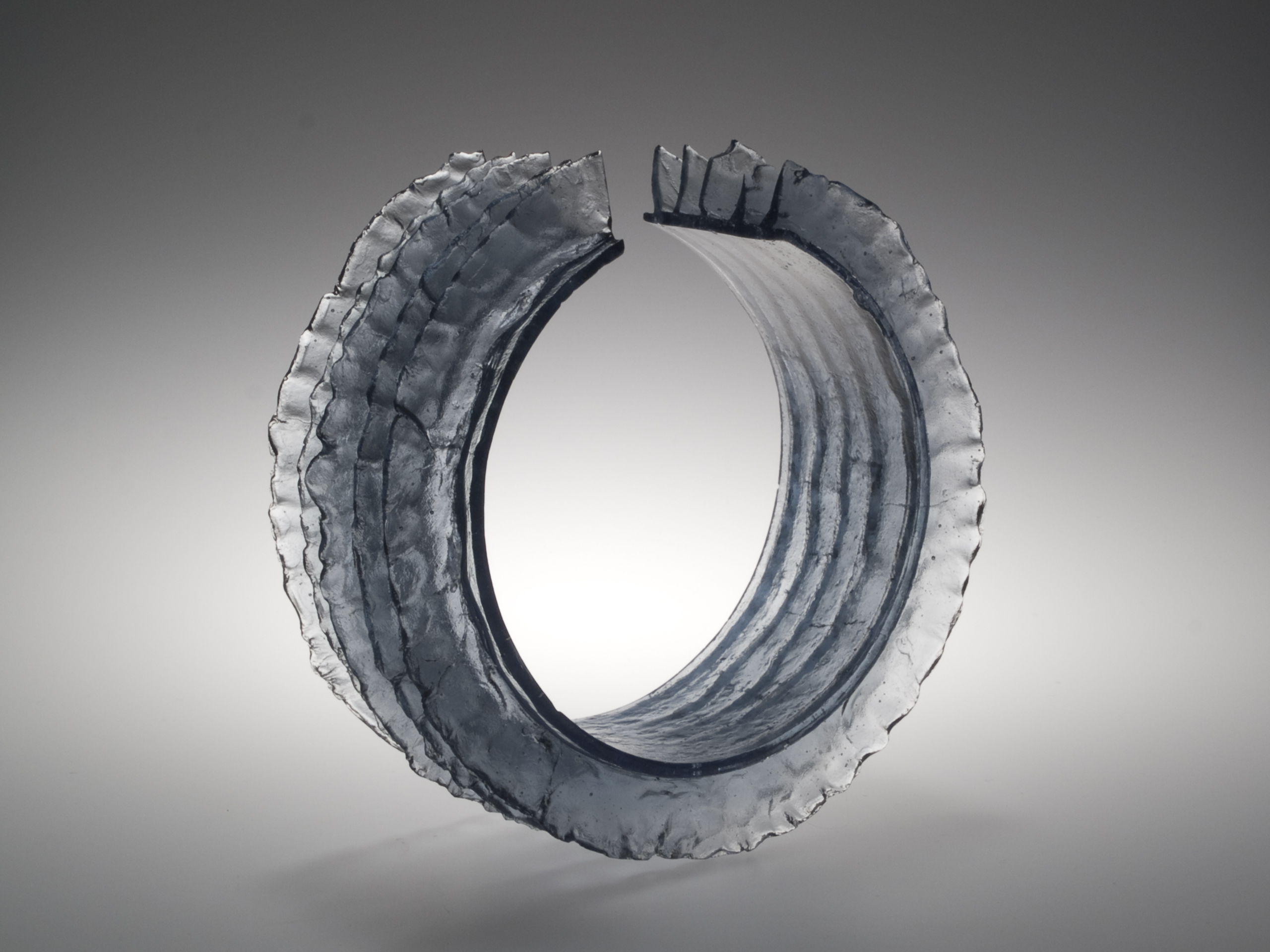 The shape was modelled in wax which was then invested in refractory plaster. The mould was then steamed to melt out the wax, leaving a void in the mould where the wax once was.  The mould was then placed cold into a kiln, with cold glass placed in a reservoir in the mould.  It was then heated in a mould, melting the glass so it could flow into the void within the mould, taking up the shape of the model.  After firing, the glass was carefully removed from the mould, cut and sand-blasted, then acid polished to create the desired surface finish.