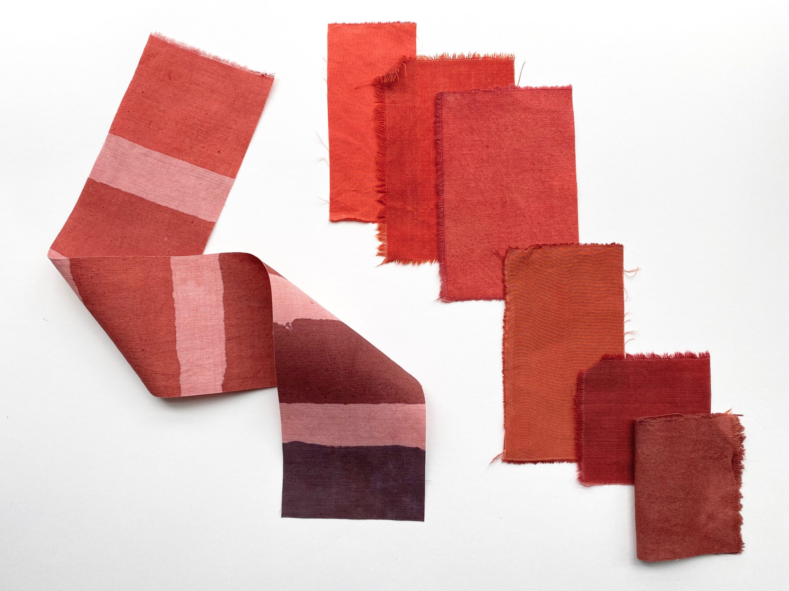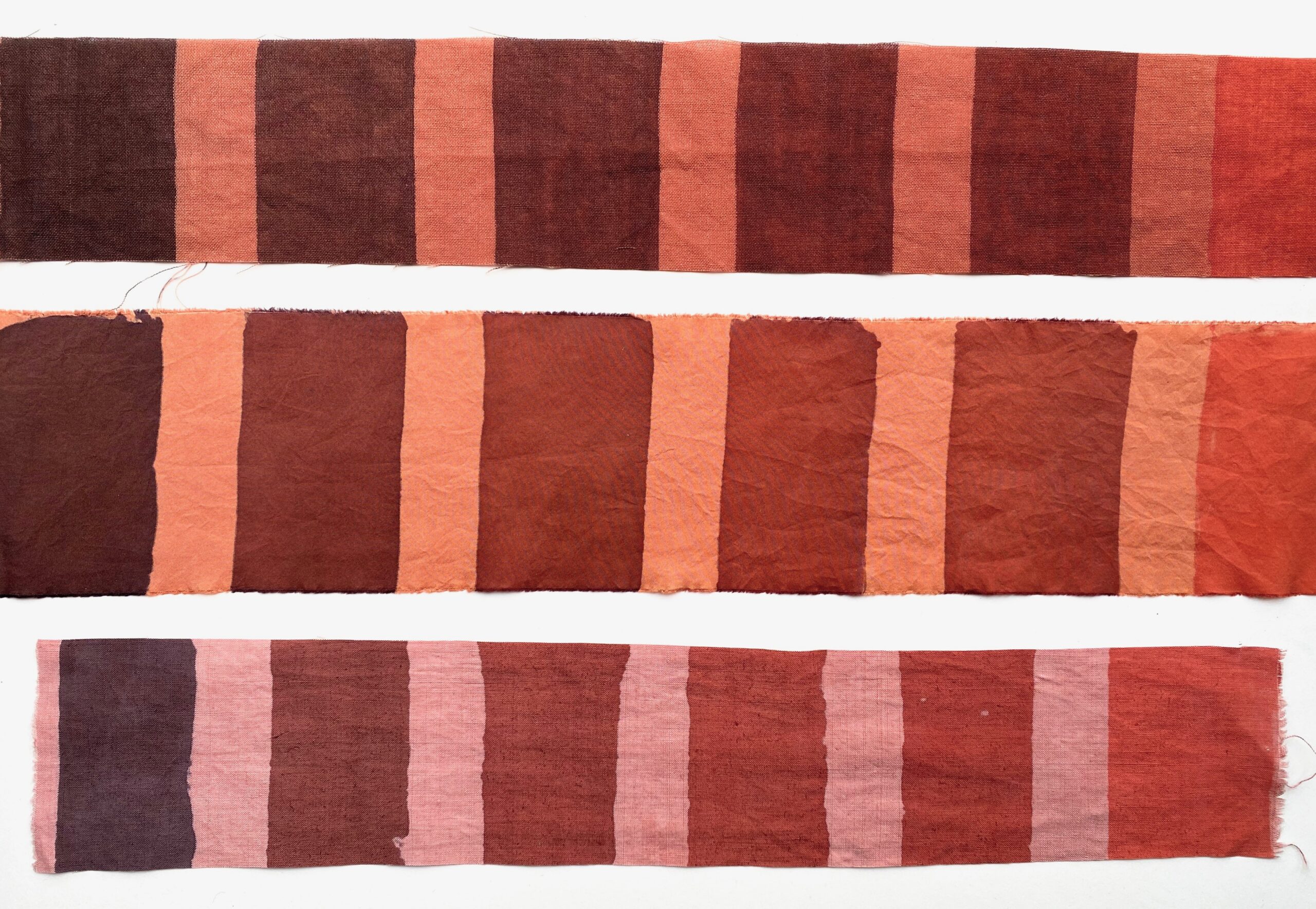 Mordant test strips on un-mordanted wool, silk and cotton painted with aluminium potassium sulfate (alum) mordant paste, alum and ferrous sulfate mordant paste combinations (95:5, 90:10, 80:20, 50:50 ratios) and ferrous sulfate mordant paste. Fixed with wheat bran and calcium carbonate. Dyed with Madder @ 100% WOF (weight of fibre).