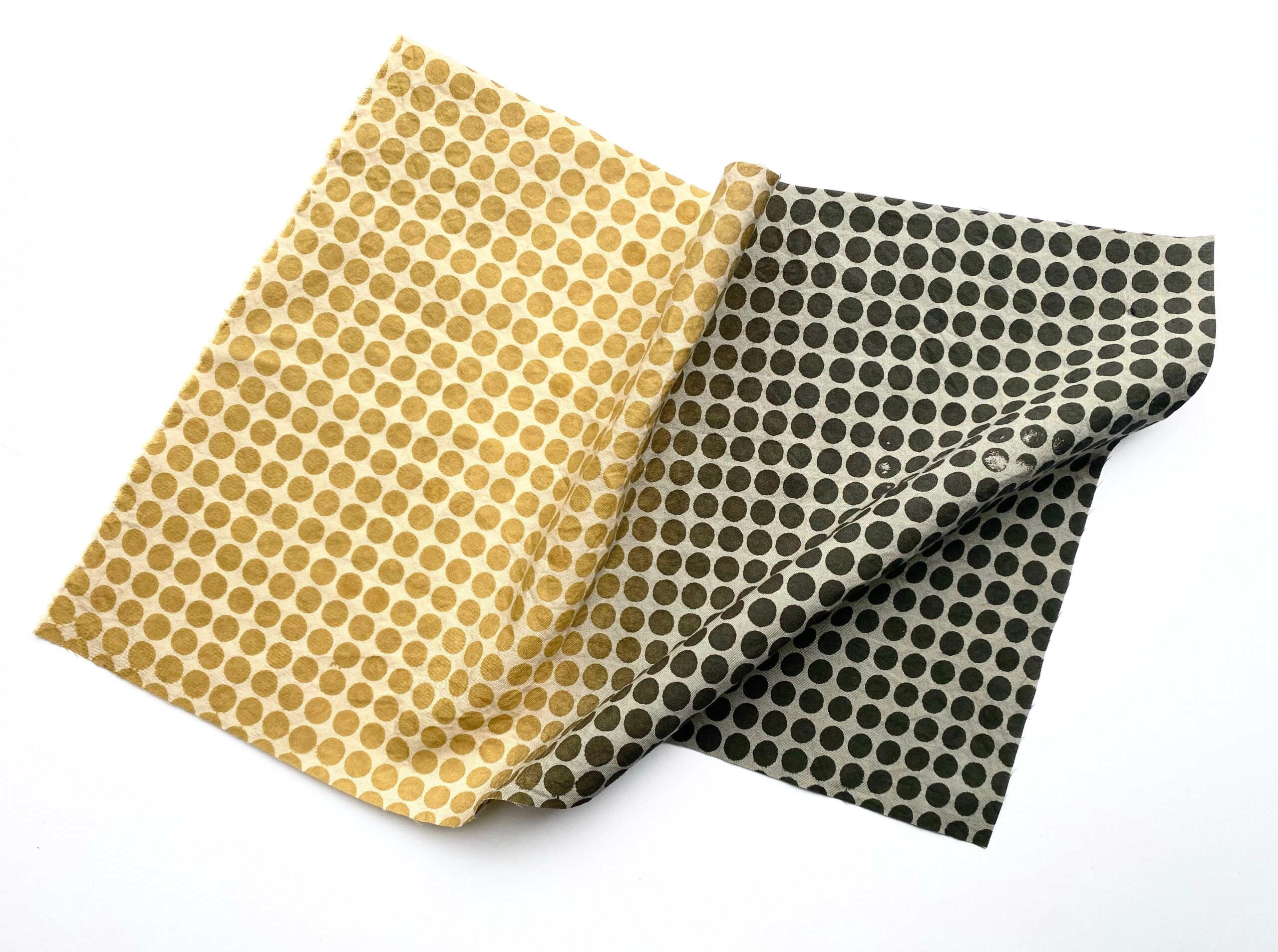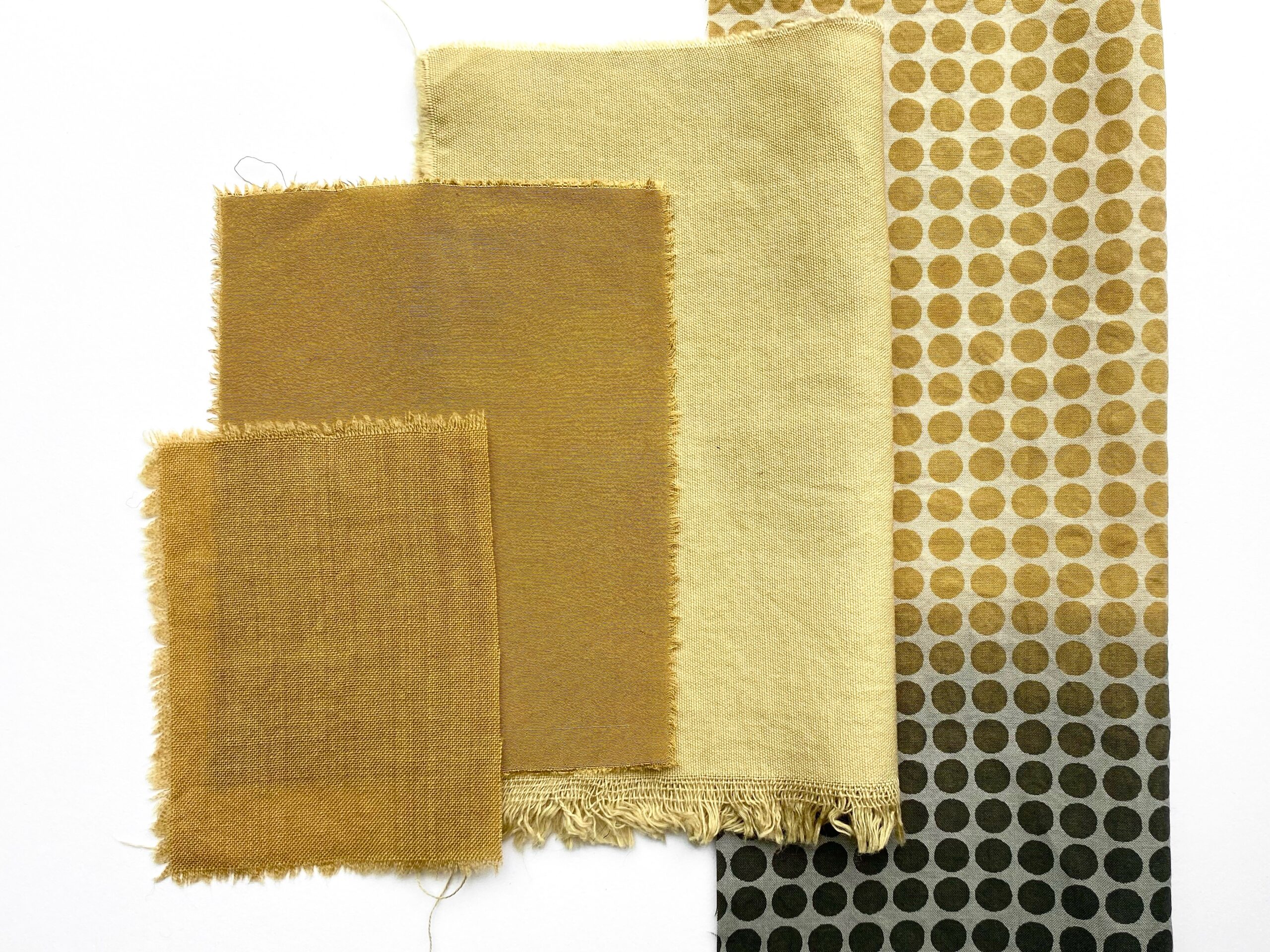 Un-mordanted cotton screen printed with aluminium potassium sulfate (alum) mordant solution. Dyed with Pomegranate rind dye bath @ 300% WOF. Gradient post modification with ferrous sulfate @2% WOF (weight of fibre).