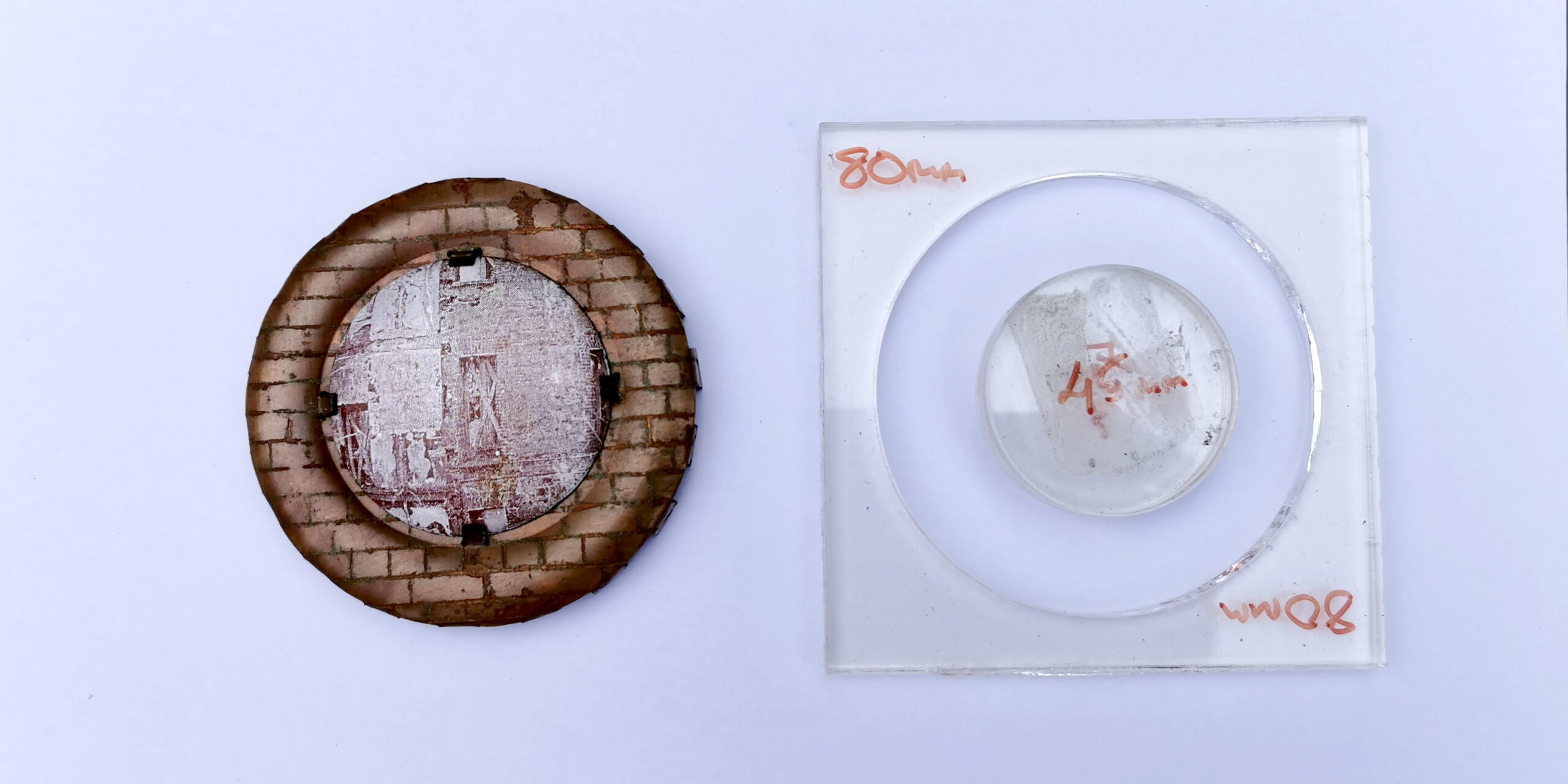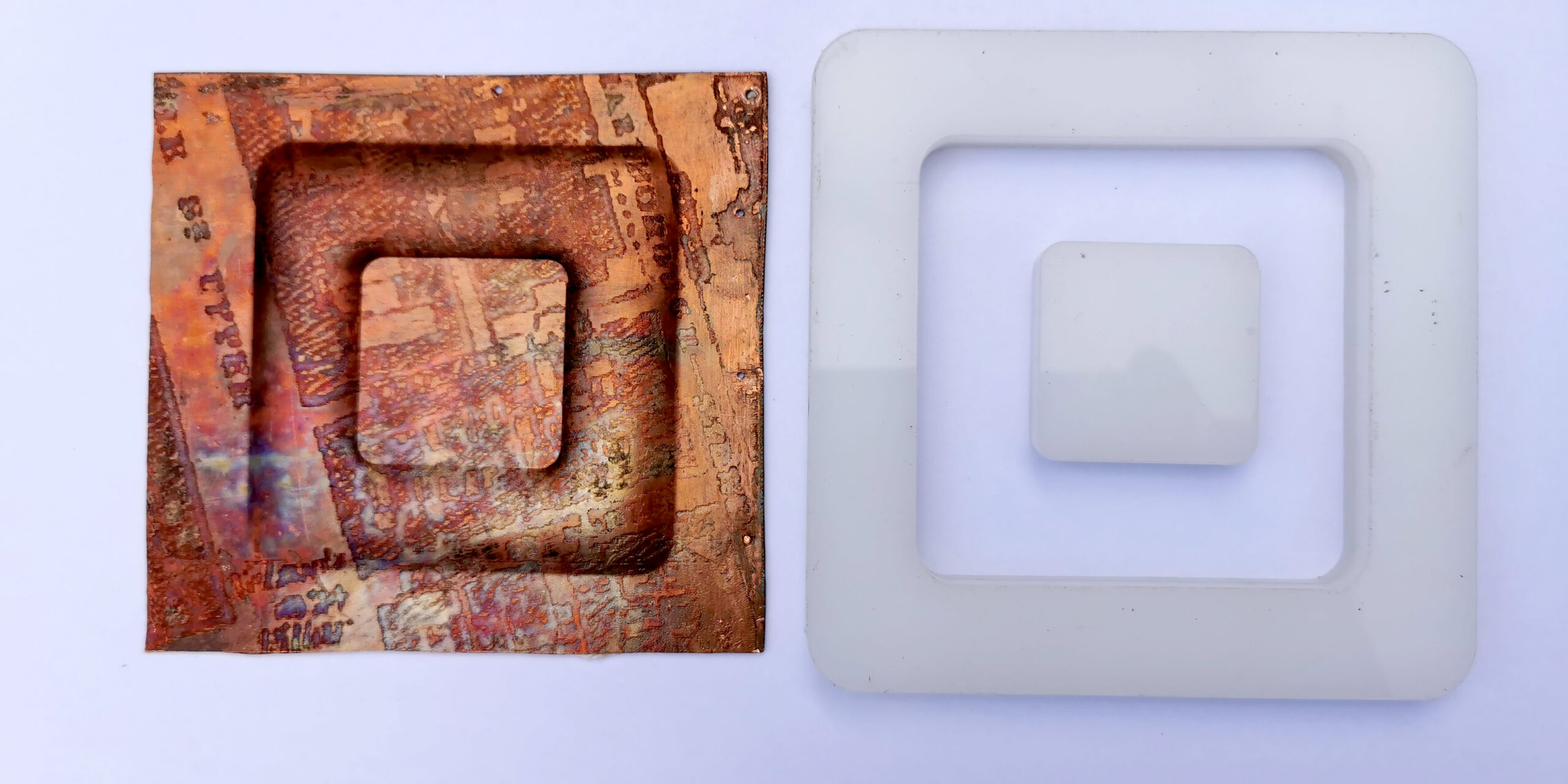 The samples given of press forming are all made from .7mm copper sheet. A texture has been acid etched into the surfaces, before they were press formed, or they were enamelled after being press formed. The method of press forming uses pressure to manipulate and stretch metal into pre-made forms. In the case of the samples the pressure was applied using a Fly press and the premade forms where laser cut perplex.