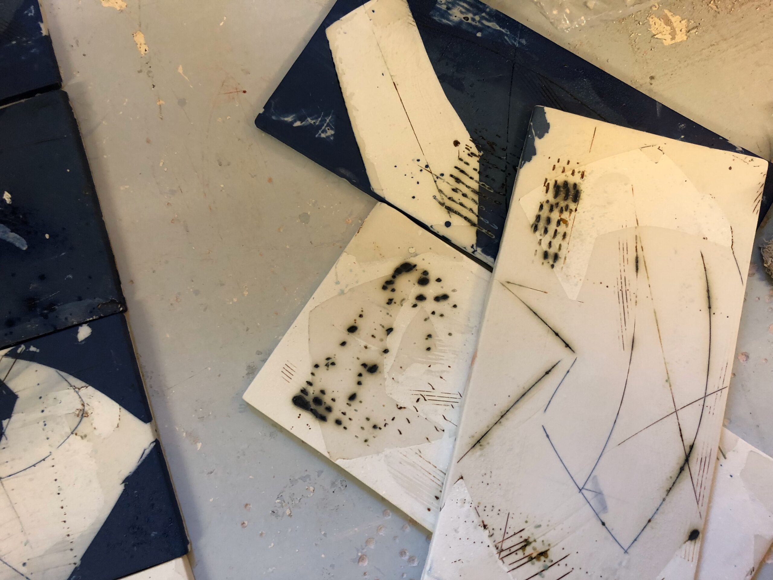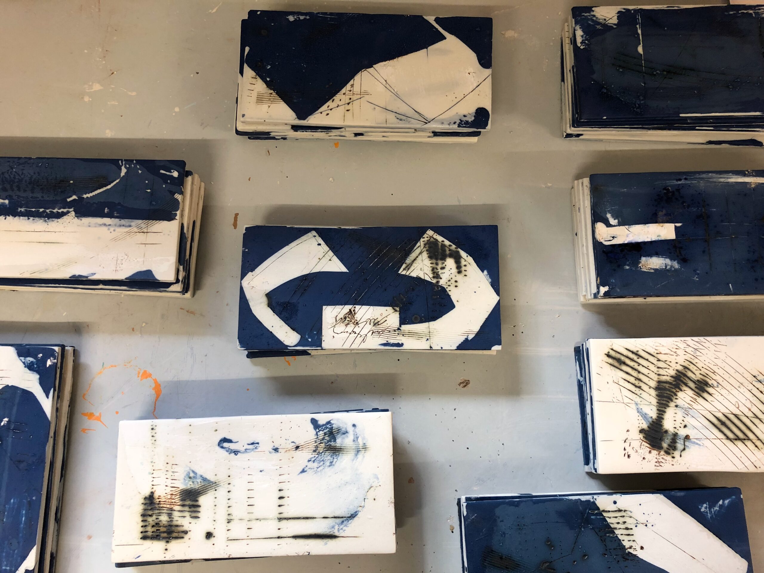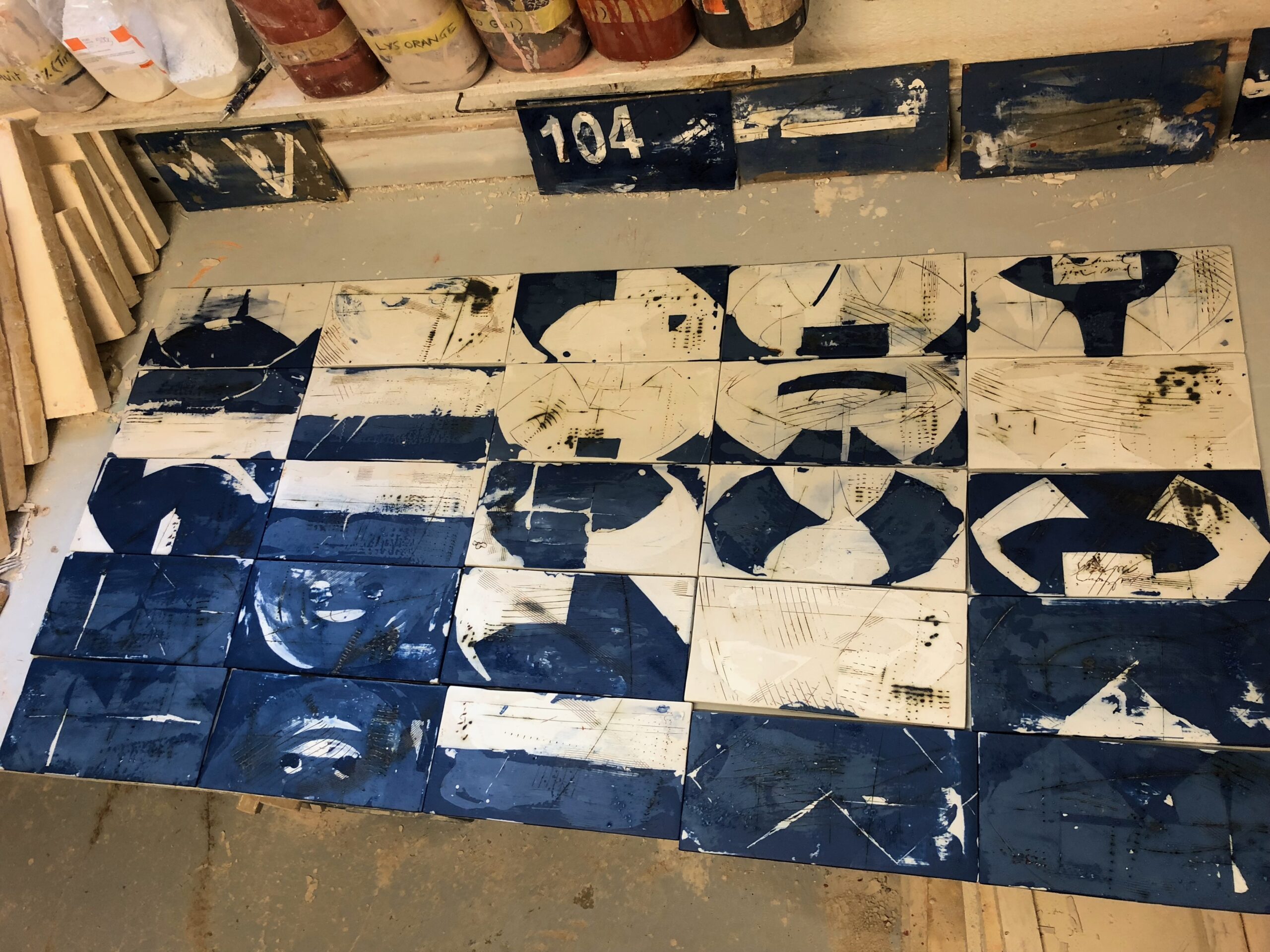 A work from the project: Puzzle work, consist of a series of tiles with motifs of blue and white shirt collars, in abstracted forms, made into an ornamental structure.