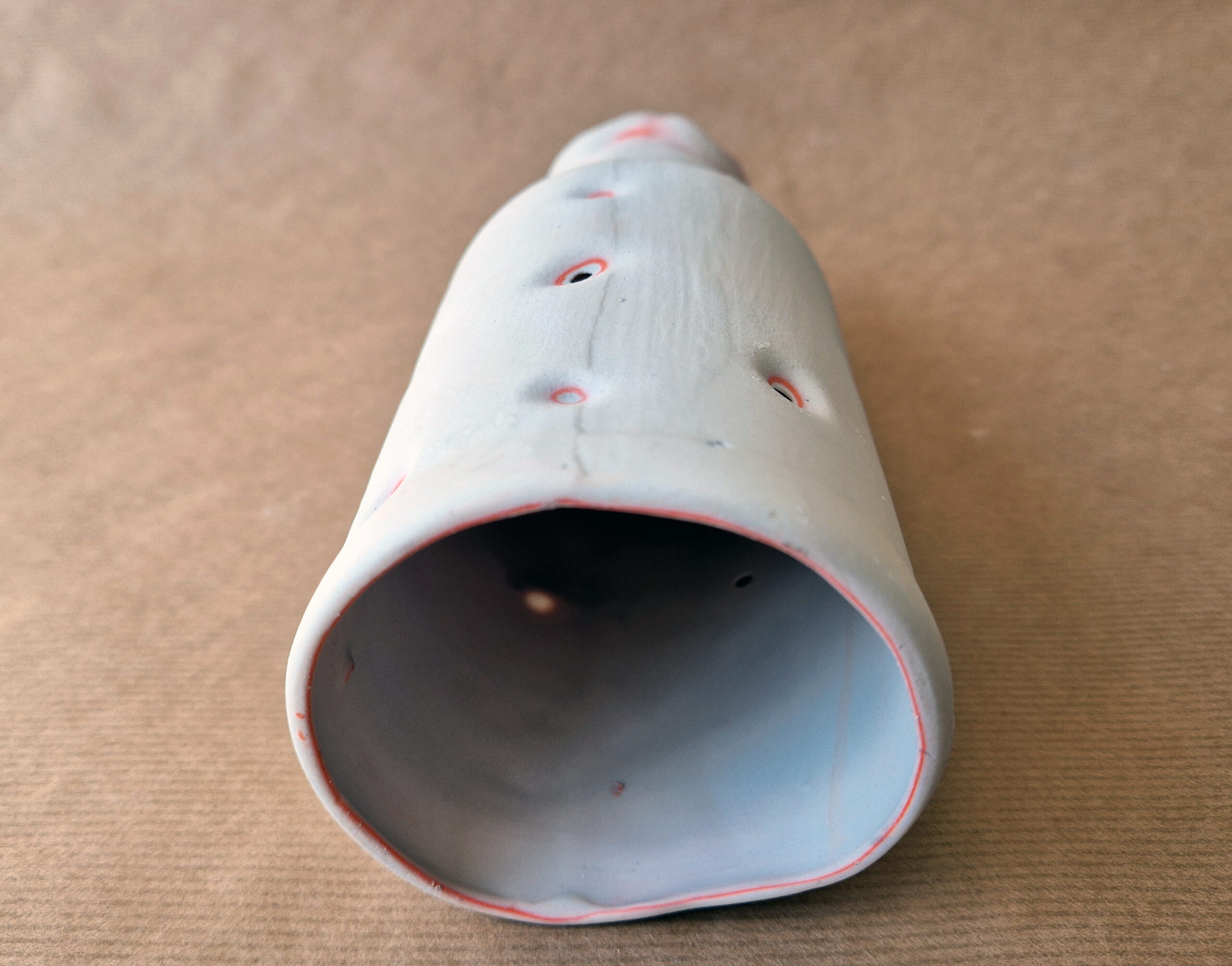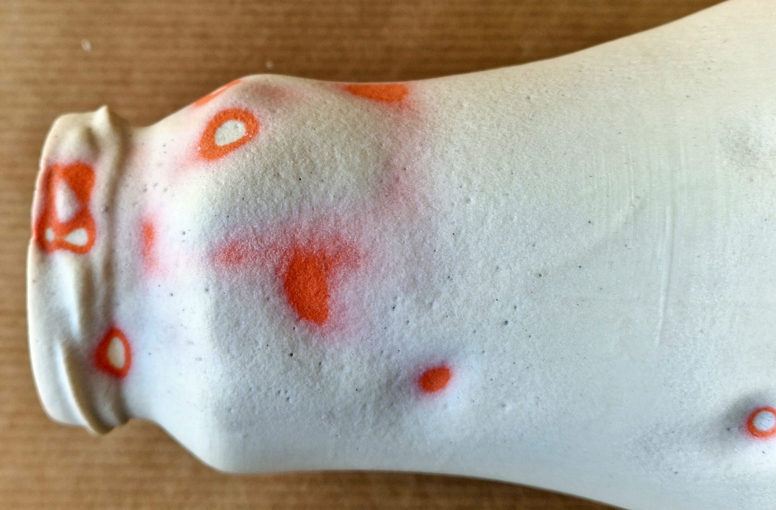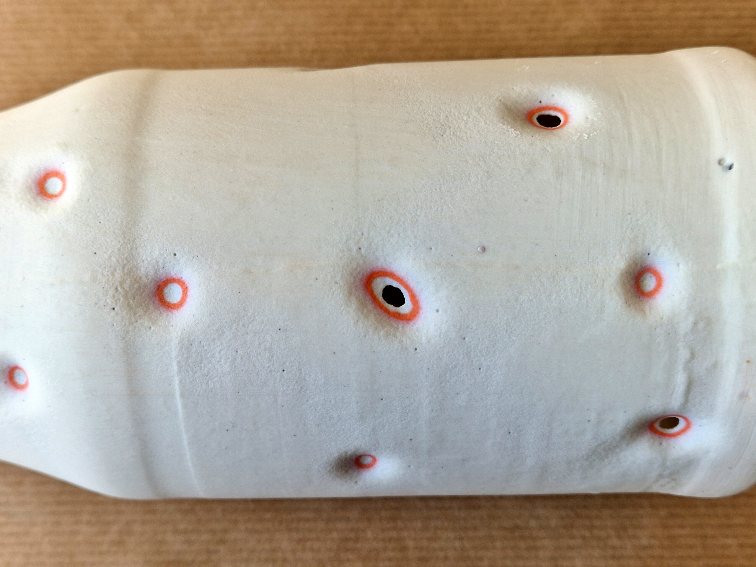 The hollow shape test sample is cast with porcelain slip in a plaster mould. First a layer of white clay is cast and drained. Secondly a layer of orange coloured engobe is cast when the first layer has set for a while. Thirdly a layer of white clay. The piece is fired to sintering at 1220°C.