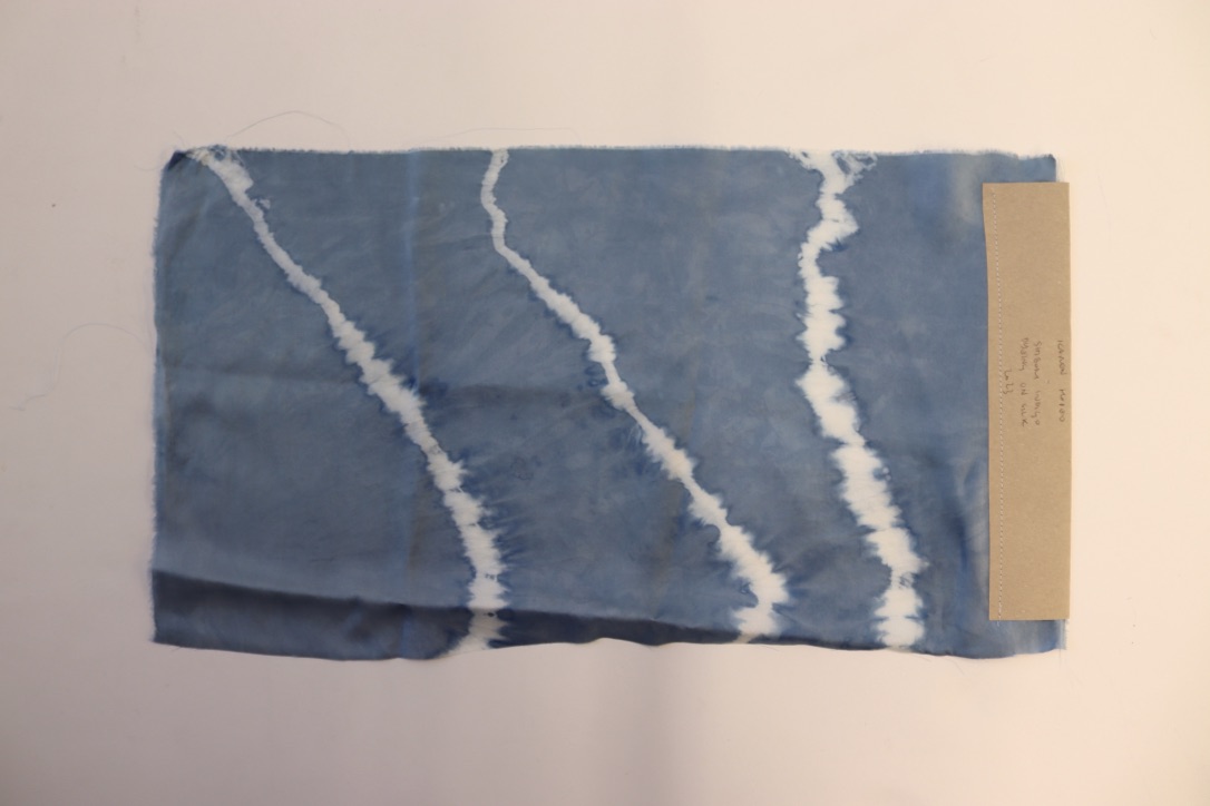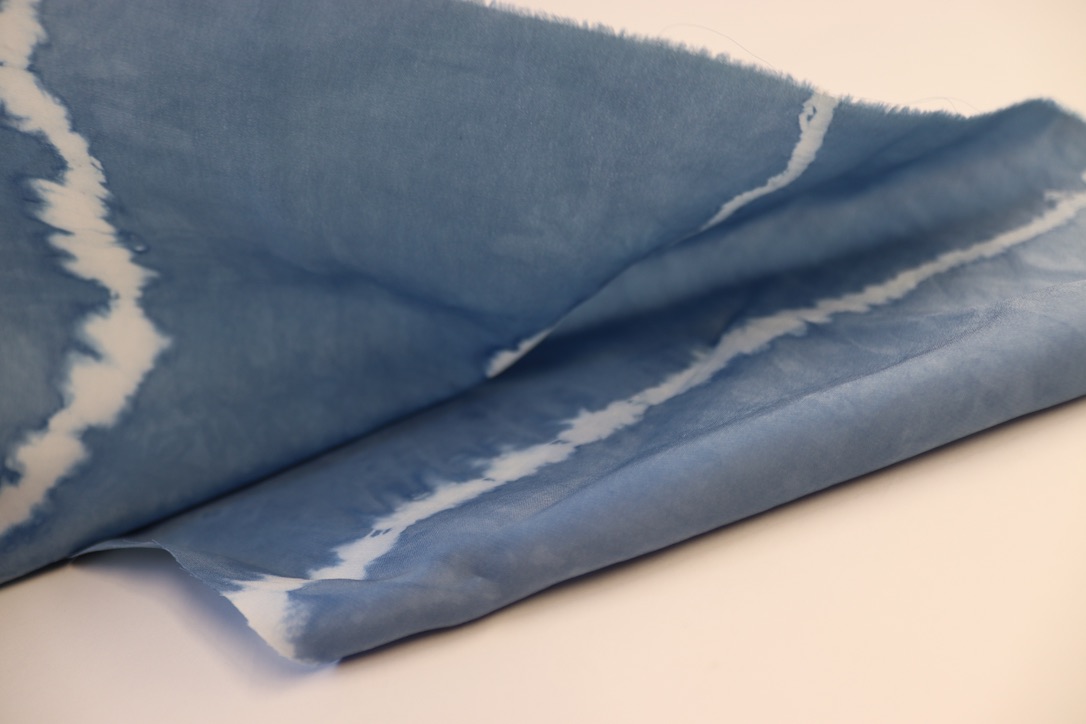 Silk “crepe de chine” dyed with a natural indigo vat using a reserve technique known as “Shibori”