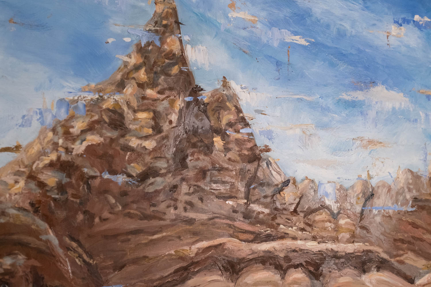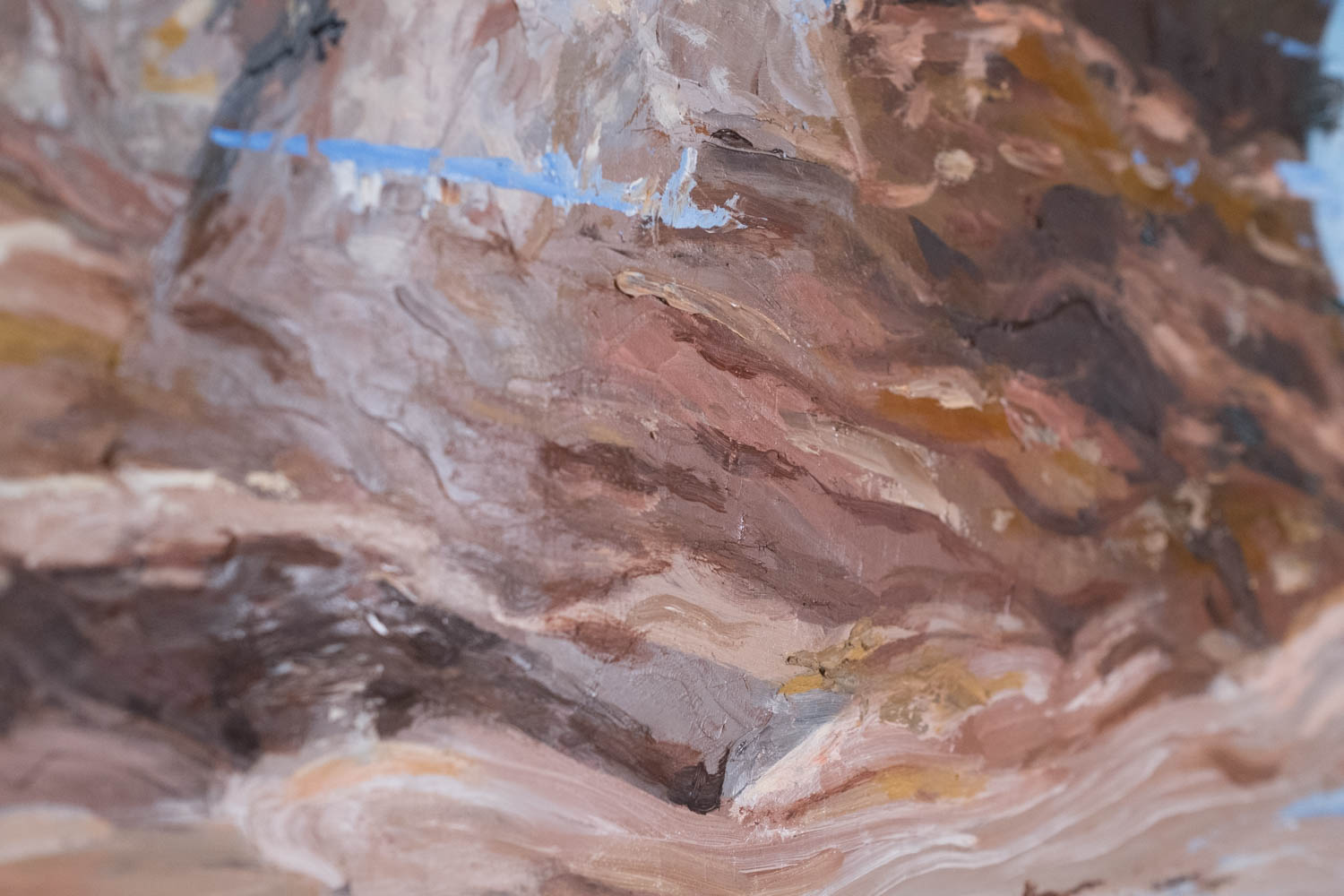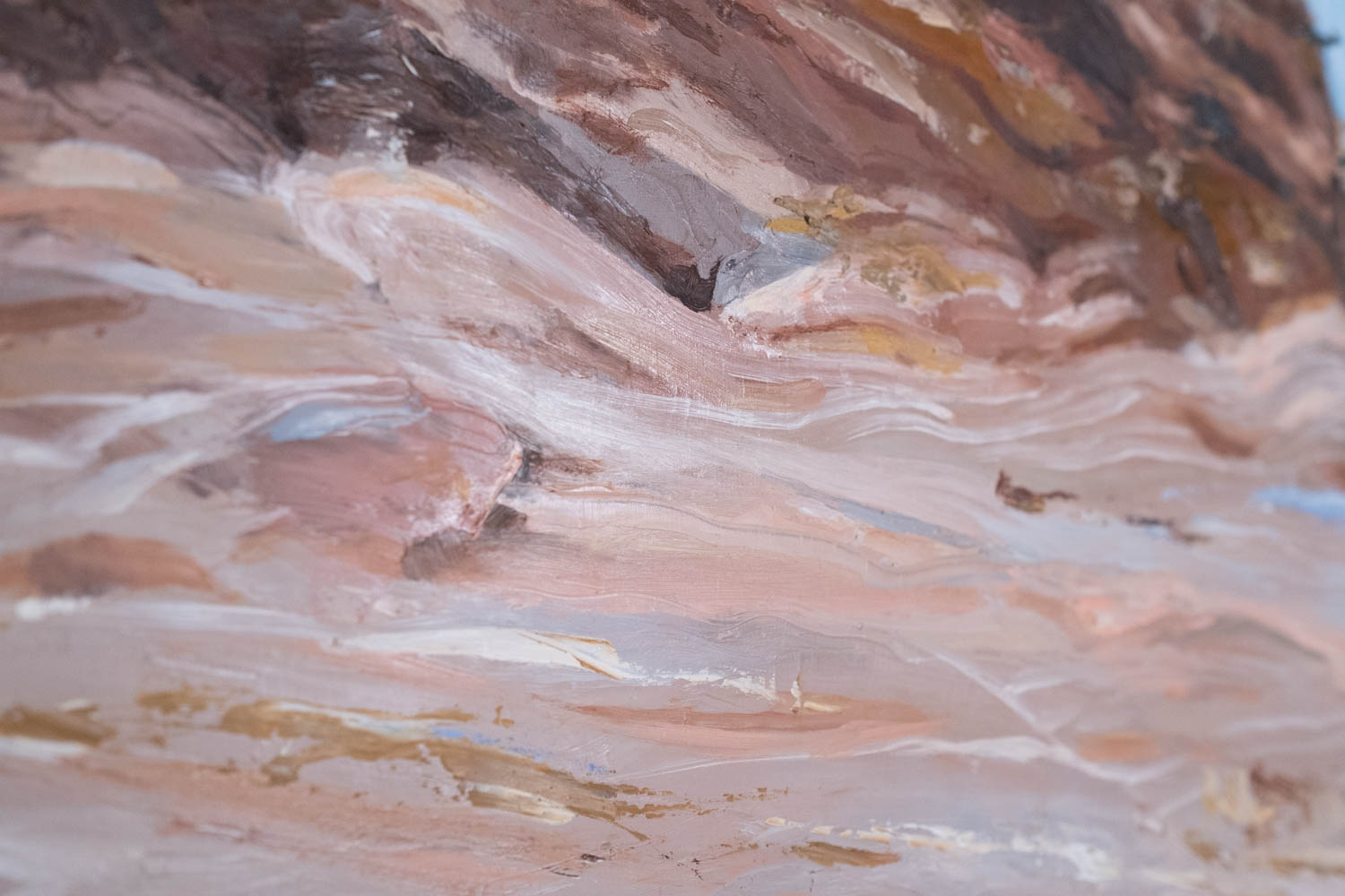 I loved transferring the wonderful pinkish colors of the rock, the streaks with a marble effect and the ripples with darker, stronger colors to canvas.