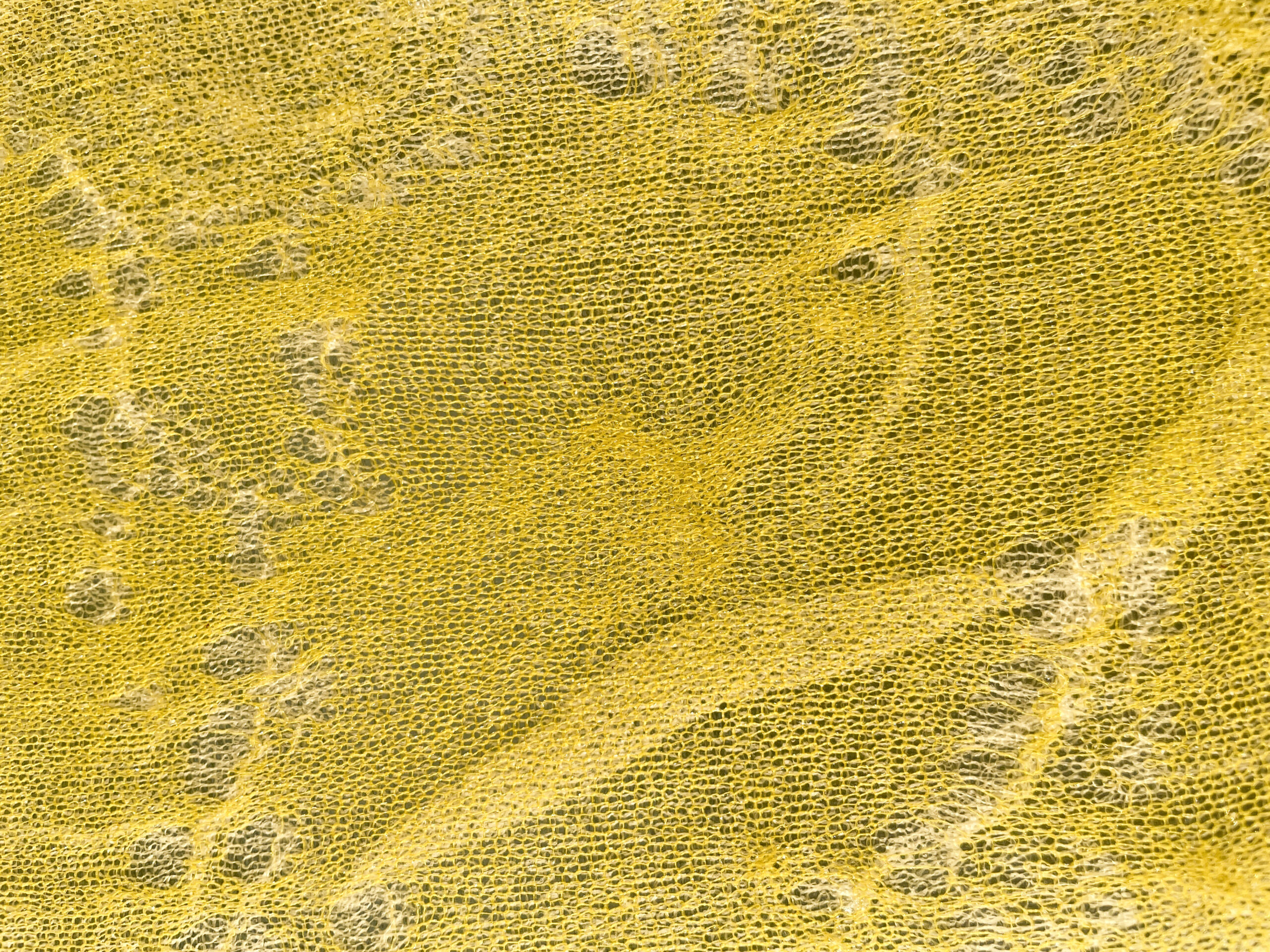 Double jacquard fine knitting in silk/viscose yarns creating a two-layered structure.