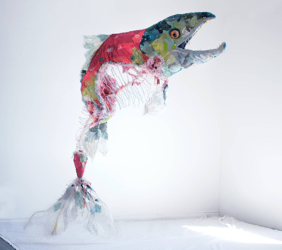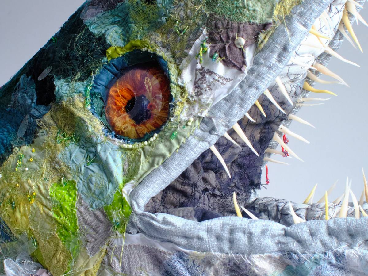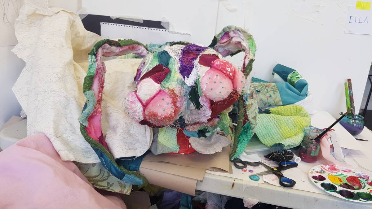 | I am passionate about the potential of easy to access, sustainable materials. I am a material lead maker. I often find an old shirt in a charity shop, or piece of recycling in the bin and let the material lead me to what it wants to become. In the fish soft sculpture above, the eye is the top of a slushy cup I found on the side of the road and I knew it wanted to be the glazed over eye of a dead fish. I believe that textile crafts matter for a number of reasons. Textile crafts of all types, embroidery, lace making, weaving, they are all or have all been seen as less skillful, less expressive or less worthy because they were classified as “women’s work”. I believe that the continued use and development of textile art is important because the stigma surrounding textile craft has caused less people to explore and develop the craft. The materials I like to use are varied. I am fascinated with fabric of all kinds and the potential they hold, I also like to incorporate found materials such as glass, plastics, natural materials such as bones, leaves, sticks, stones, shells. I love using used clothing especially, I love the idea that this item of clothing had life before I found it, and that I can lengthen that life. |