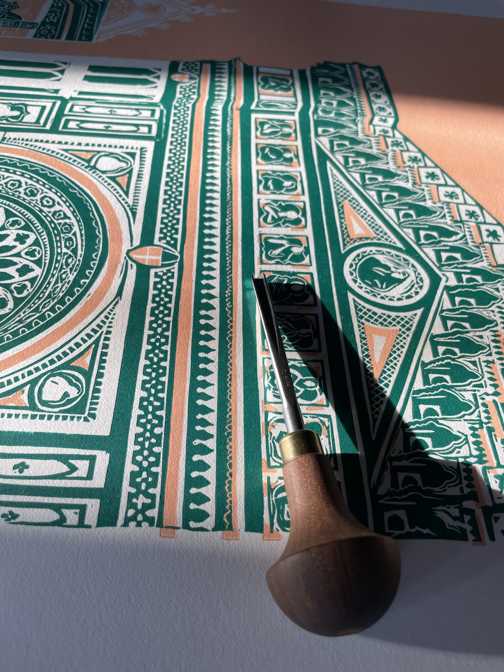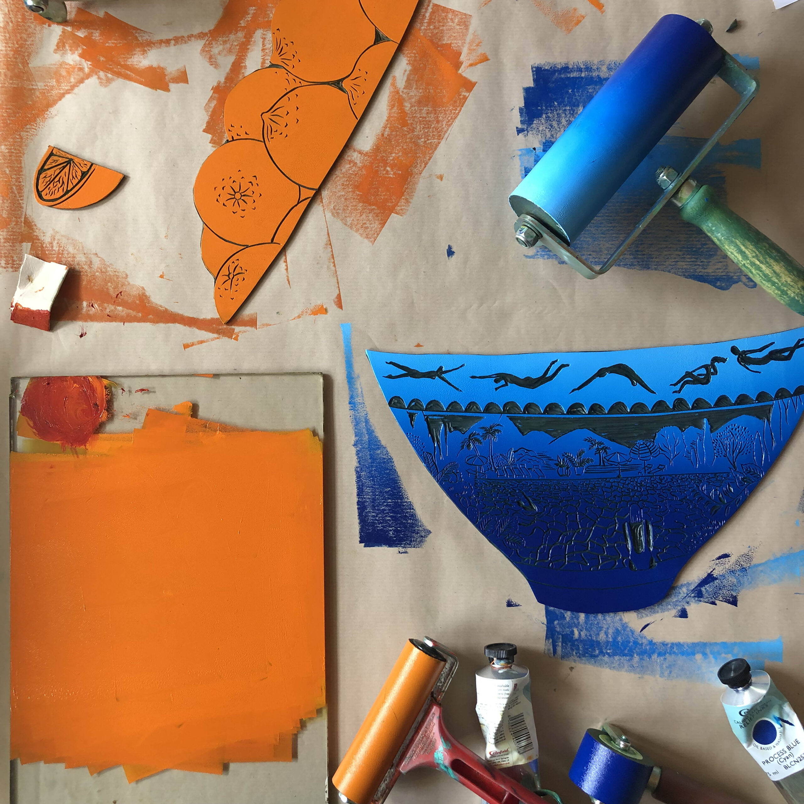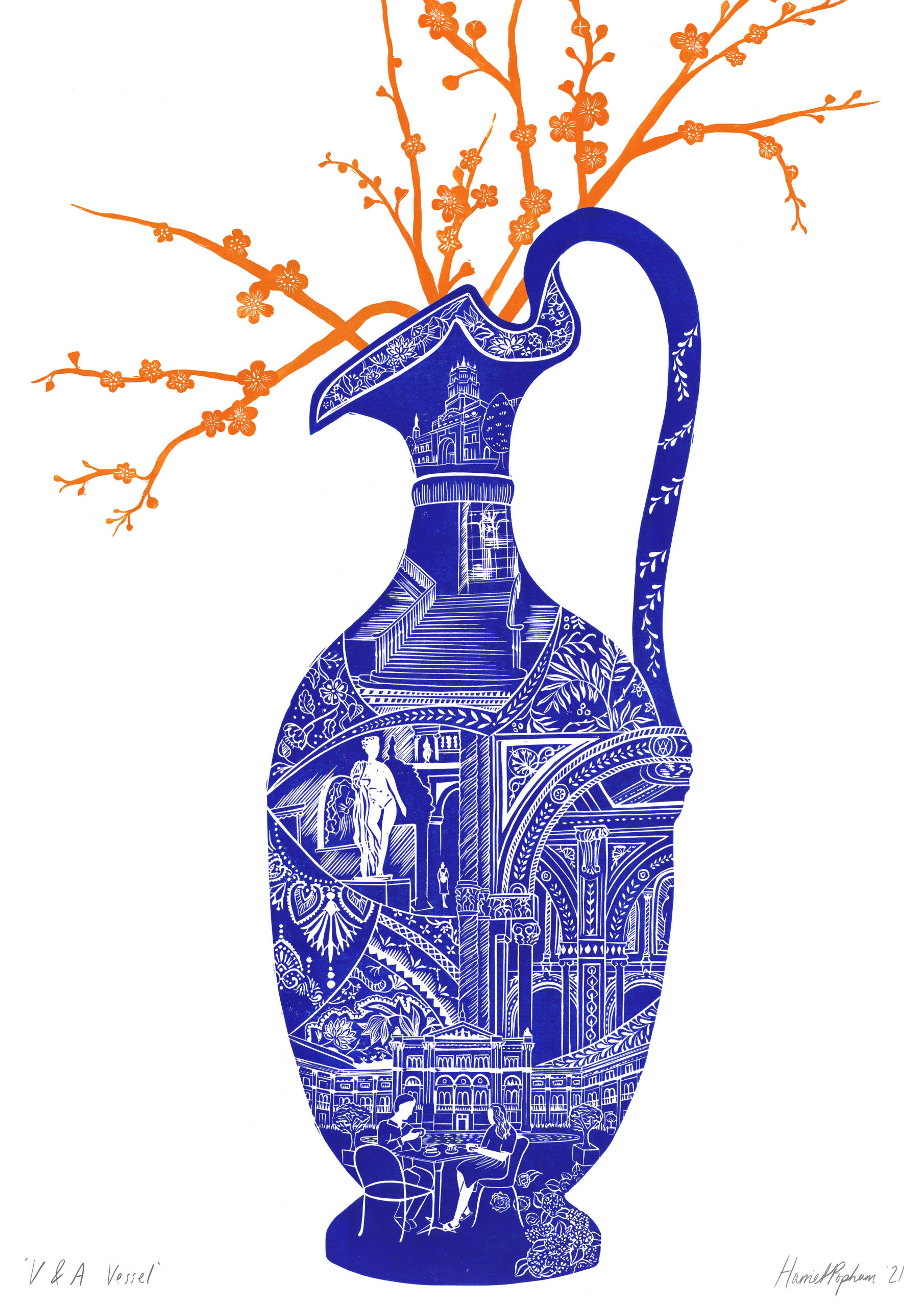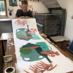 I make illustrative linocut prints that celebrate places and moments in time, often a collection of scenes woven together within the silhouette of a vessel. I enjoy creating prints with a puzzle piece approach – inking up individual blocks of lino in bold contrasting colours, slotting them together and printing as a whole. This means my prints contain large areas of block colour – a strong base for the white intricate details. I love the process of creating linocut prints. The carving is slow and calming. I find the first time ink is rolled across the hand carved surface extremely rewarding, and those times you peel back the paper to reveal something you’re proud of still feel like magic. |