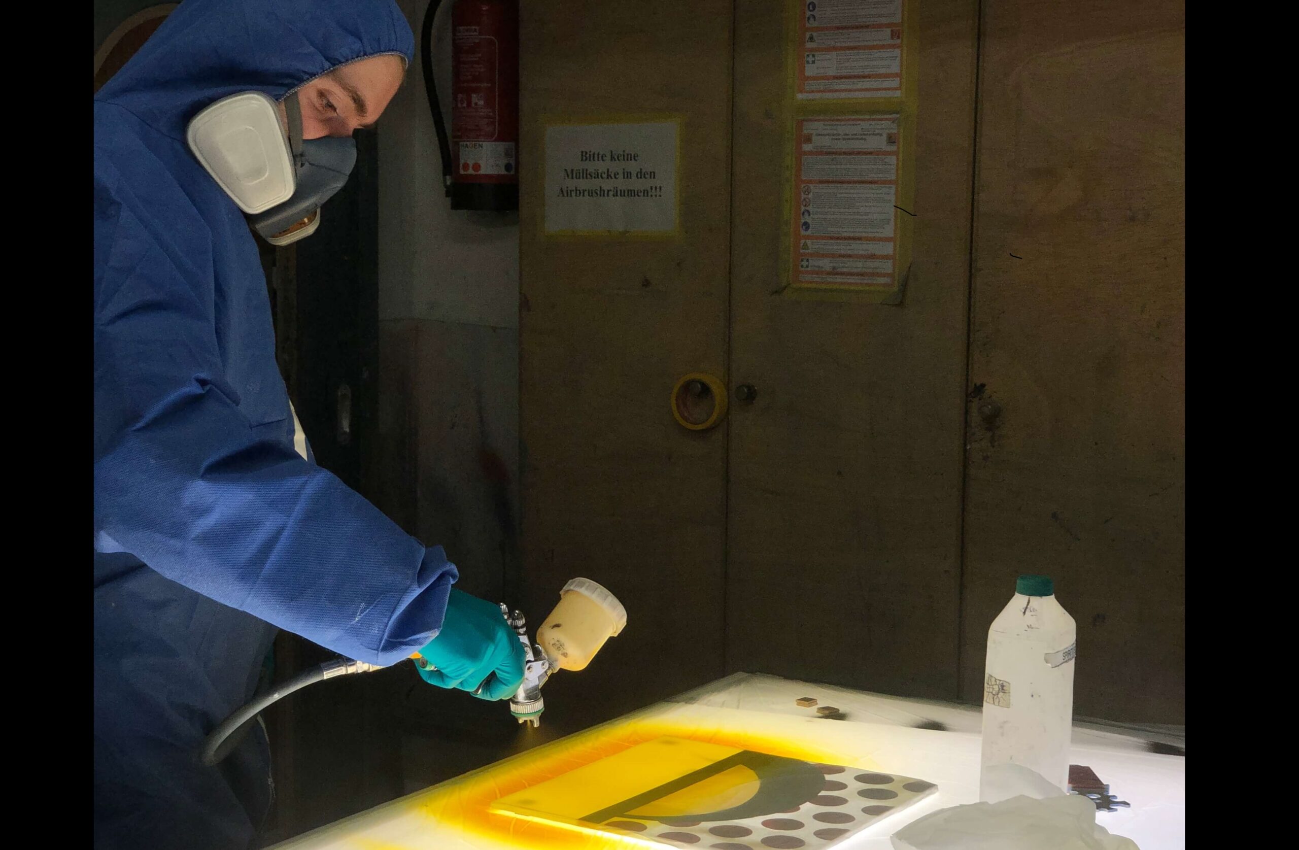 I’m allowed to use the workshop of my boss (in whose company I work in part-time), which offers all the tools and equipment that is needed for the processing of glass. My favourite tool is an airbrush-gun which allows for a large variety of different techniques like “directional” applying of colour on structured glass.