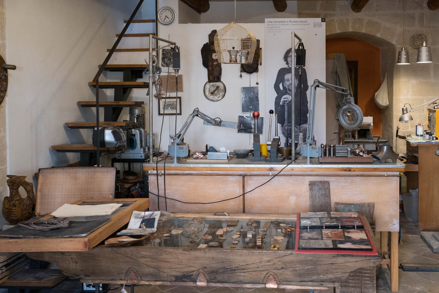 I was born in Potenza and moved to Matera from L'Aquila where I studied at the Academy of Fine Arts. Since childhood I have had a passion for drawing and art. In 98 with my partner Michele Ascoli we founded a workshop called Materia in Matera. We put together systems related to the goldsmithing tradition with forms and languages drawn from other fields such as painting, sculpture and illustration. Everything stems from a choice of sustainable living as well as a passion for creative and manual activity, so the goal is not only to create handcrafted products but through these, to give reality to an imaginary world of which the objects are an expression. The business began as goldsmithing and metalworking, but integrates the work of wood carving and sculpture, in compositions with reclaimed woods and objects. After having done the renovation of the premises sub-concessionally entrusted by the Municipality of Matera, we moved the business to its current location in the Sassi of Matera and, having found there a characteristic hypogeum room, turned it into a gallery for the periodic display of jewelry and other research crafts.I had the good fortune to start my business when there were no social media, so artistic contaminations, sources of inspiration required a much more experimental approach of study and adaptation to one's abilities than today. Thus I developed a more autonomous, less conditioned design, condensed into a certain "recognizability of style" that others report about my creations. I am careful and meticulous with respect to the creative process, which for me becomes a ritual, I love the details and everything that reveals the steps and I find this more important than the formal result. I think in these aspects lies the particularity of my method.