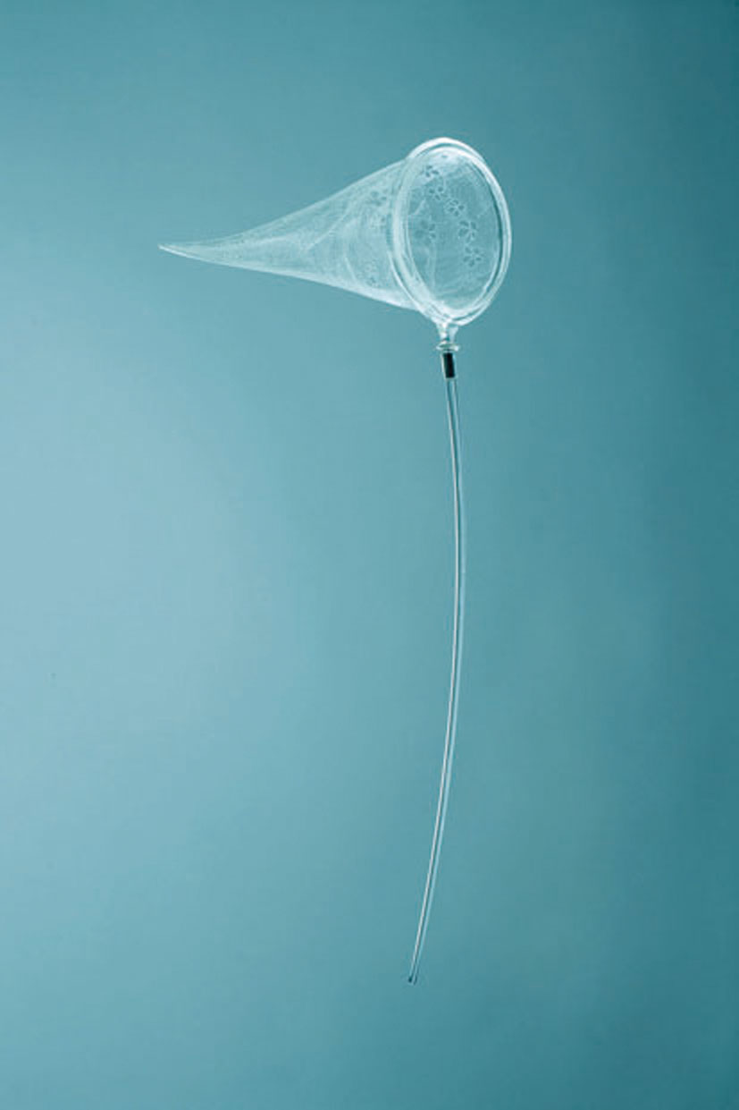 Blown glass butterfly net. Hand engraved with a diamond point, emulating a lace pattern. The glass handle is attached by a custom silver mount.